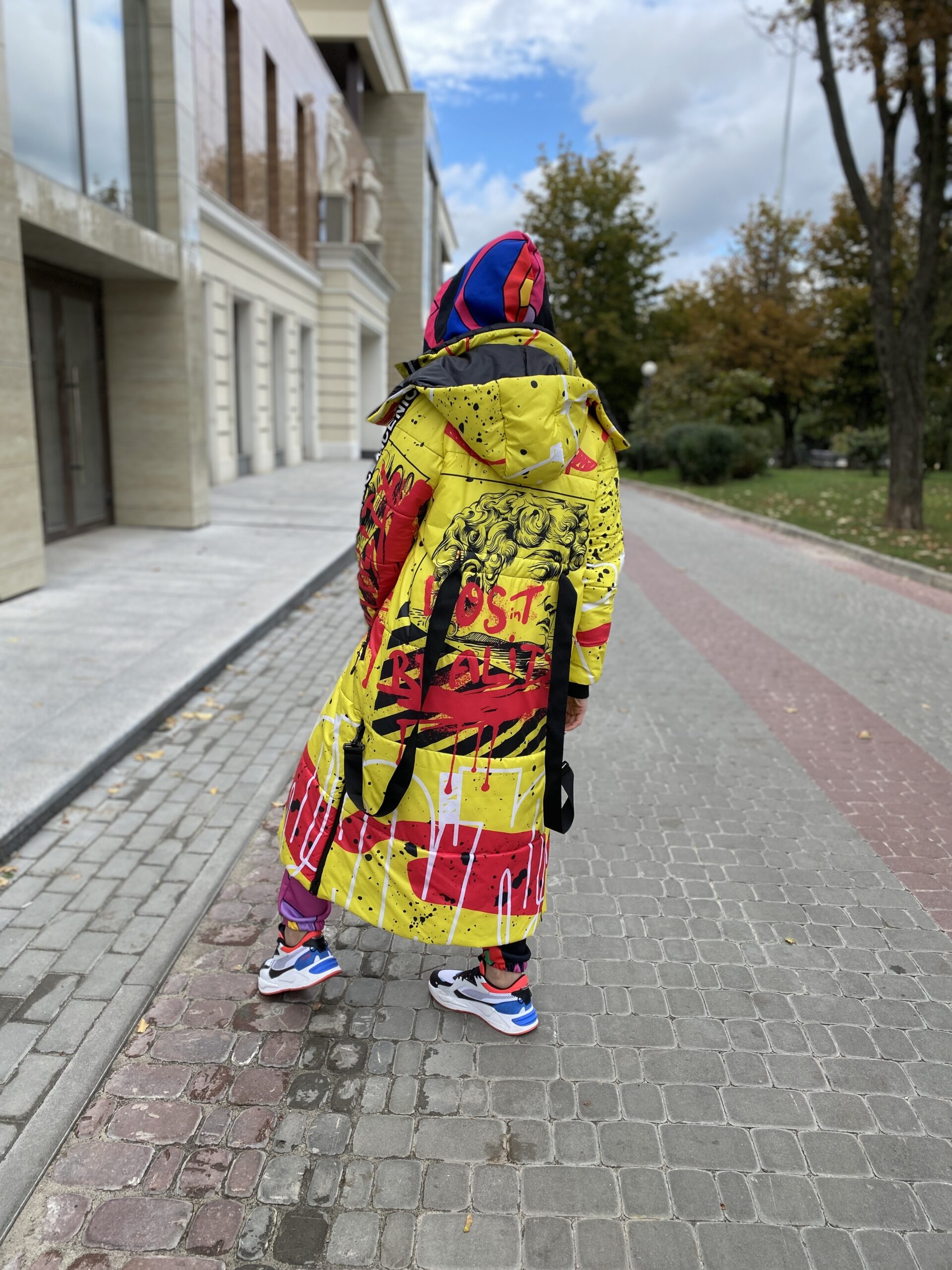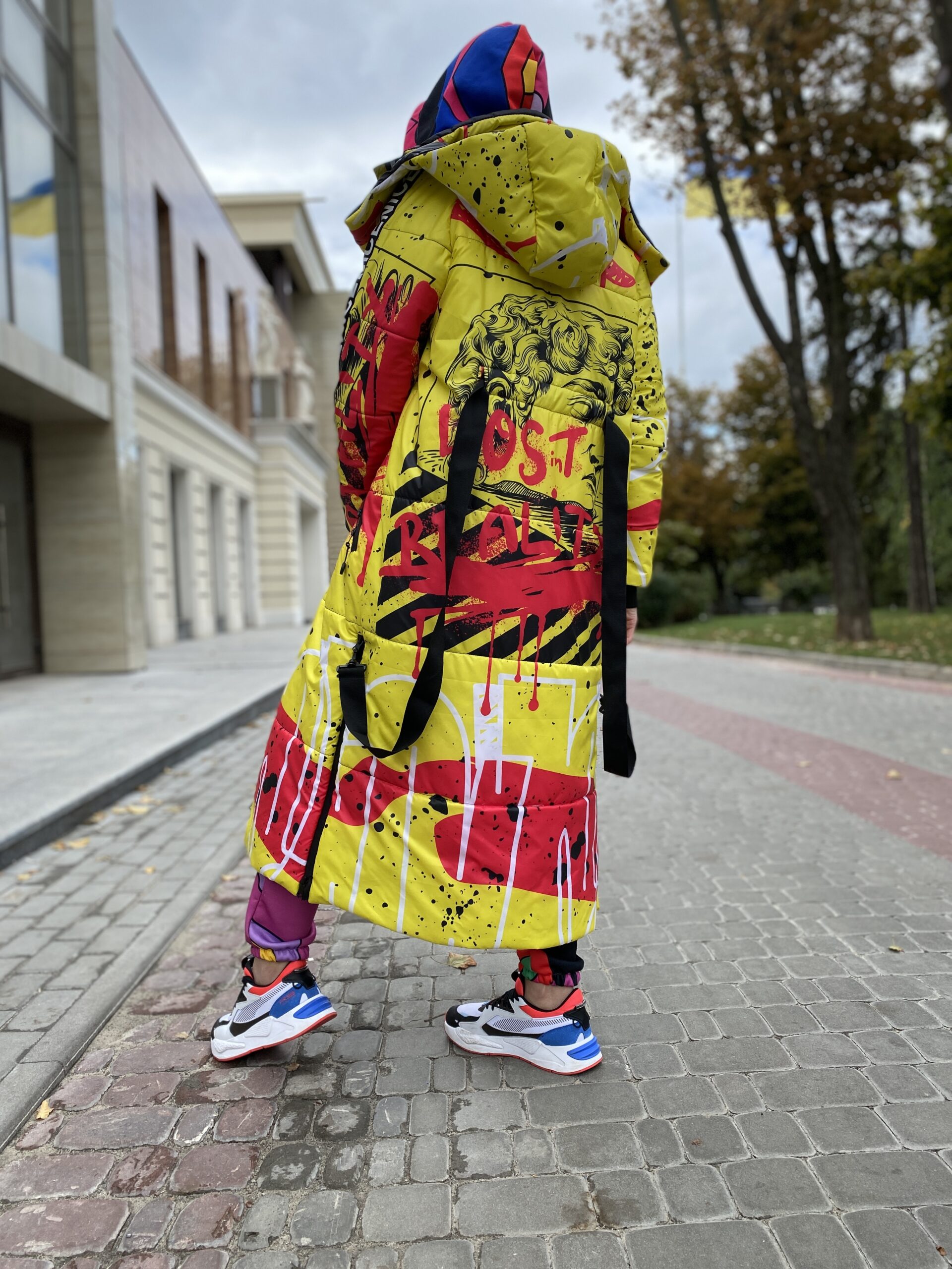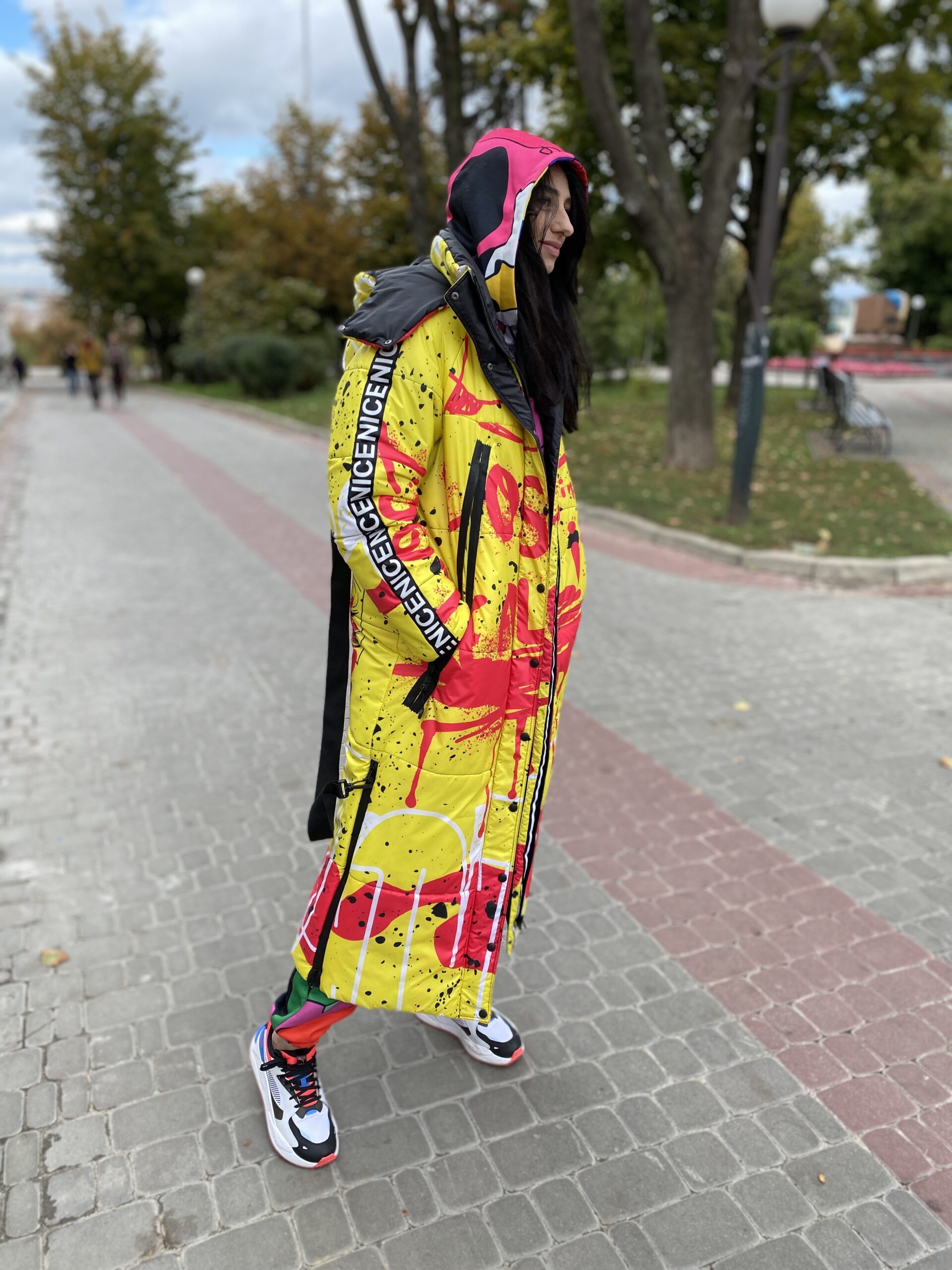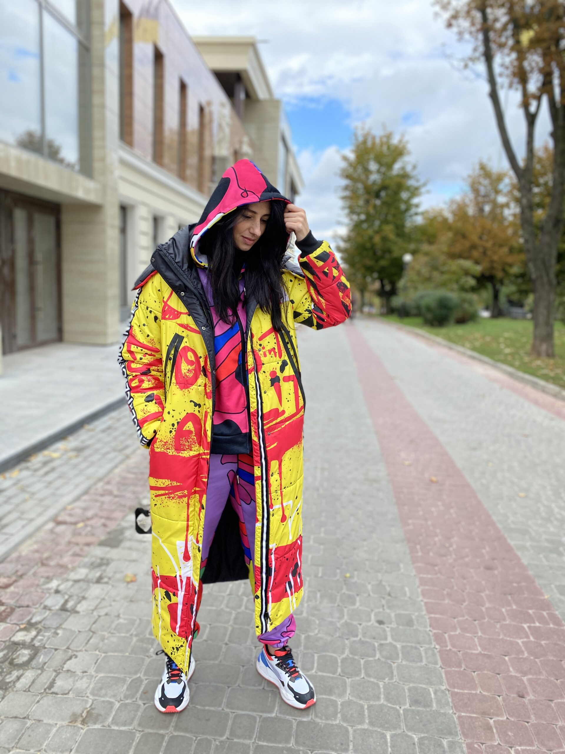 Women’s winter jacket with a straight cut with a hood is a combination of manufacturability, warmth and a design approach. Thanks to rubberized zippers, deep pockets, moisture protection and insulation with a density of 250, it will be an ideal option for cold winters. And thanks to the author’s print, it looks unique, atypical and expressive.