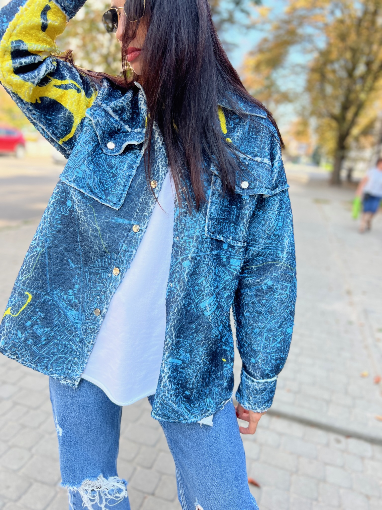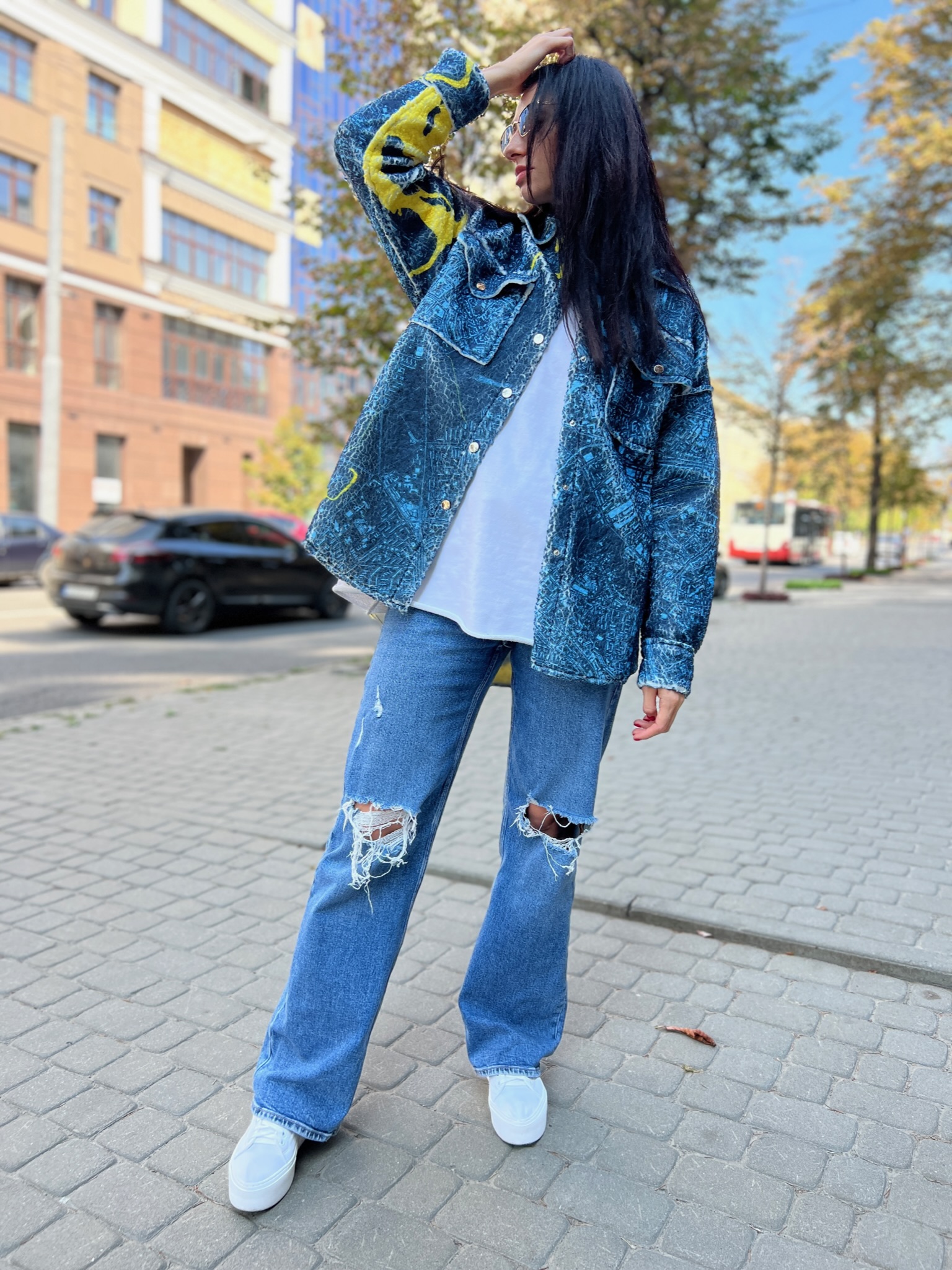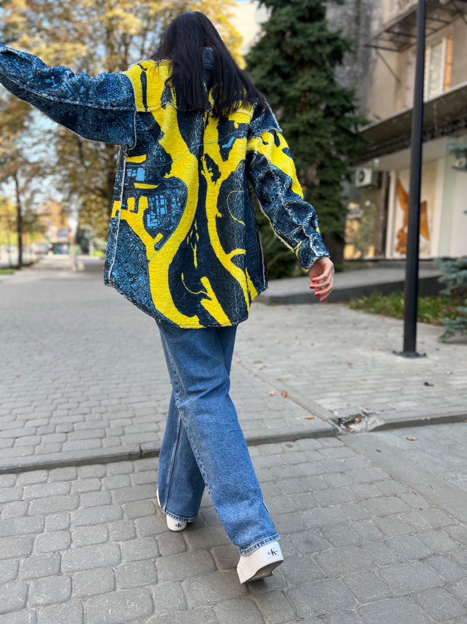 A double-sided straight-cut shirt is a stylish alternative to a light jacket. On the one hand, there is soft Teddy fur with an author’s print, on the other hand, jeans in a basic color. It transforms according to your mood, creating two images in oneproduct.