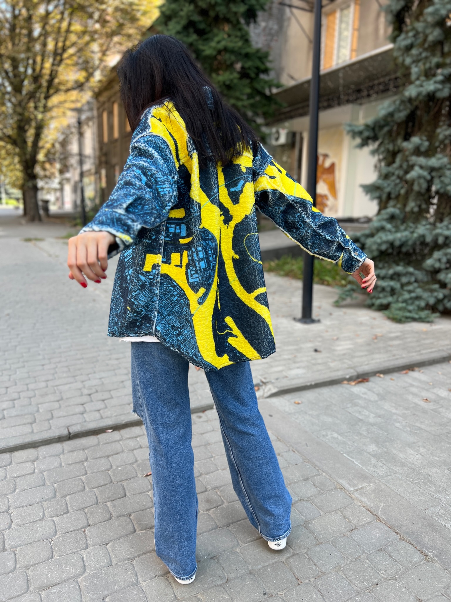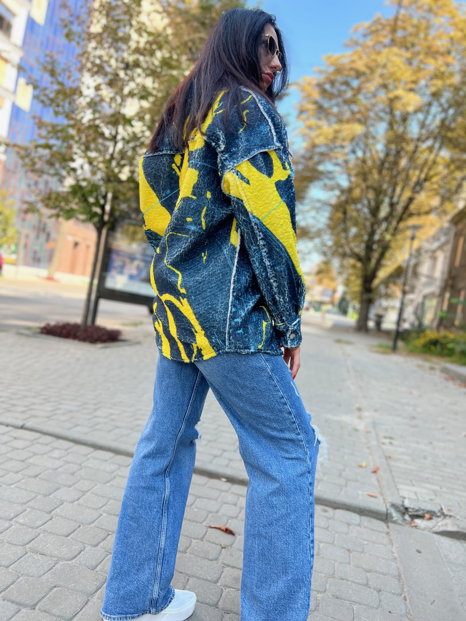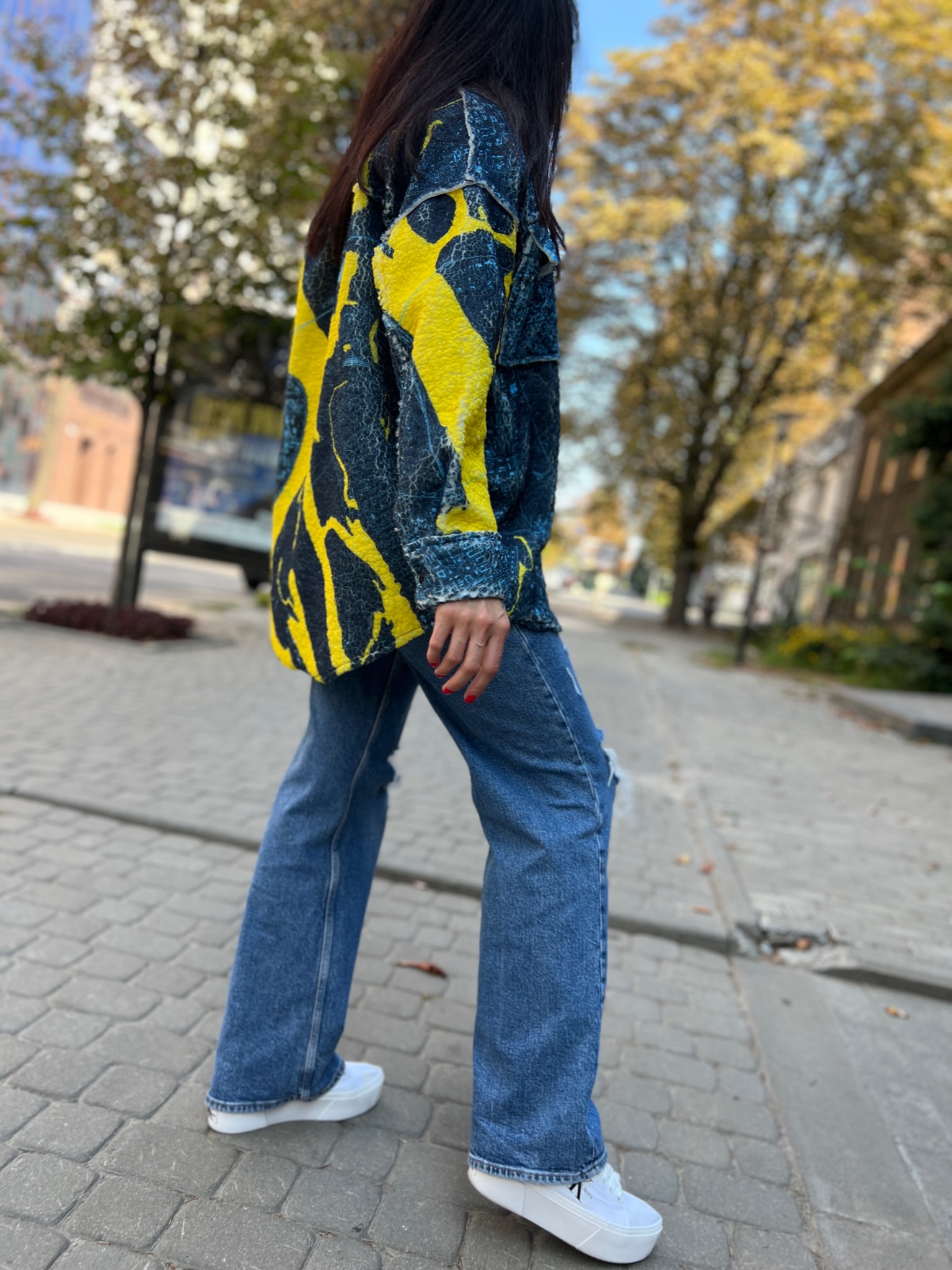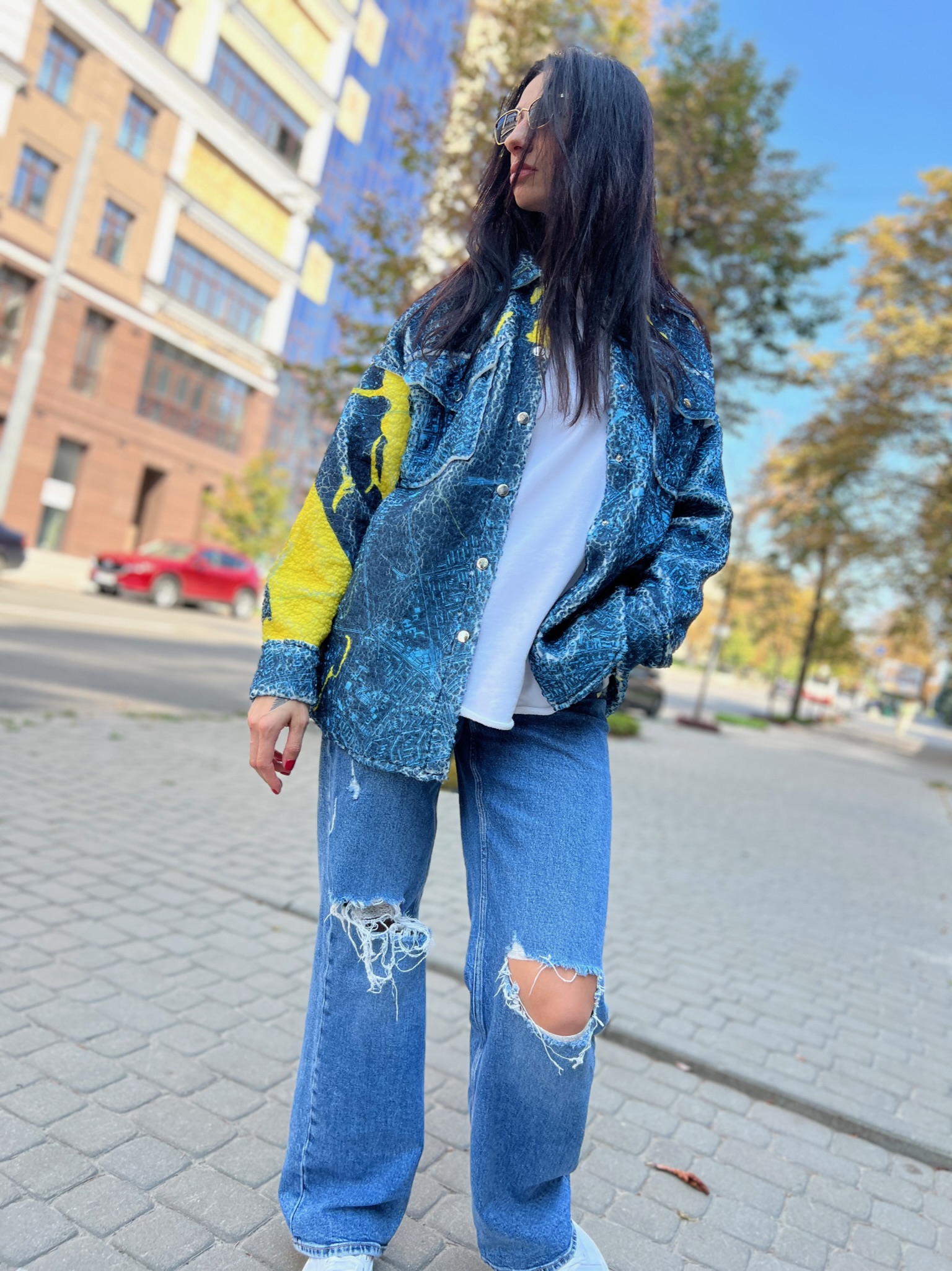 A double-sided straight-cut shirt is a stylish alternative to a light jacket. On the one hand, there is soft Teddy fur with an author’s print, on the other hand, jeans in a basic color. It transforms according to your mood, creating two images in oneproduct.
