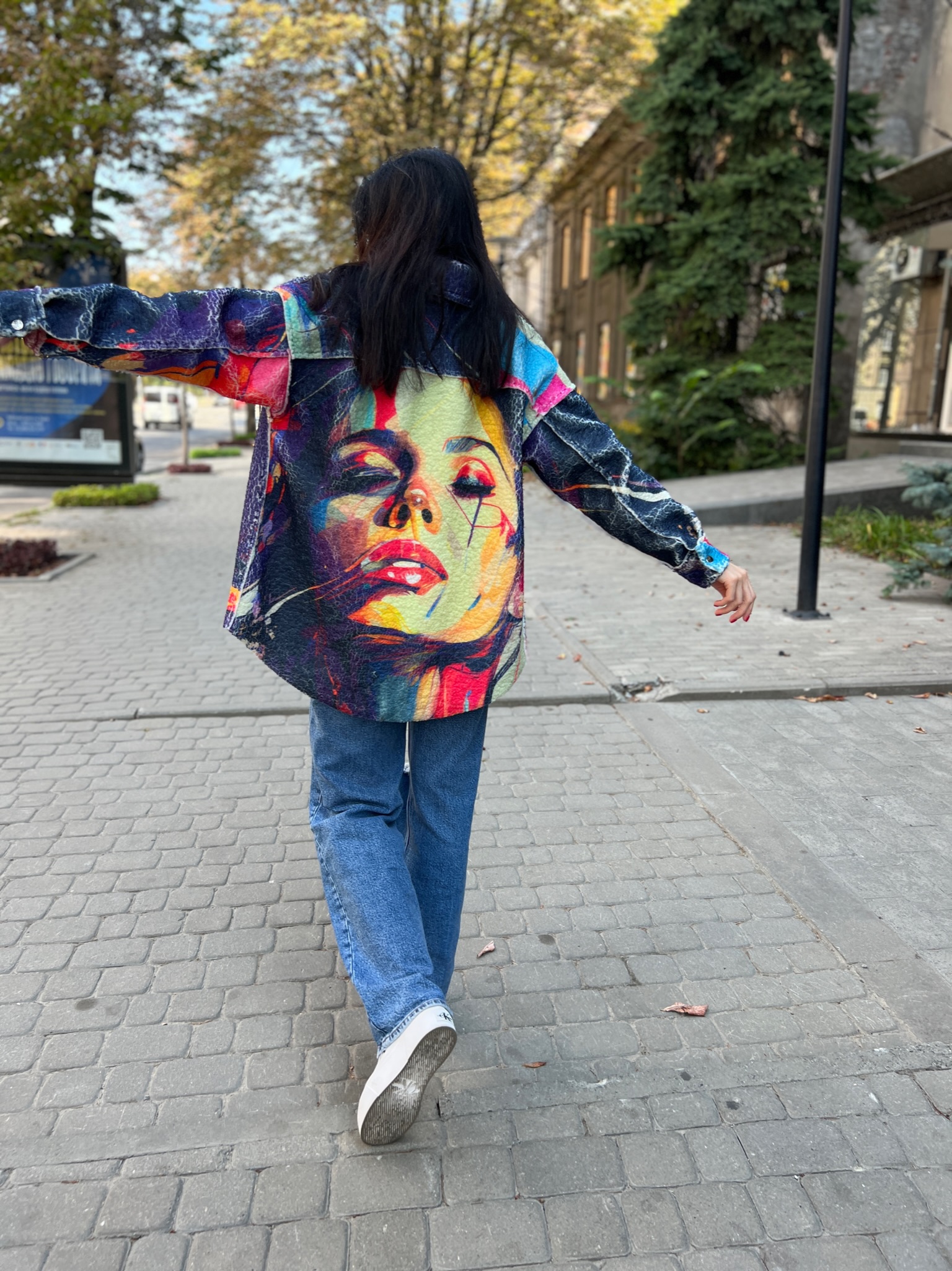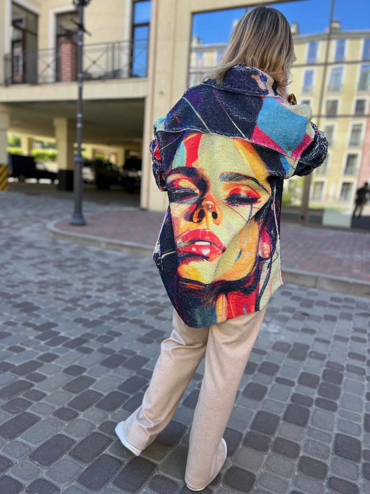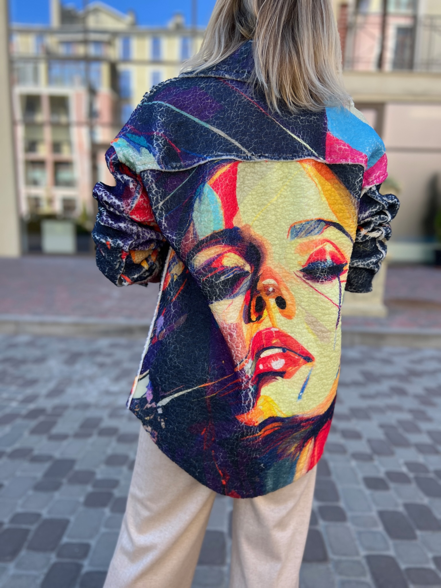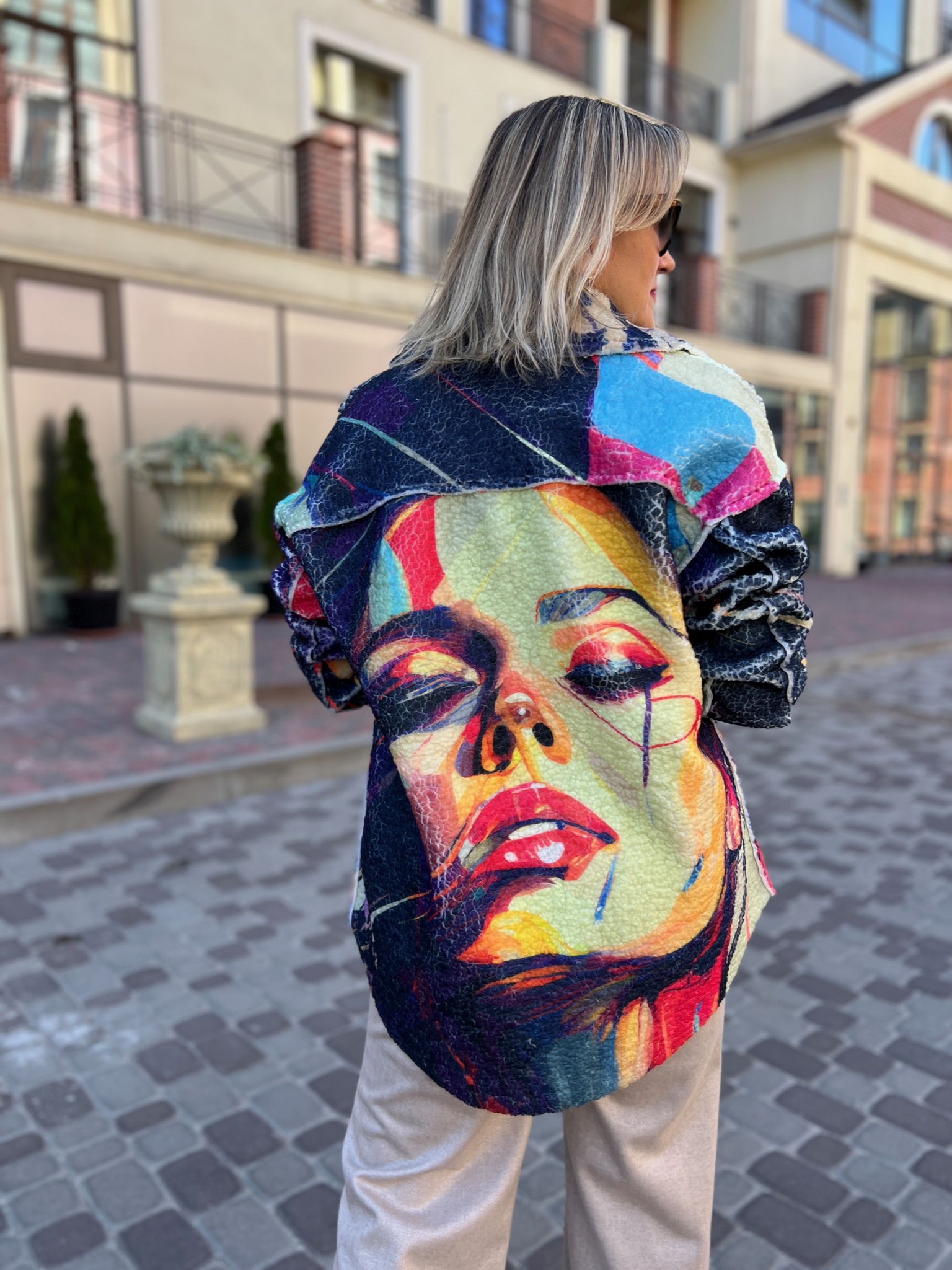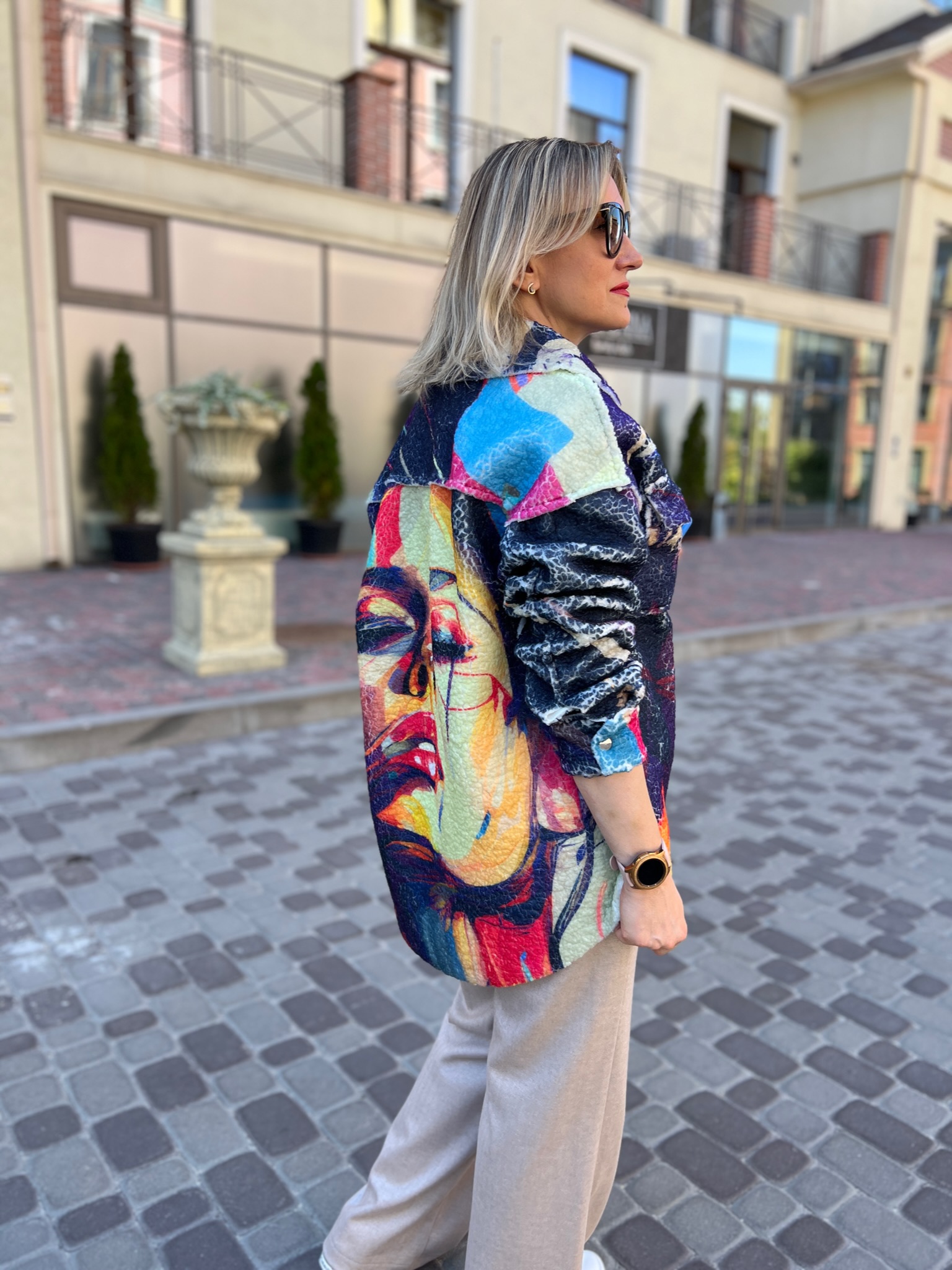 A double-sided straight-cut shirt is a stylish alternative to a light jacket. On the one hand, there is soft Teddy fur with an author’s print, on the other hand, jeans in a basic color. It transforms according to your mood, creating two images in oneproduct.