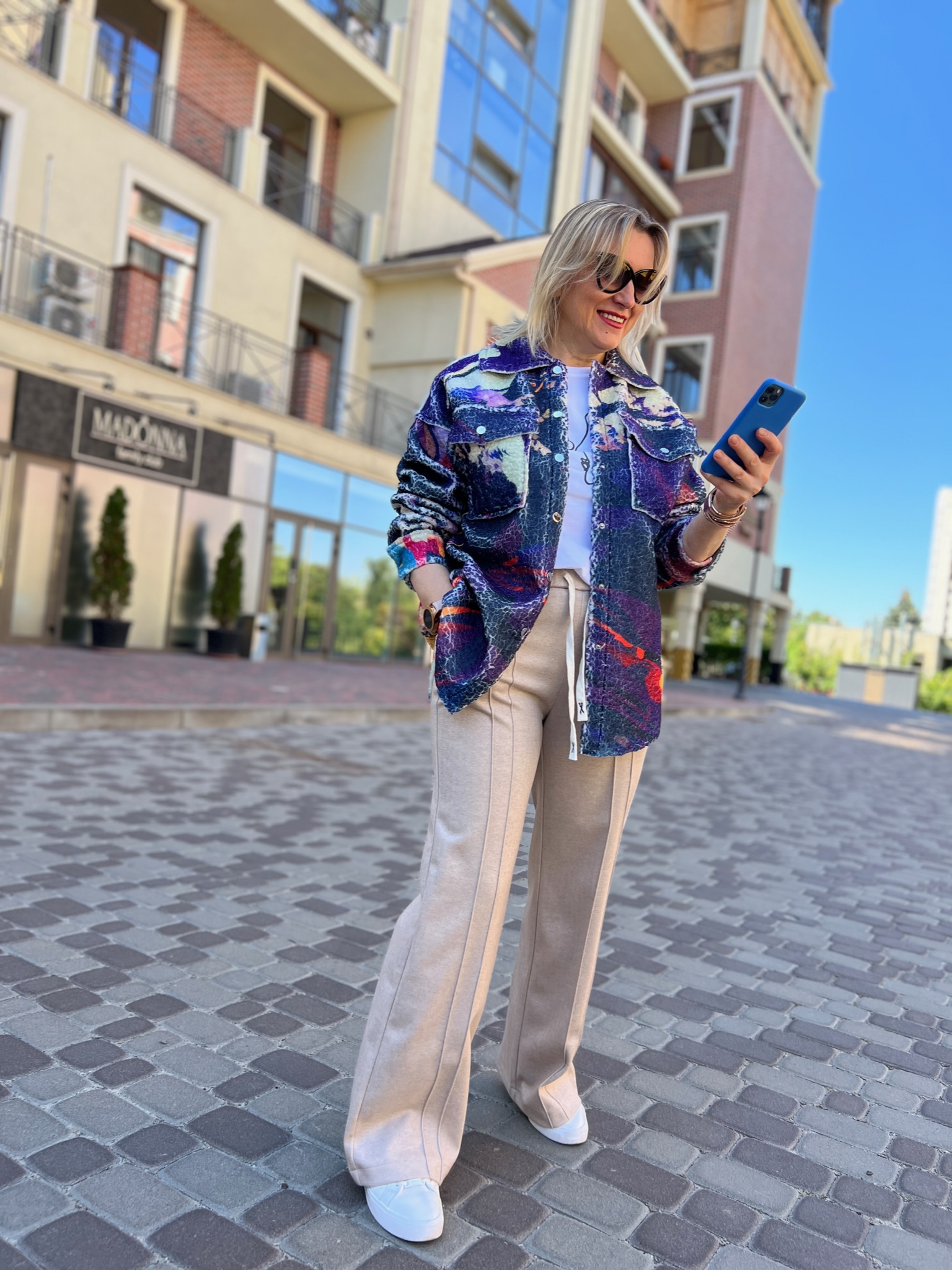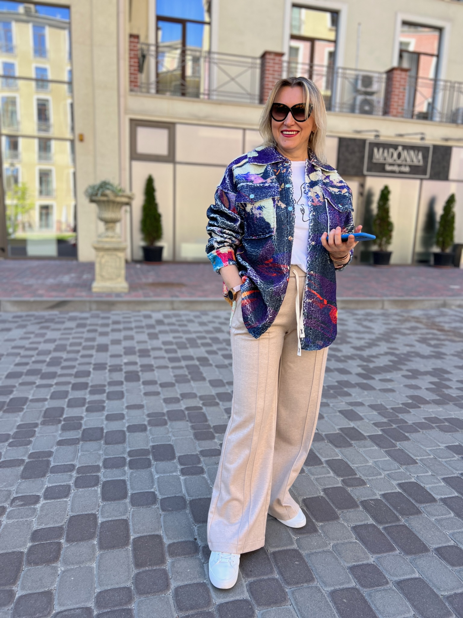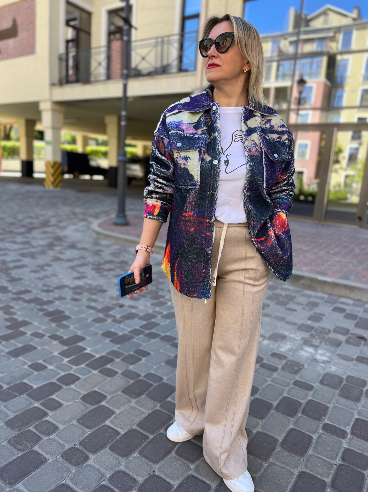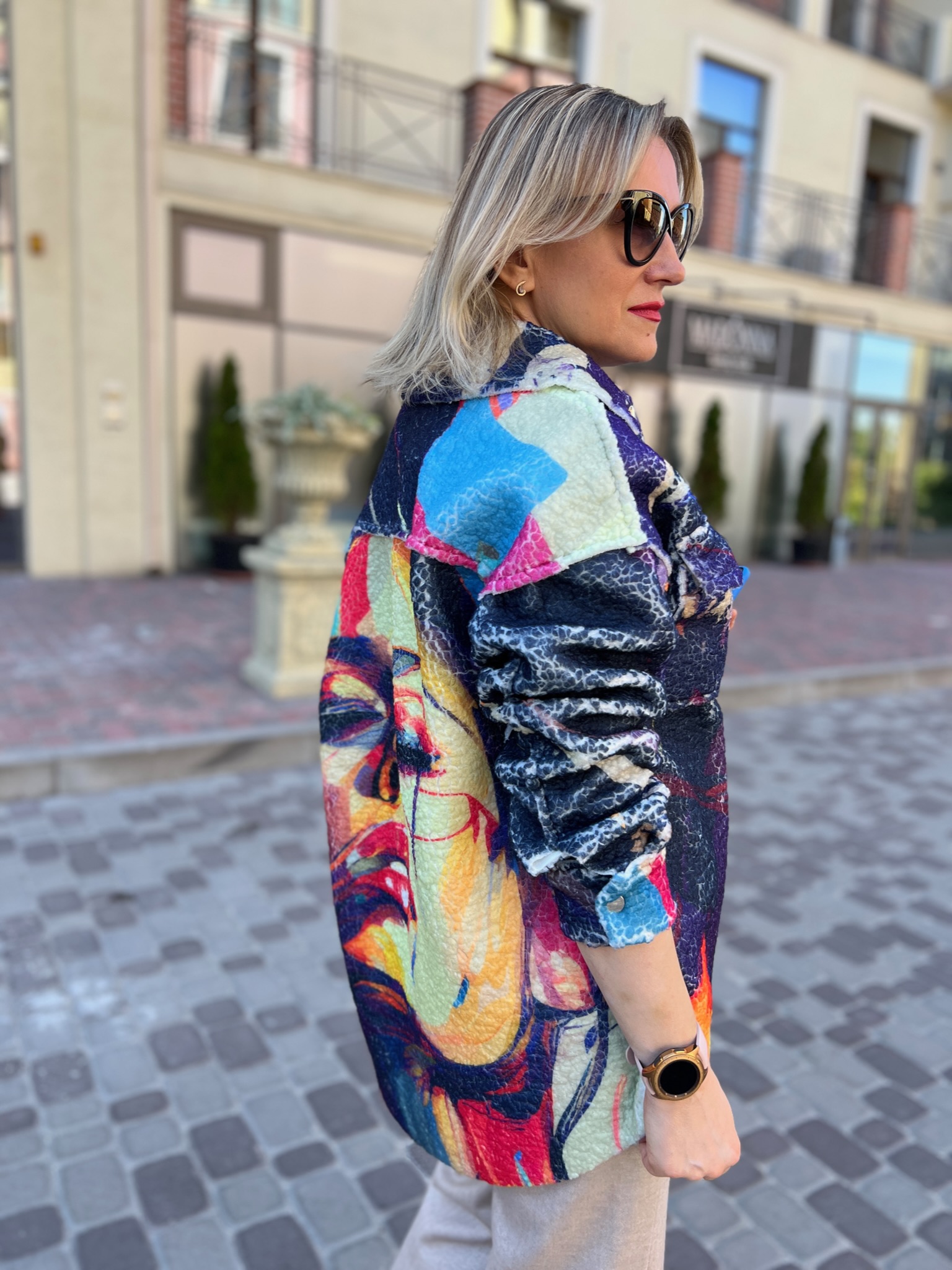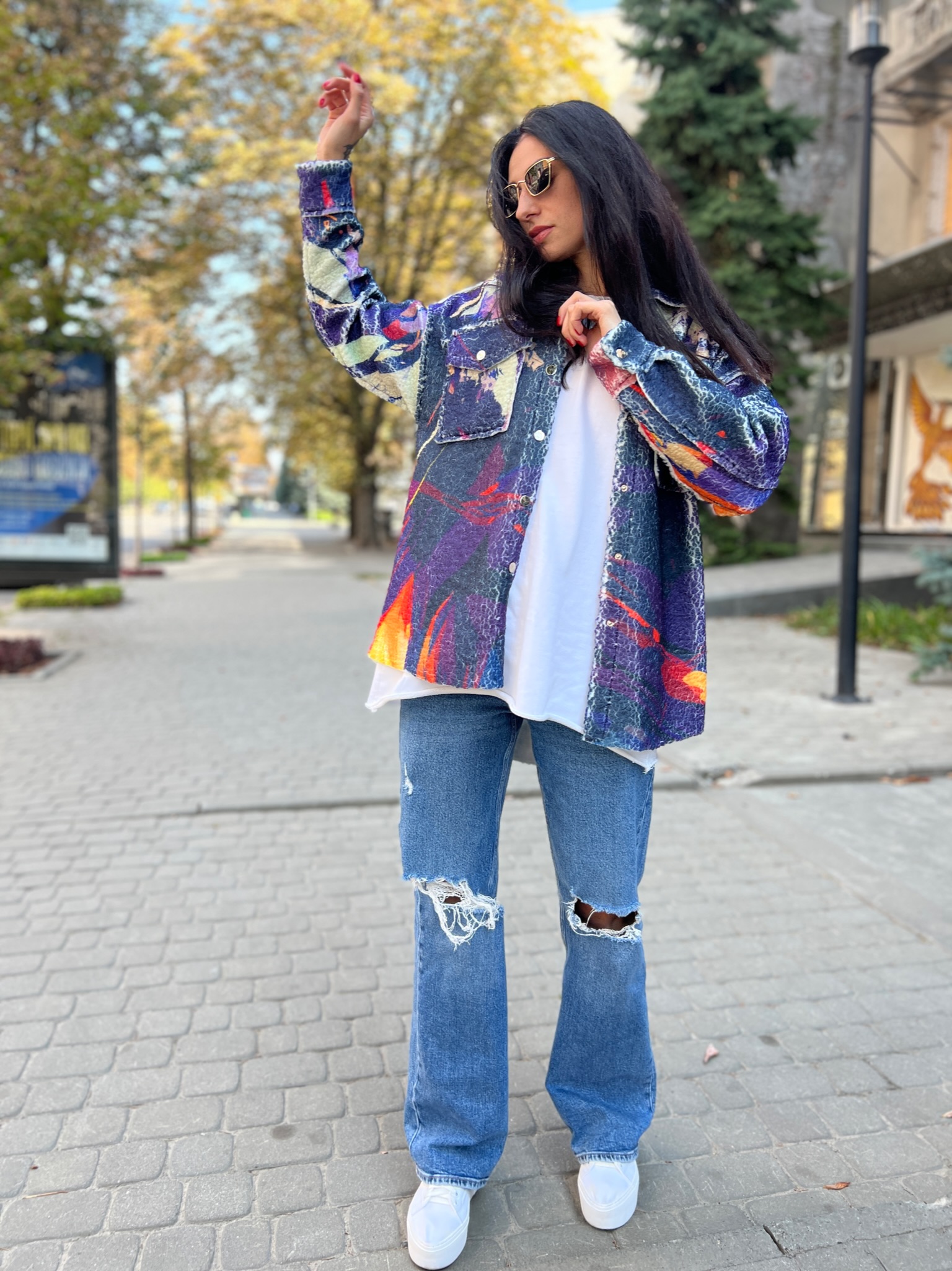 A double-sided straight-cut shirt is a stylish alternative to a light jacket. On the one hand, there is soft Teddy fur with an author’s print, on the other hand, jeans in a basic color. It transforms according to your mood, creating two images in oneproduct.