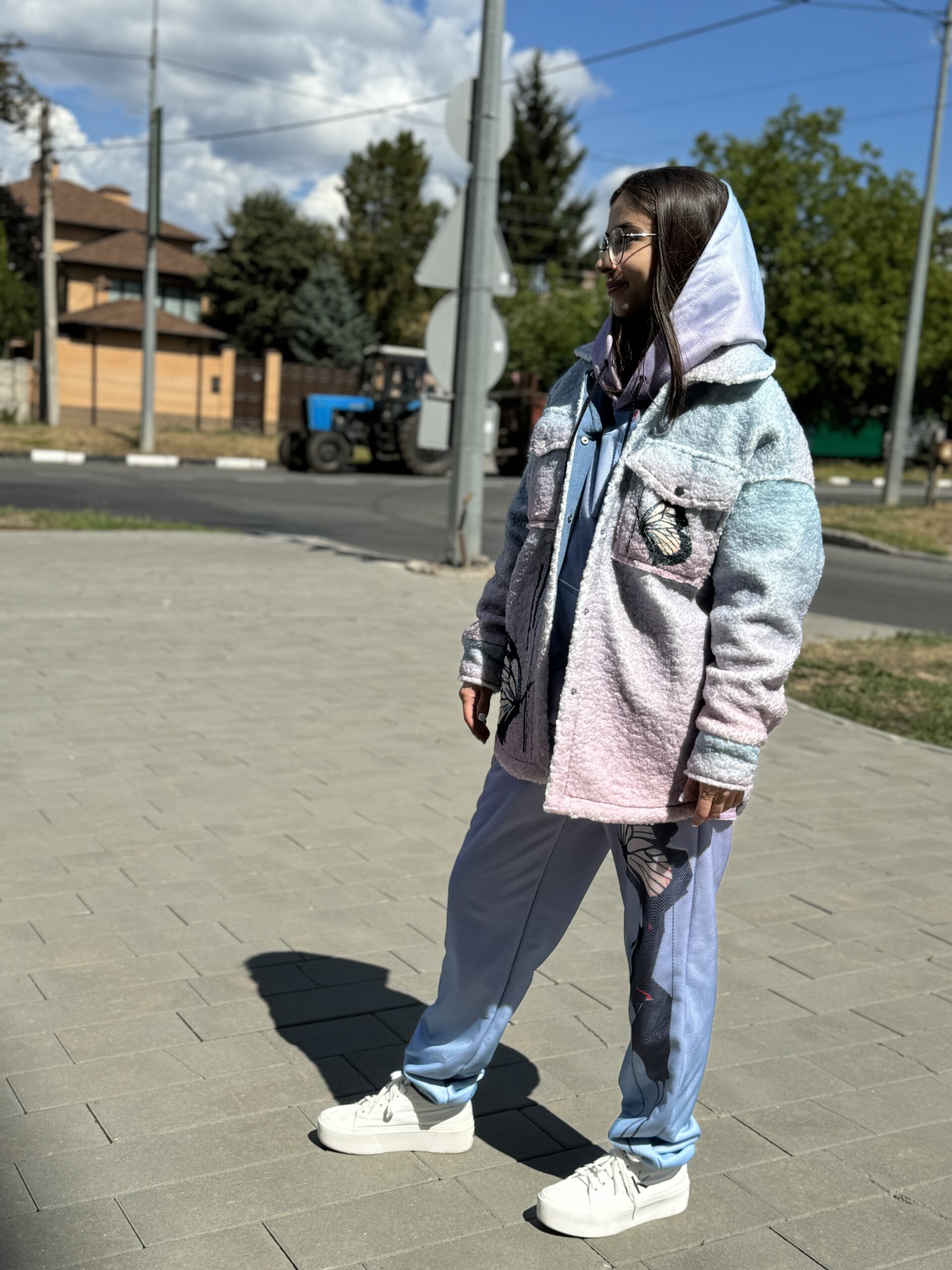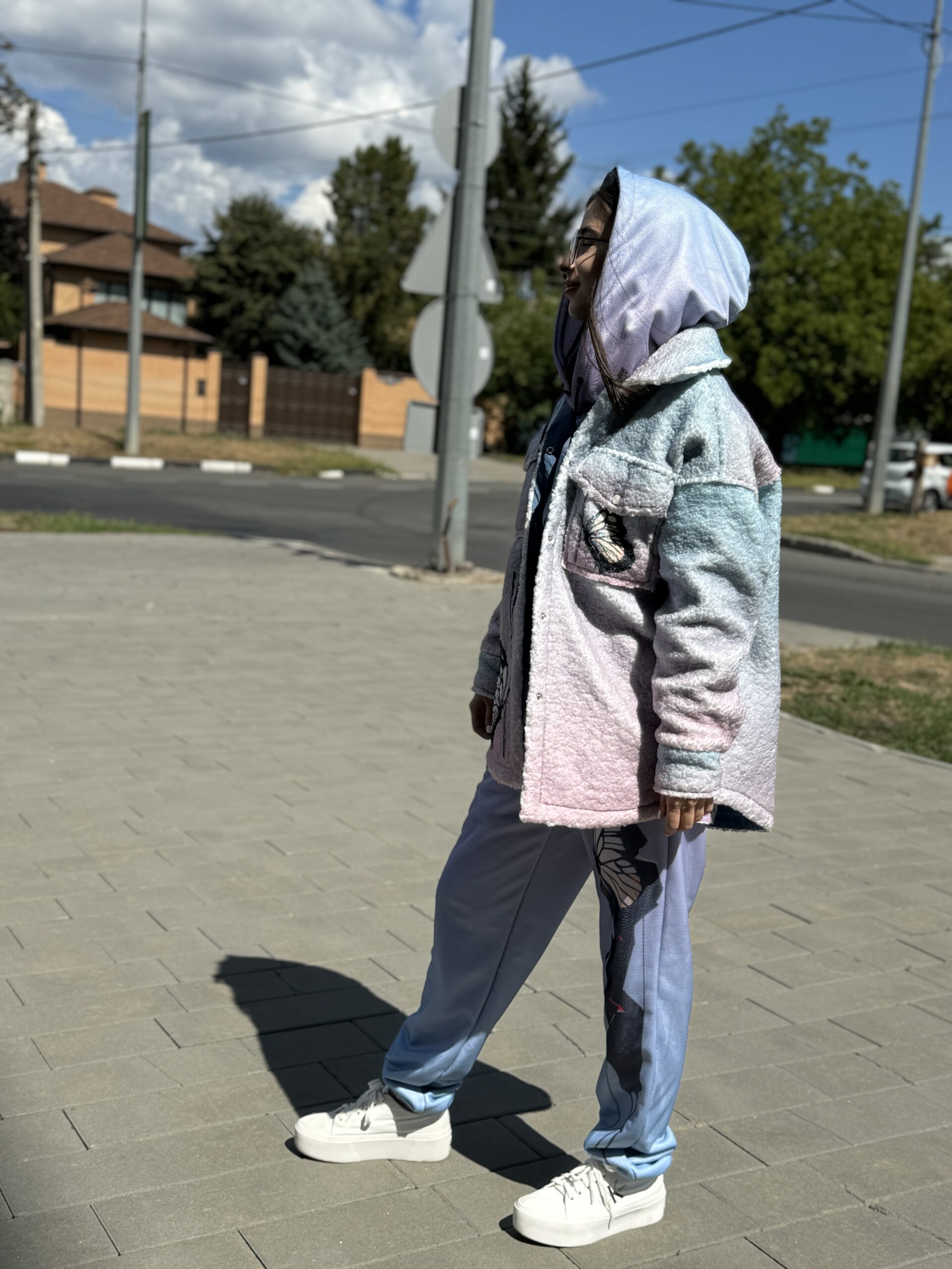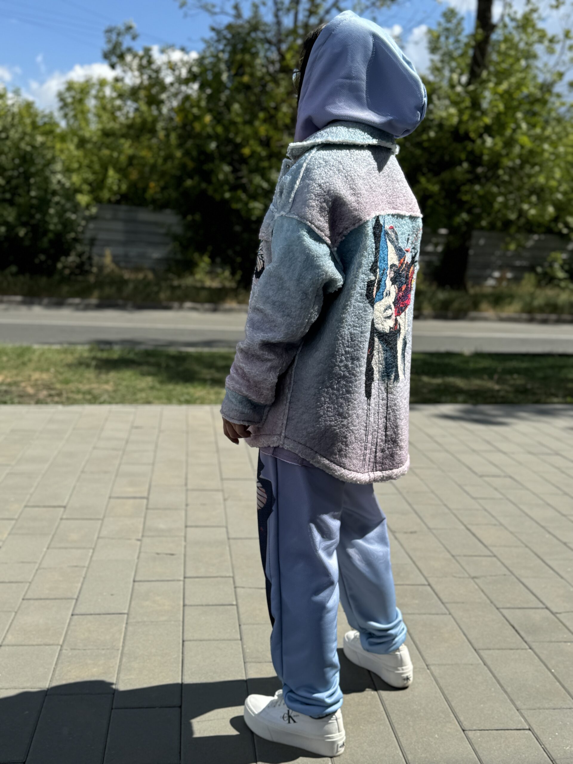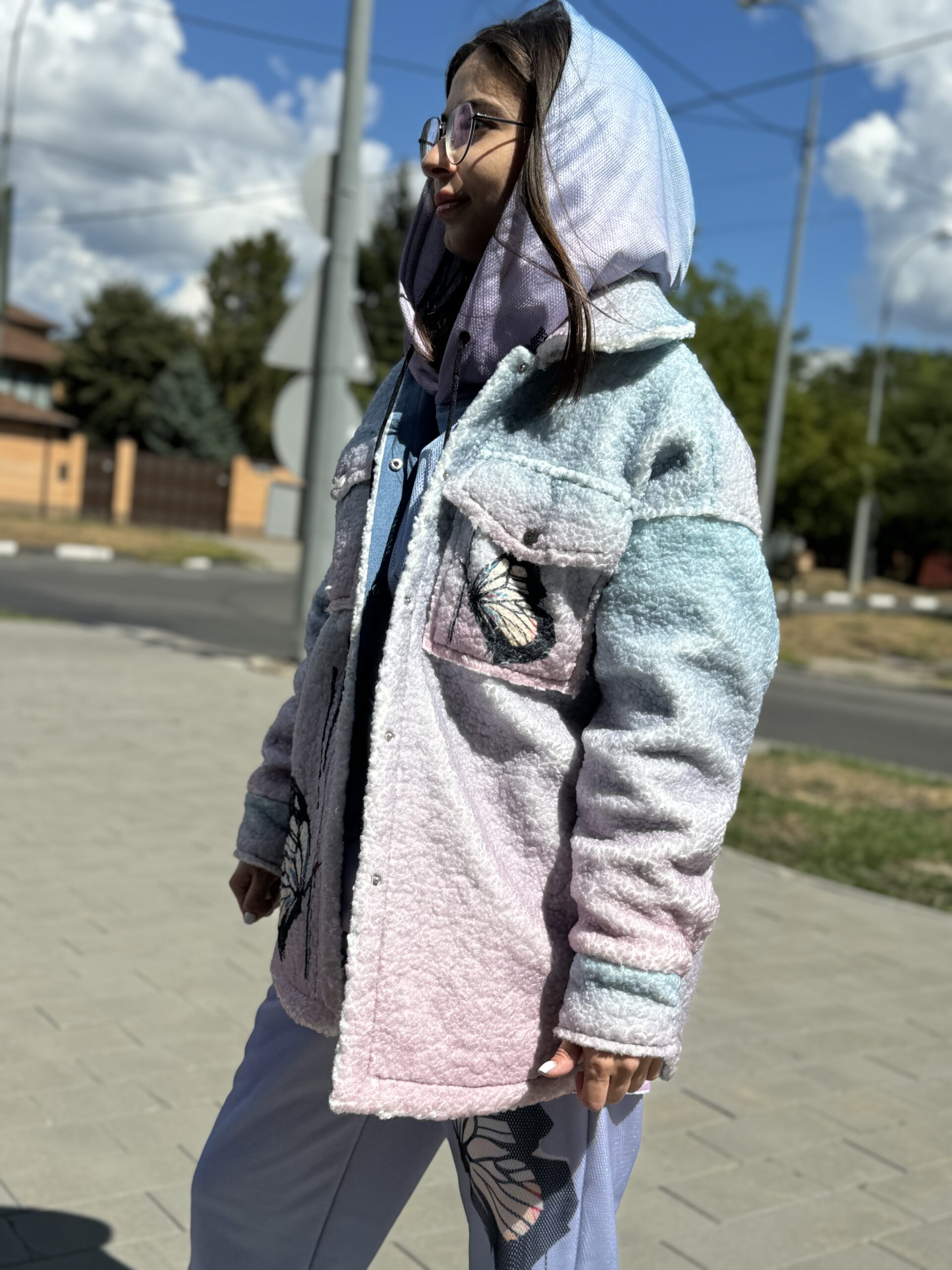 A double-sided straight-cut shirt is a stylish alternative to a light jacket. On the one hand, there is soft Teddy fur with an author’s print, on the other hand, jeans in a basic color. It transforms according to your mood, creating two images in oneproduct.