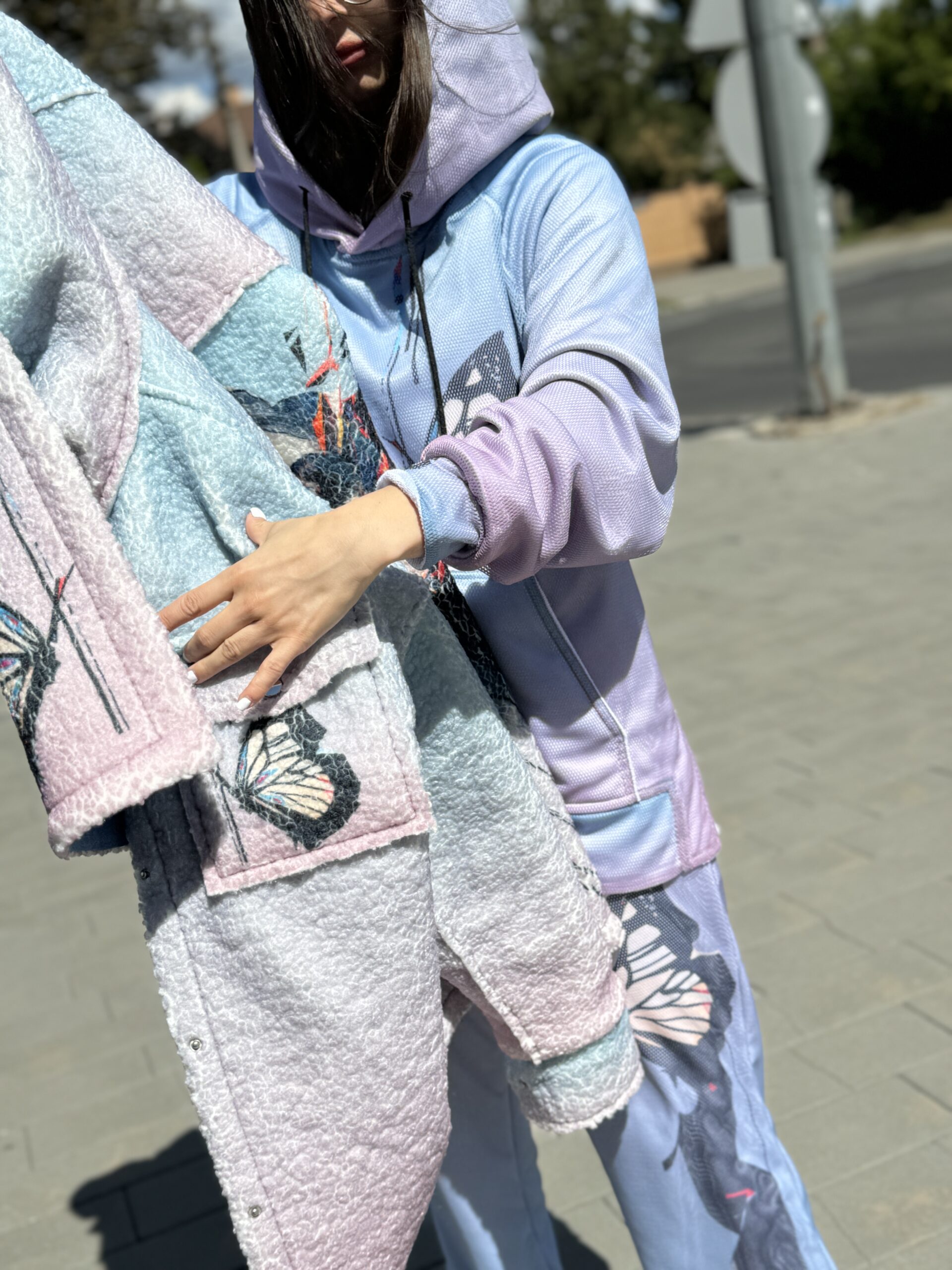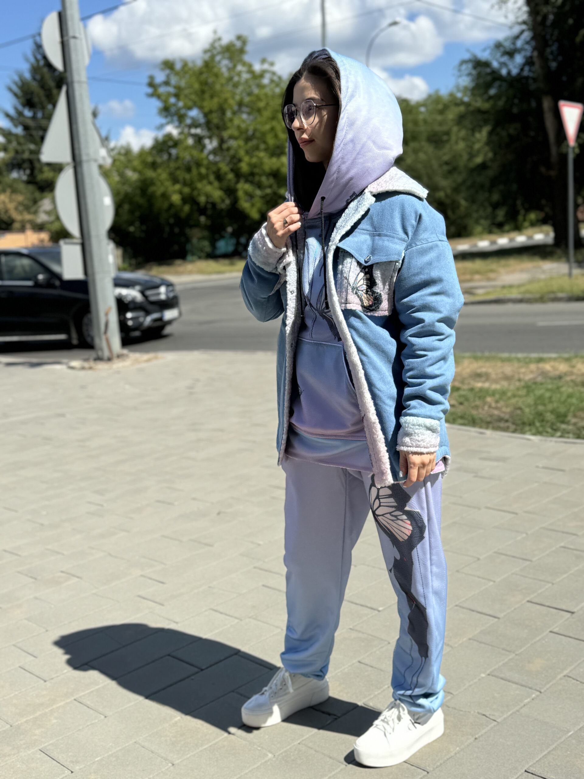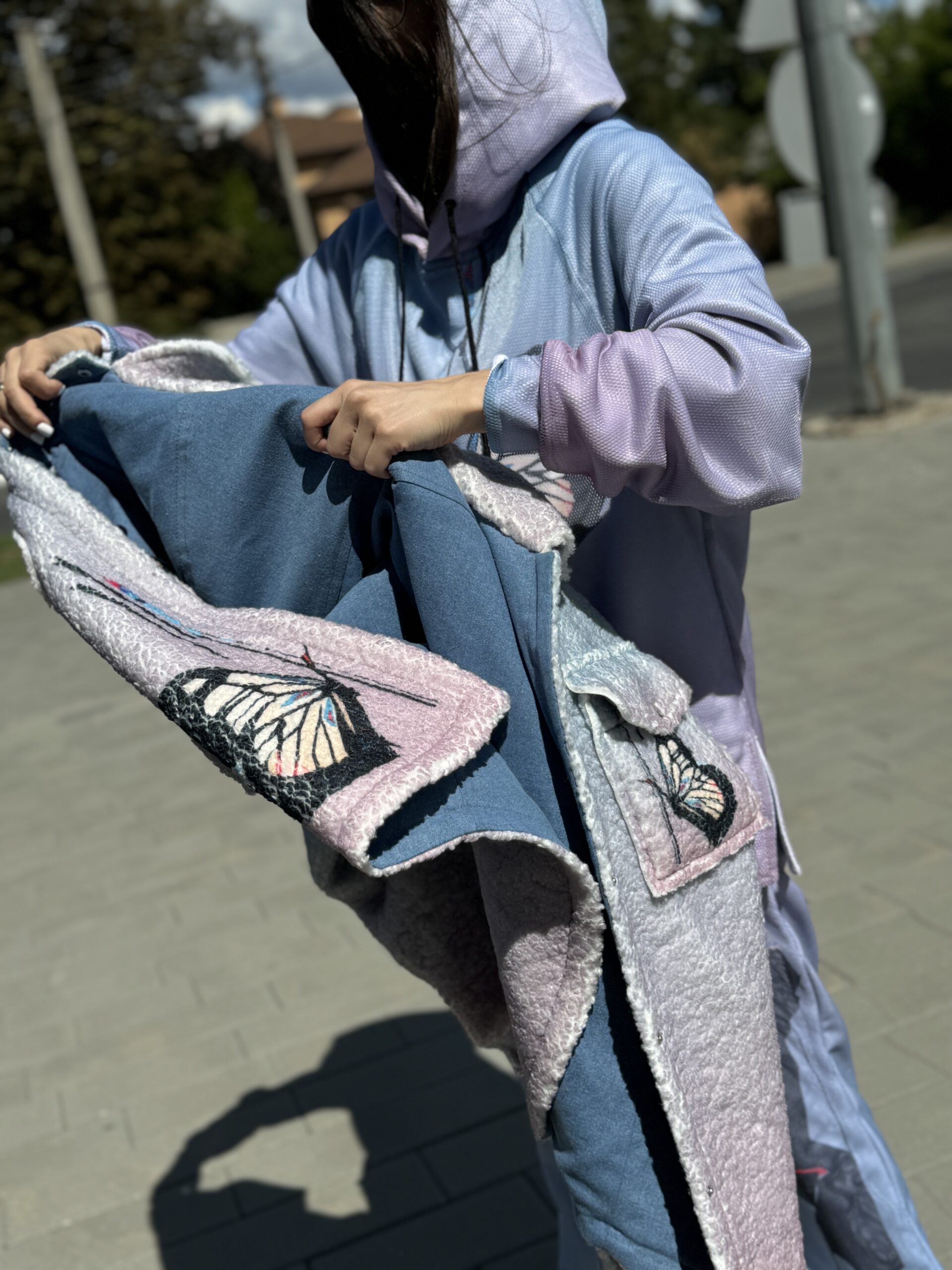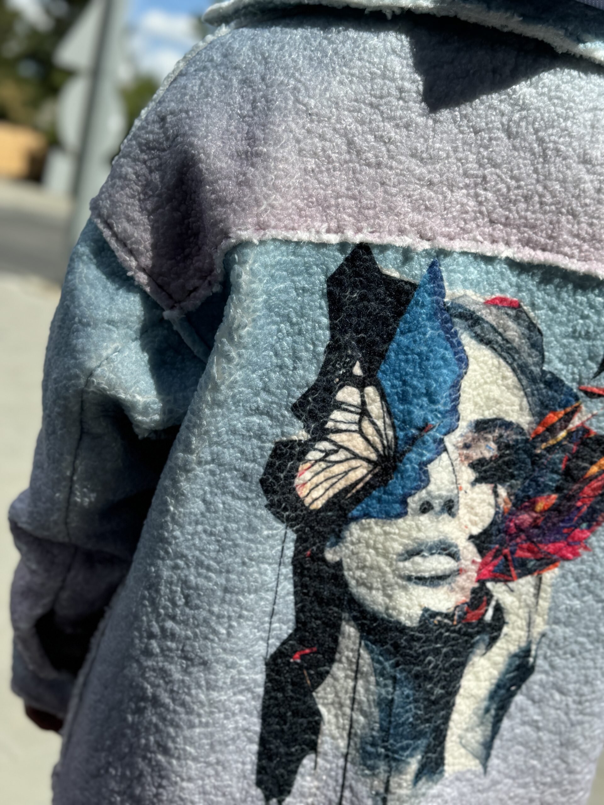 A double-sided straight-cut shirt is a stylish alternative to a light jacket. On the one hand, there is soft Teddy fur with an author’s print, on the other hand, jeans in a basic color. It transforms according to your mood, creating two images in oneproduct.