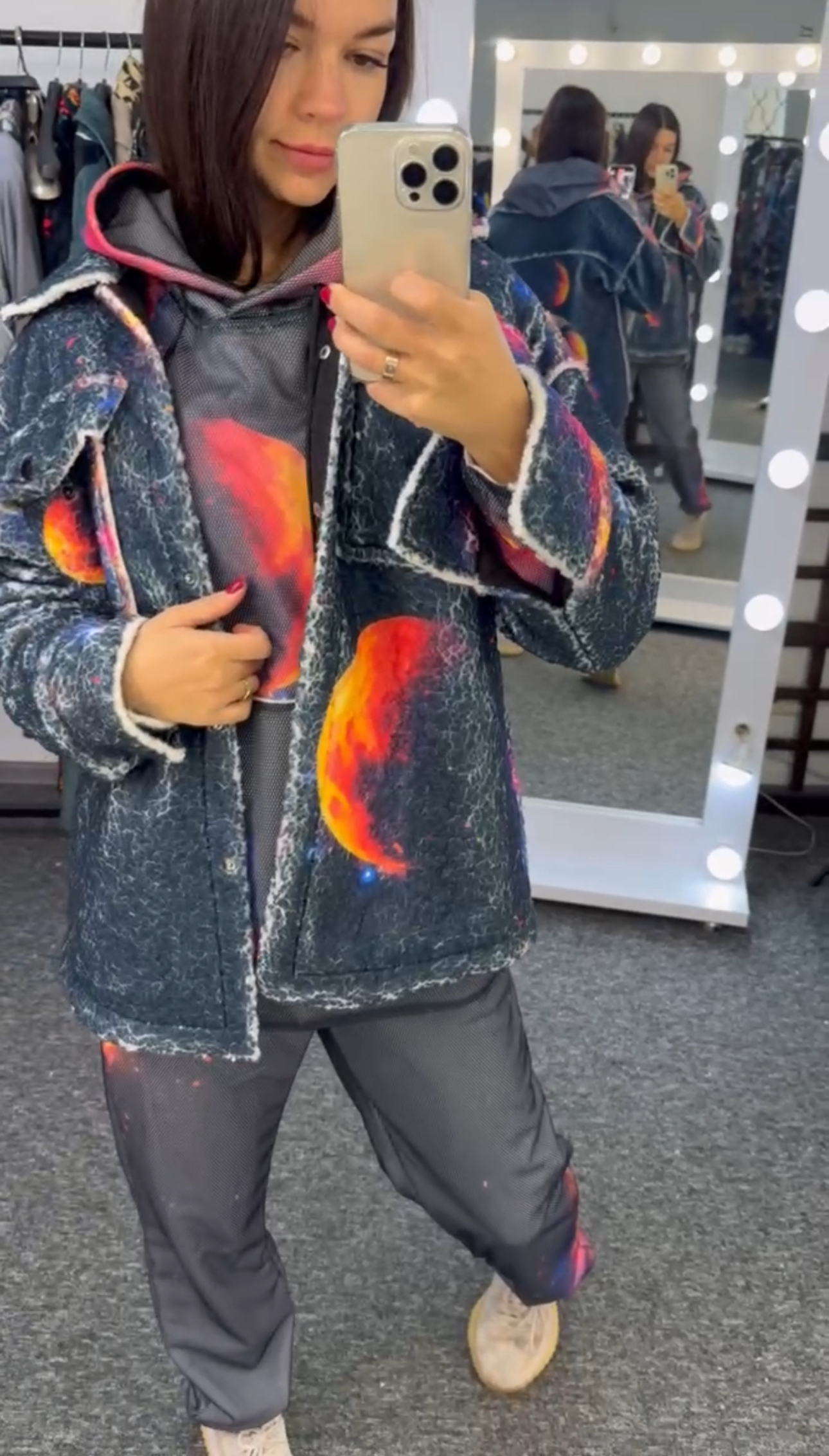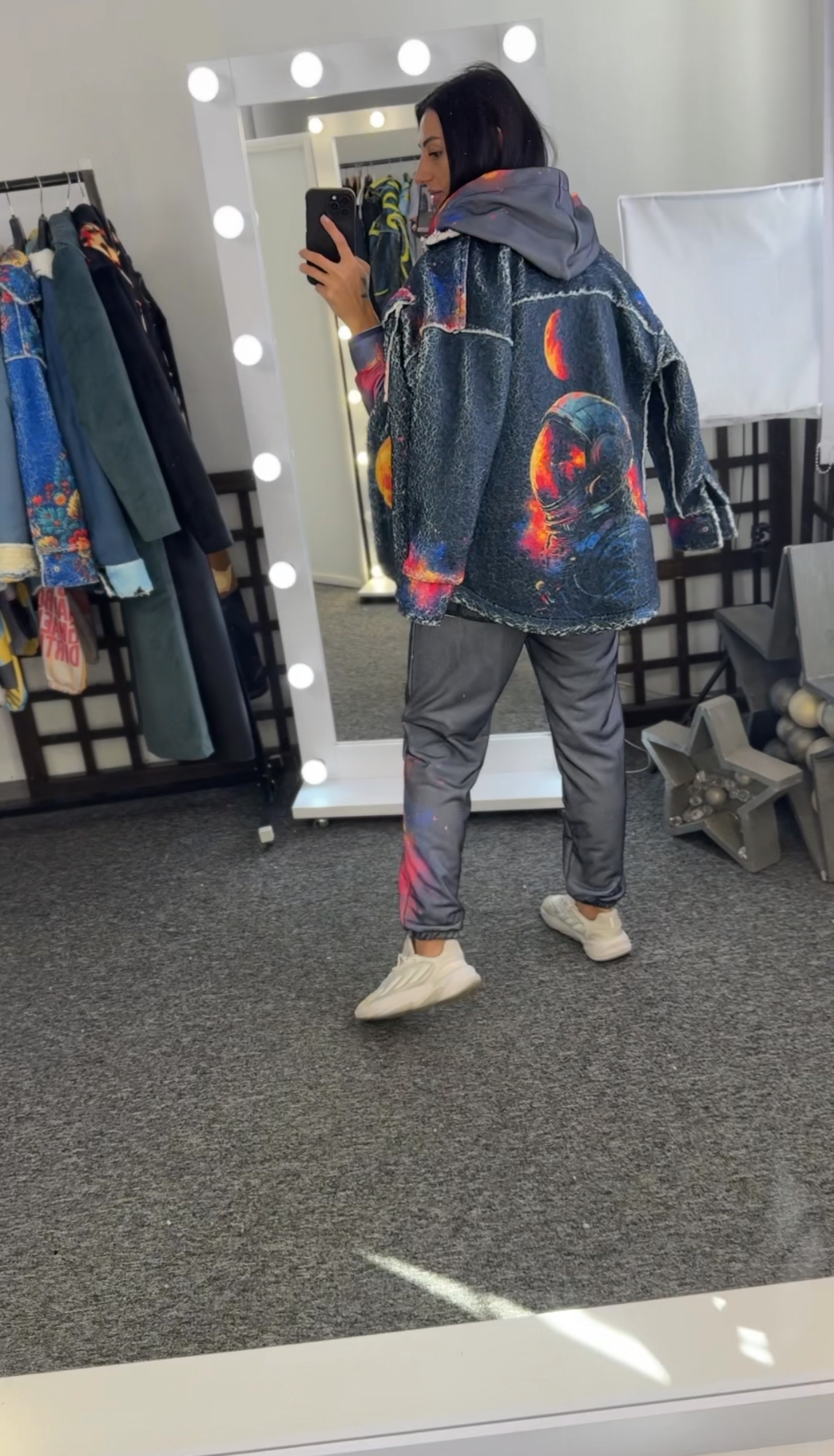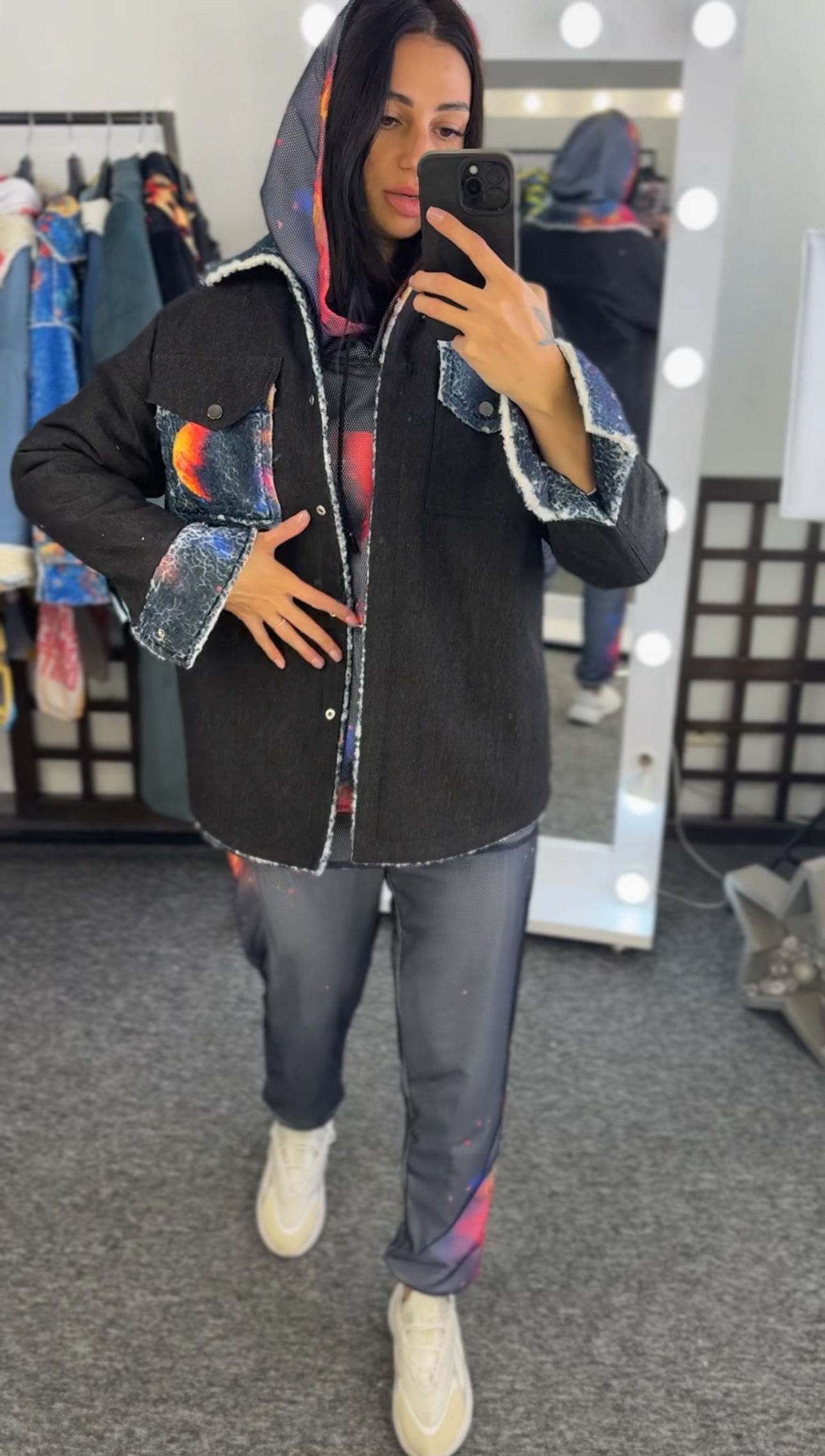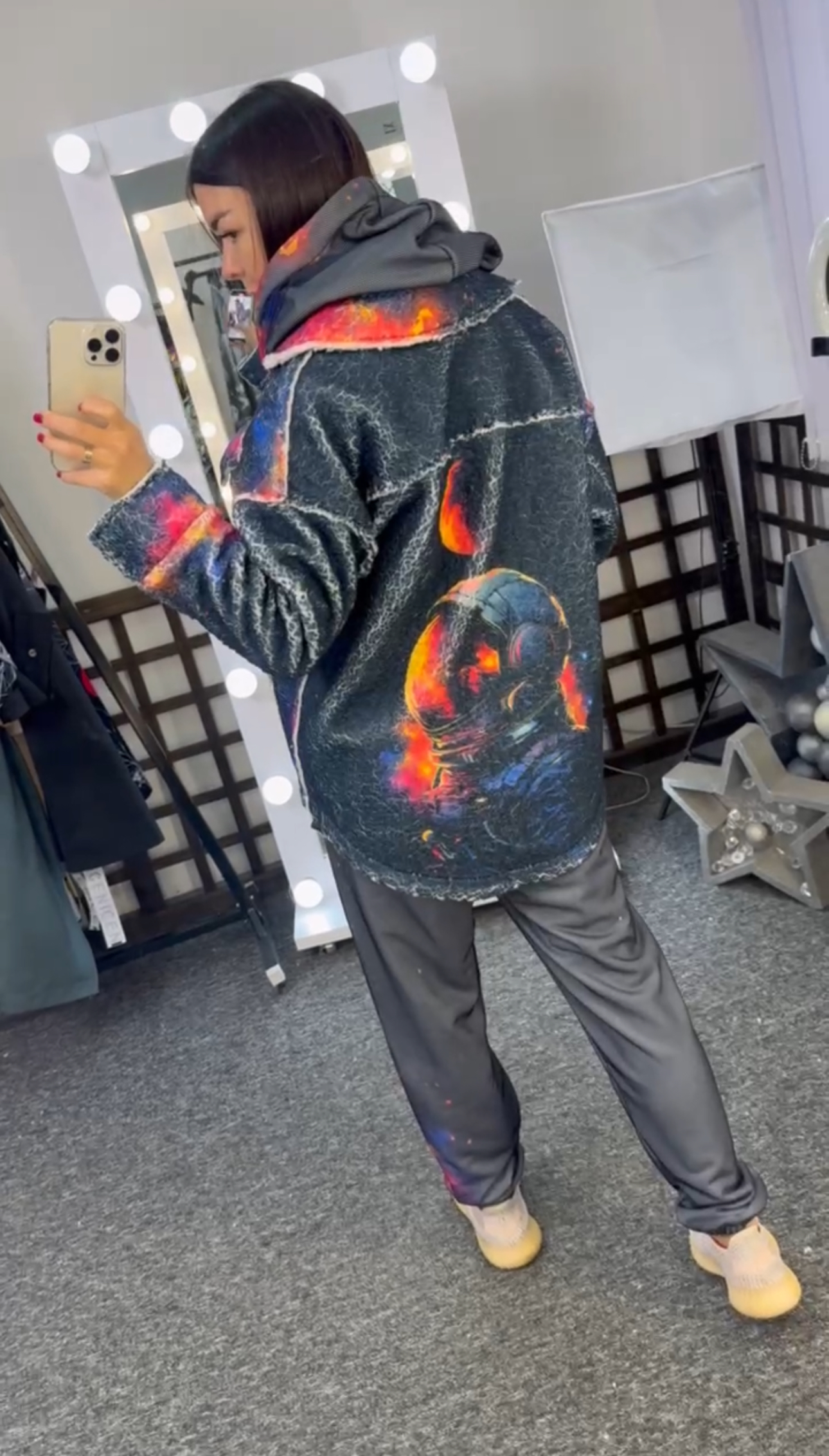 A double-sided straight-cut shirt is a stylish alternative to a light jacket. On the one hand, there is soft Teddy fur with an author’s print, on the other hand, jeans in a basic color. It transforms according to your mood, creating two images in oneproduct.