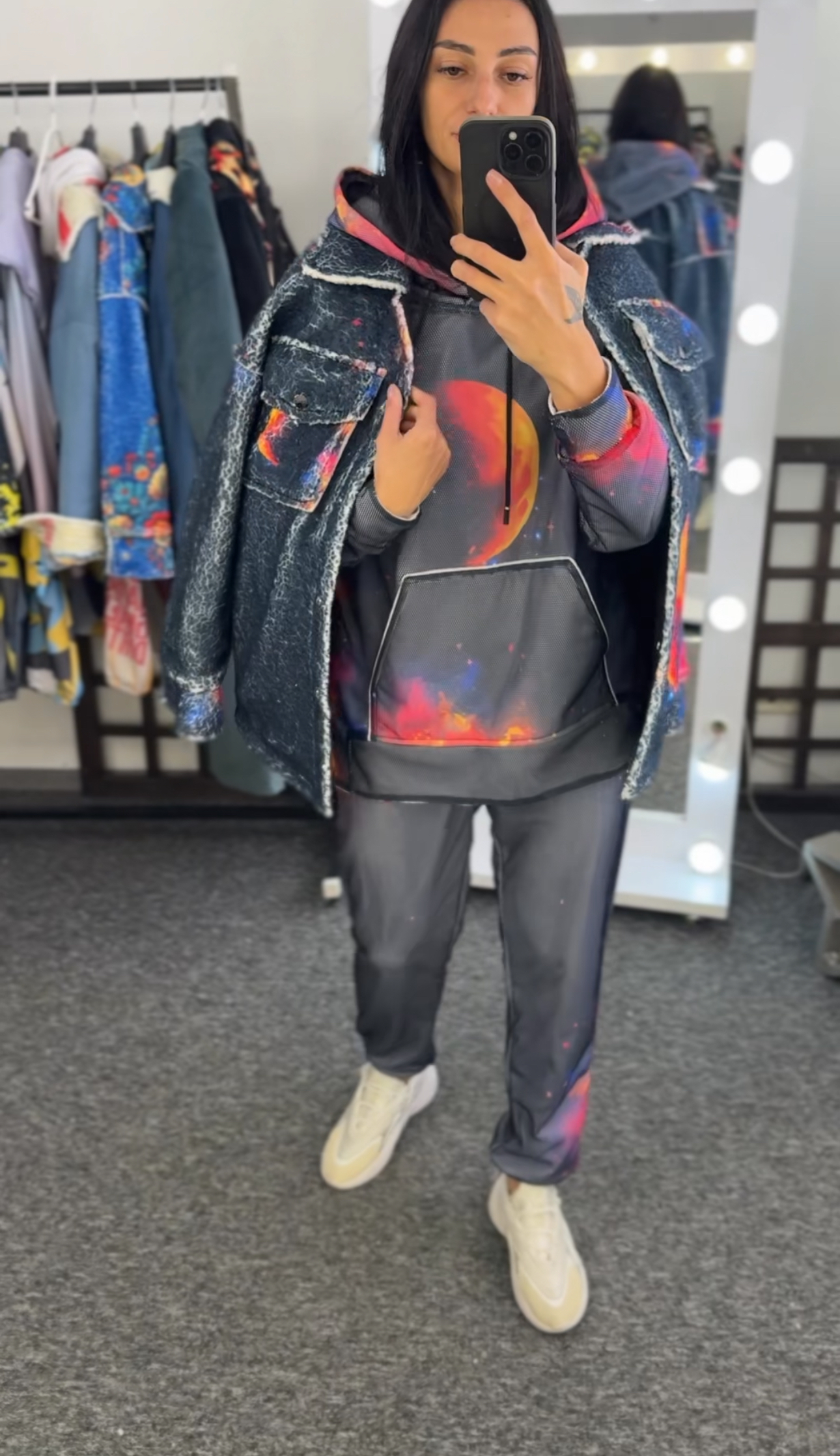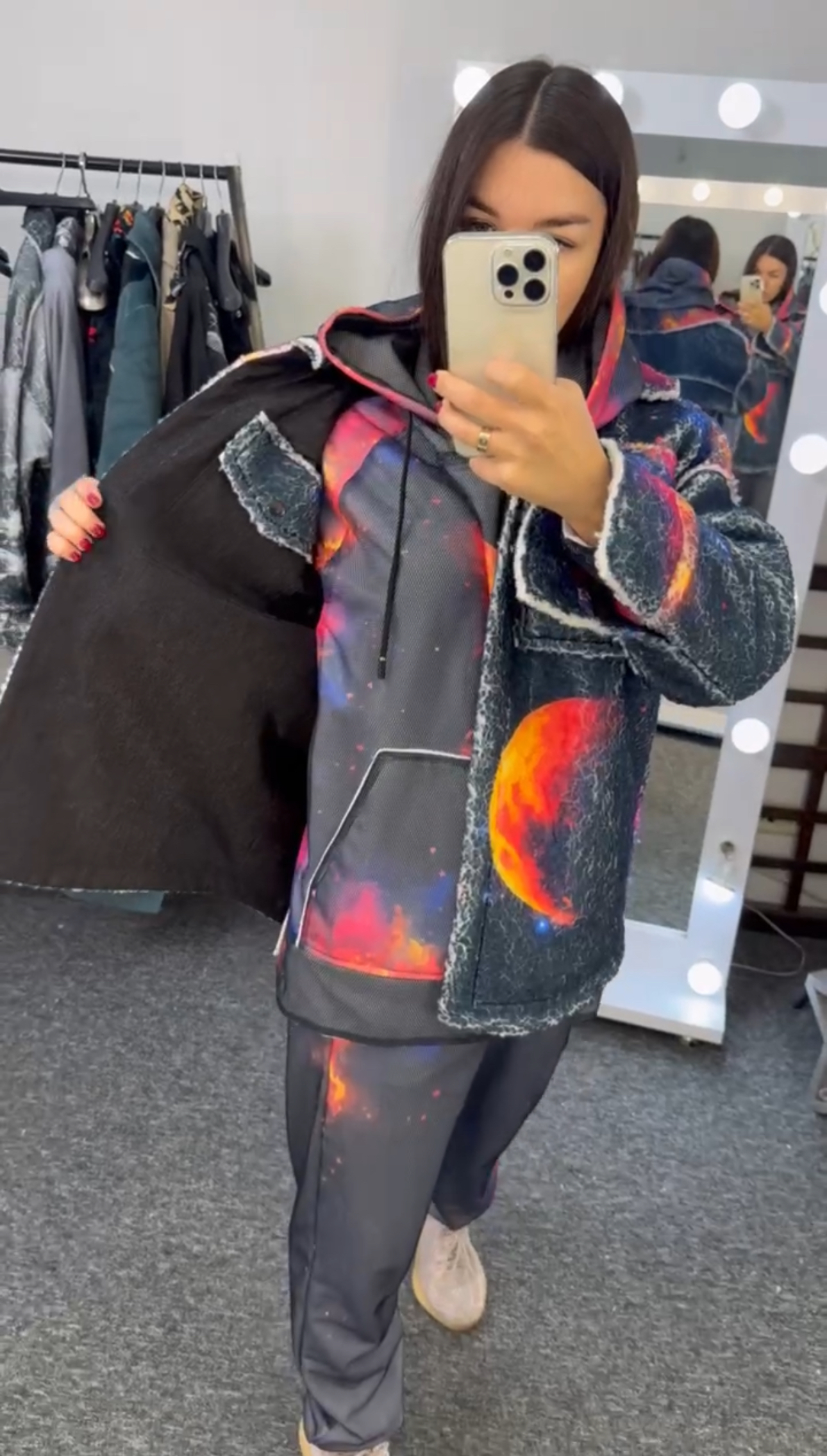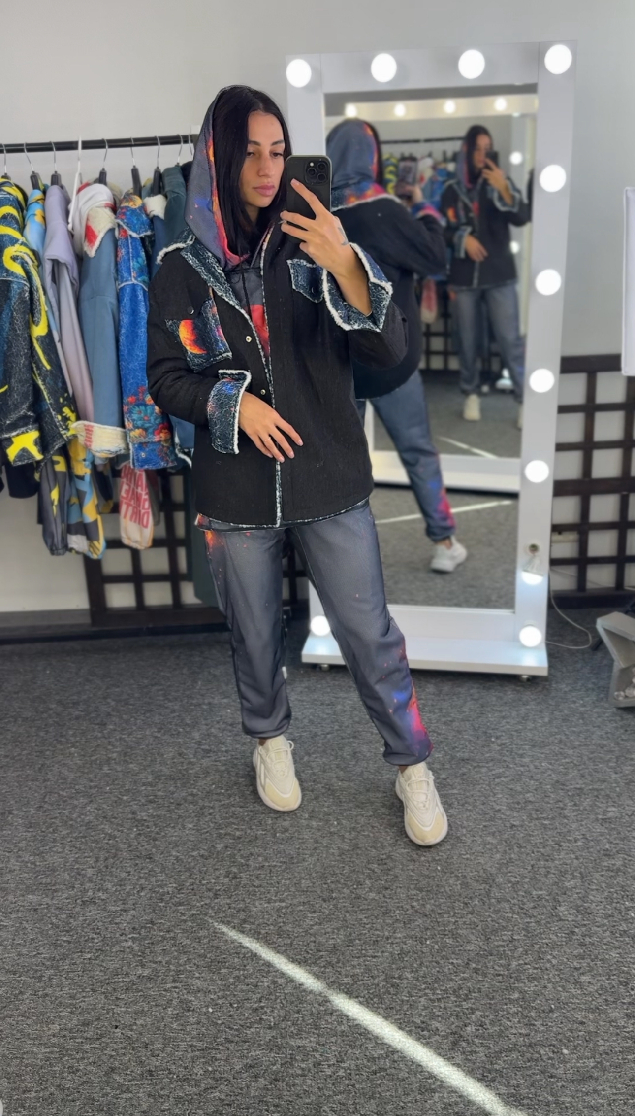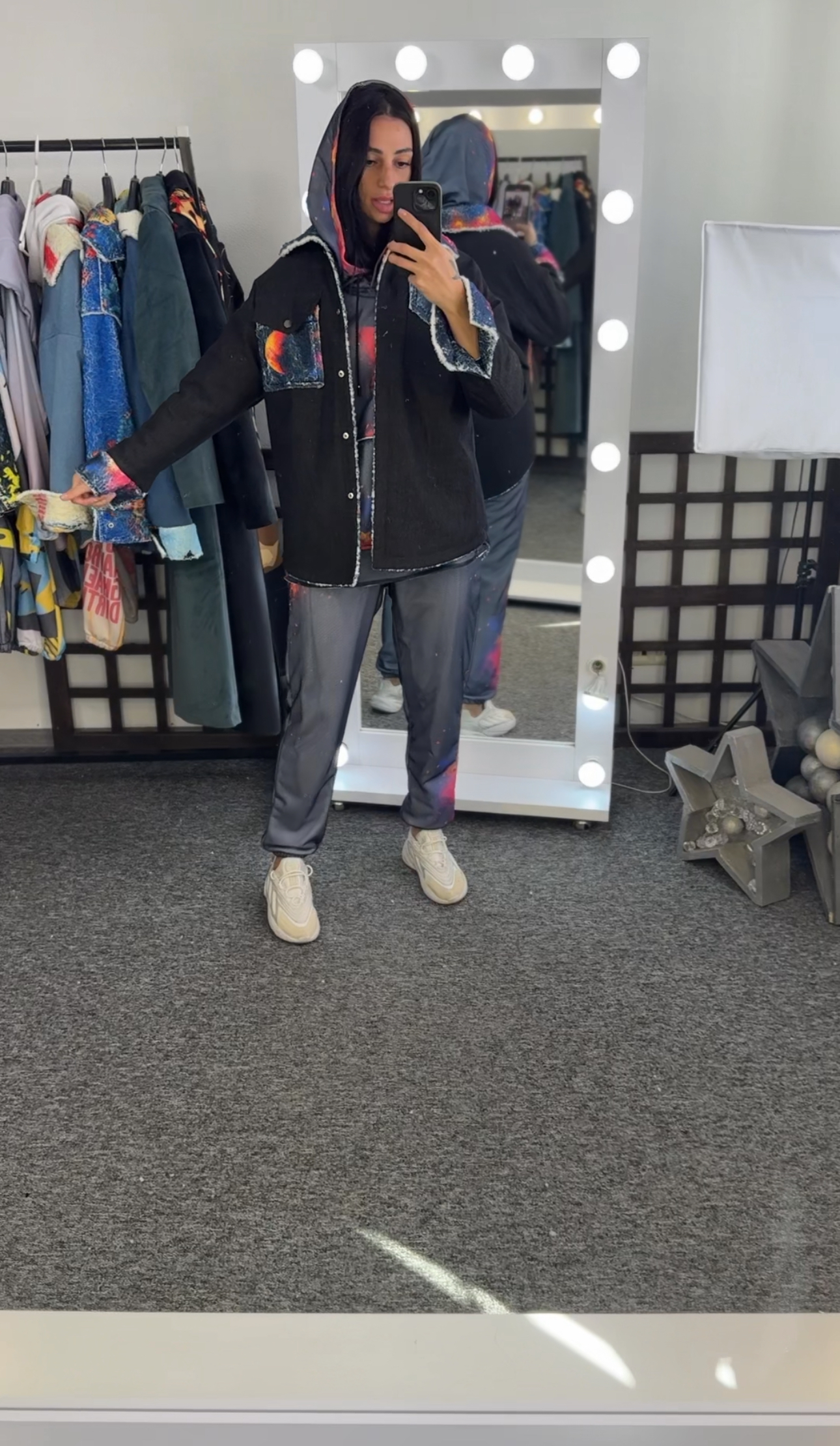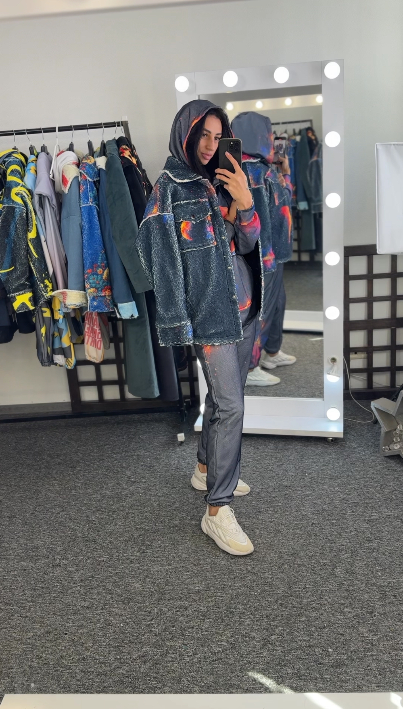 A double-sided straight-cut shirt is a stylish alternative to a light jacket. On the one hand, there is soft Teddy fur with an author’s print, on the other hand, jeans in a basic color. It transforms according to your mood, creating two images in oneproduct.