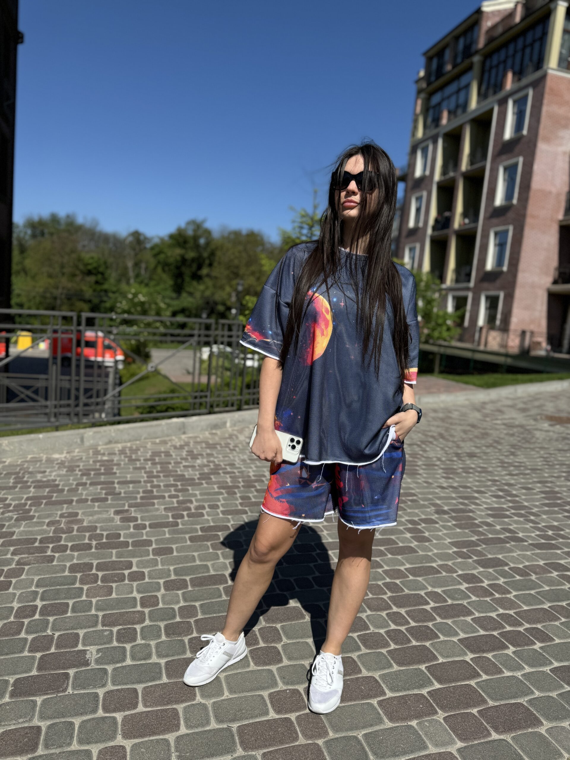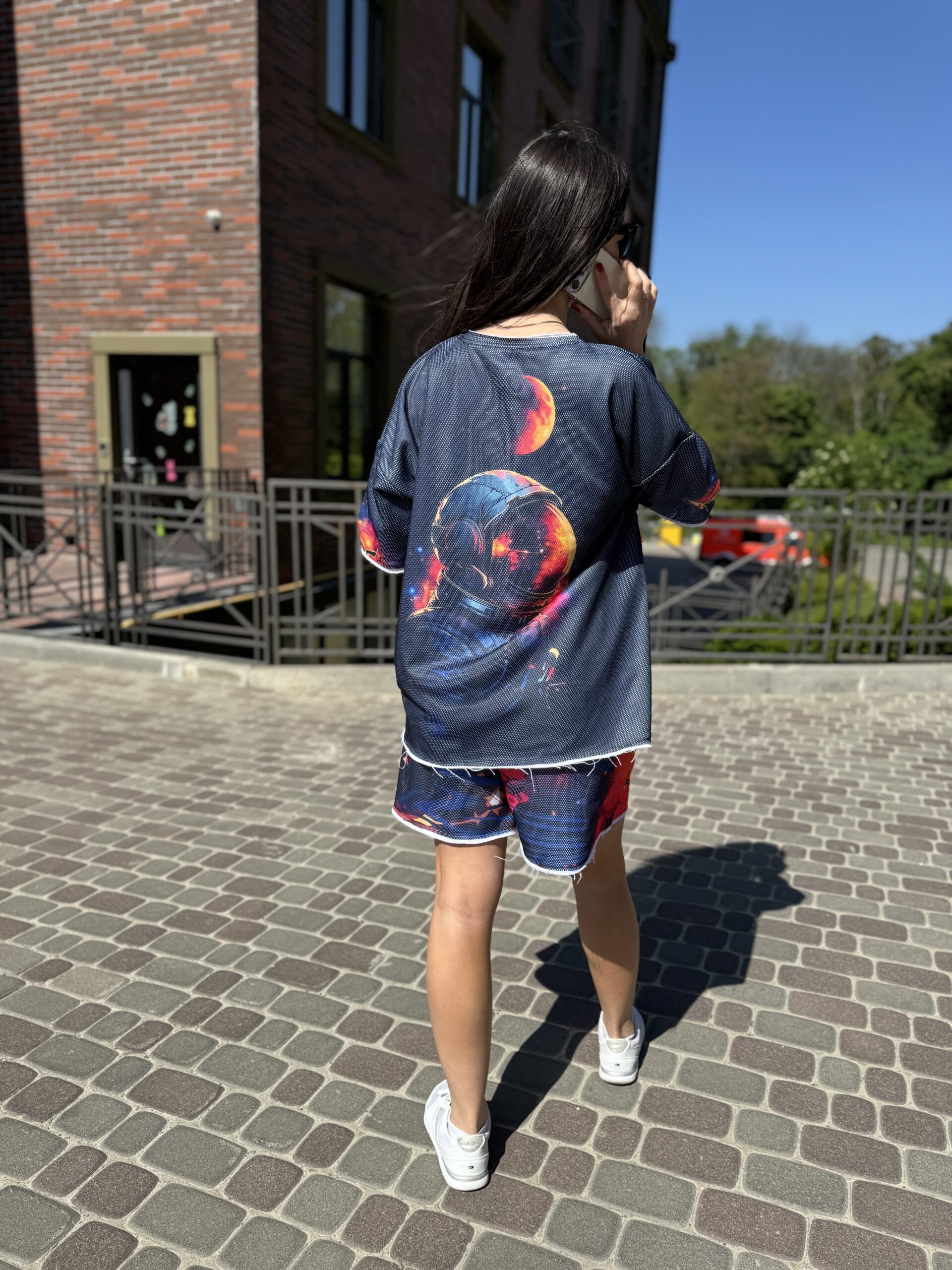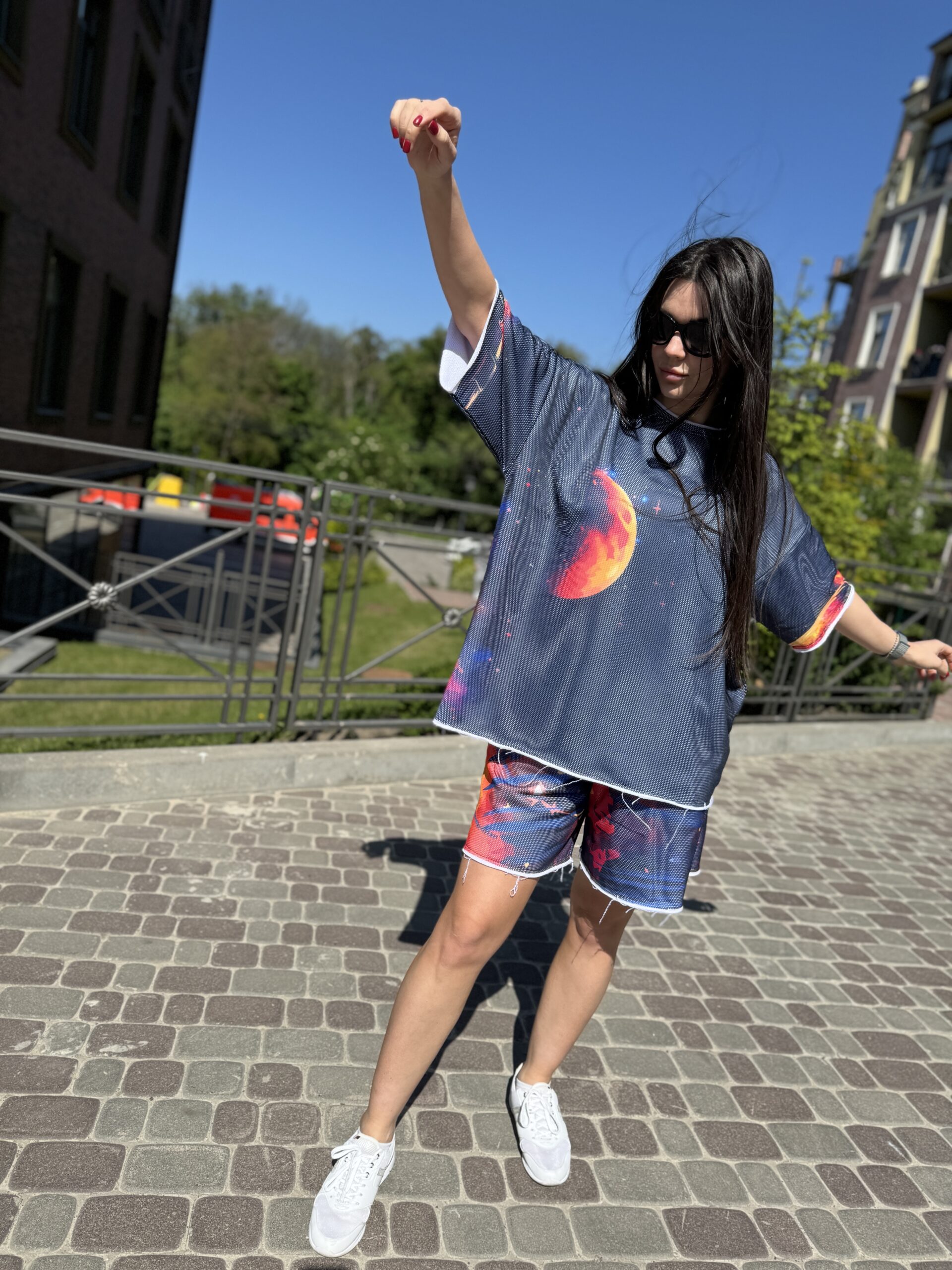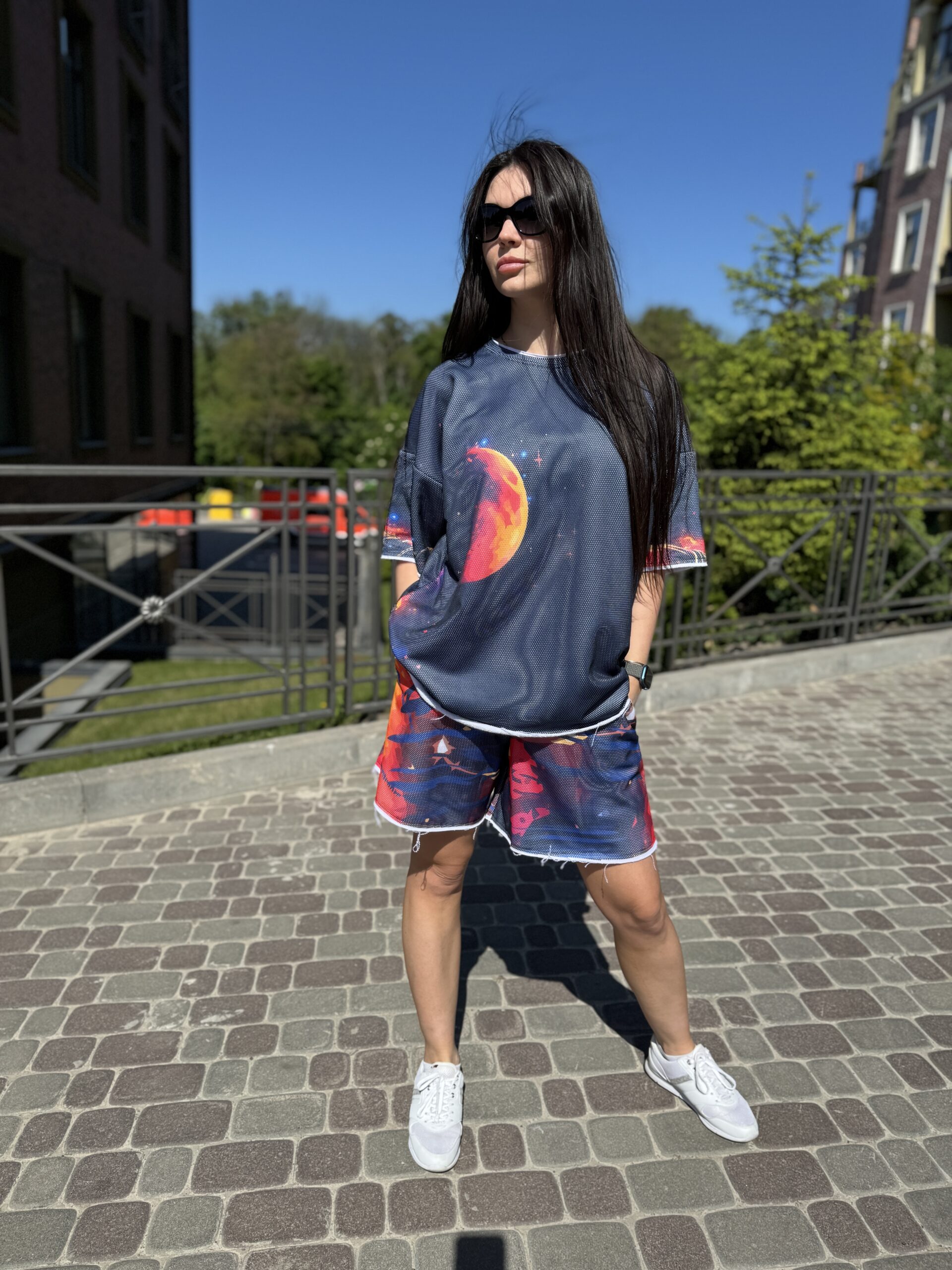 You are probably looking for: cotton suit, women’s summer suit, set with a T-shirt and shorts, clothing made of natural fabric, loose fit, designer suit, comfortable suit, cotton with mesh, suit with an original print, fashionable summer look