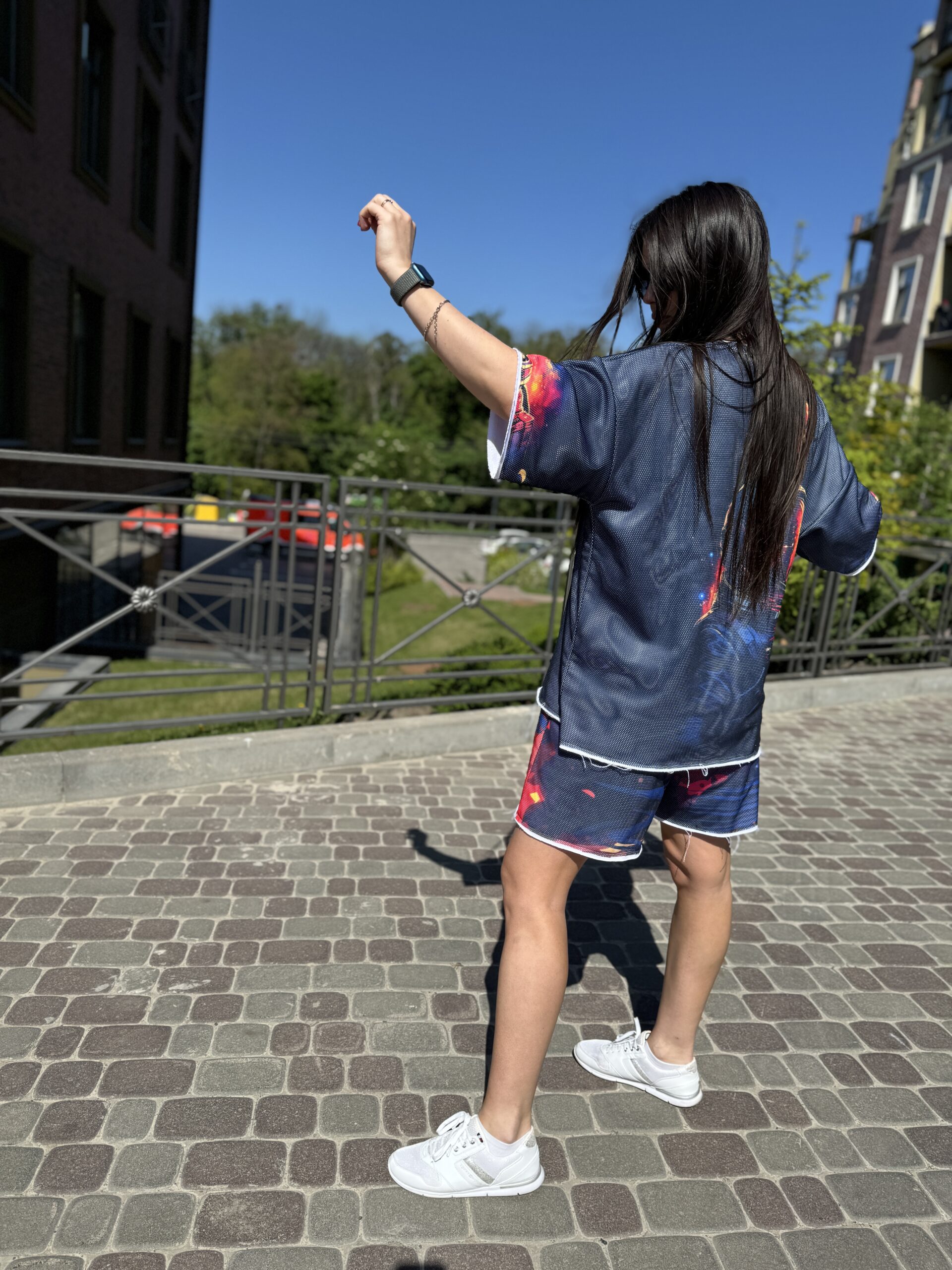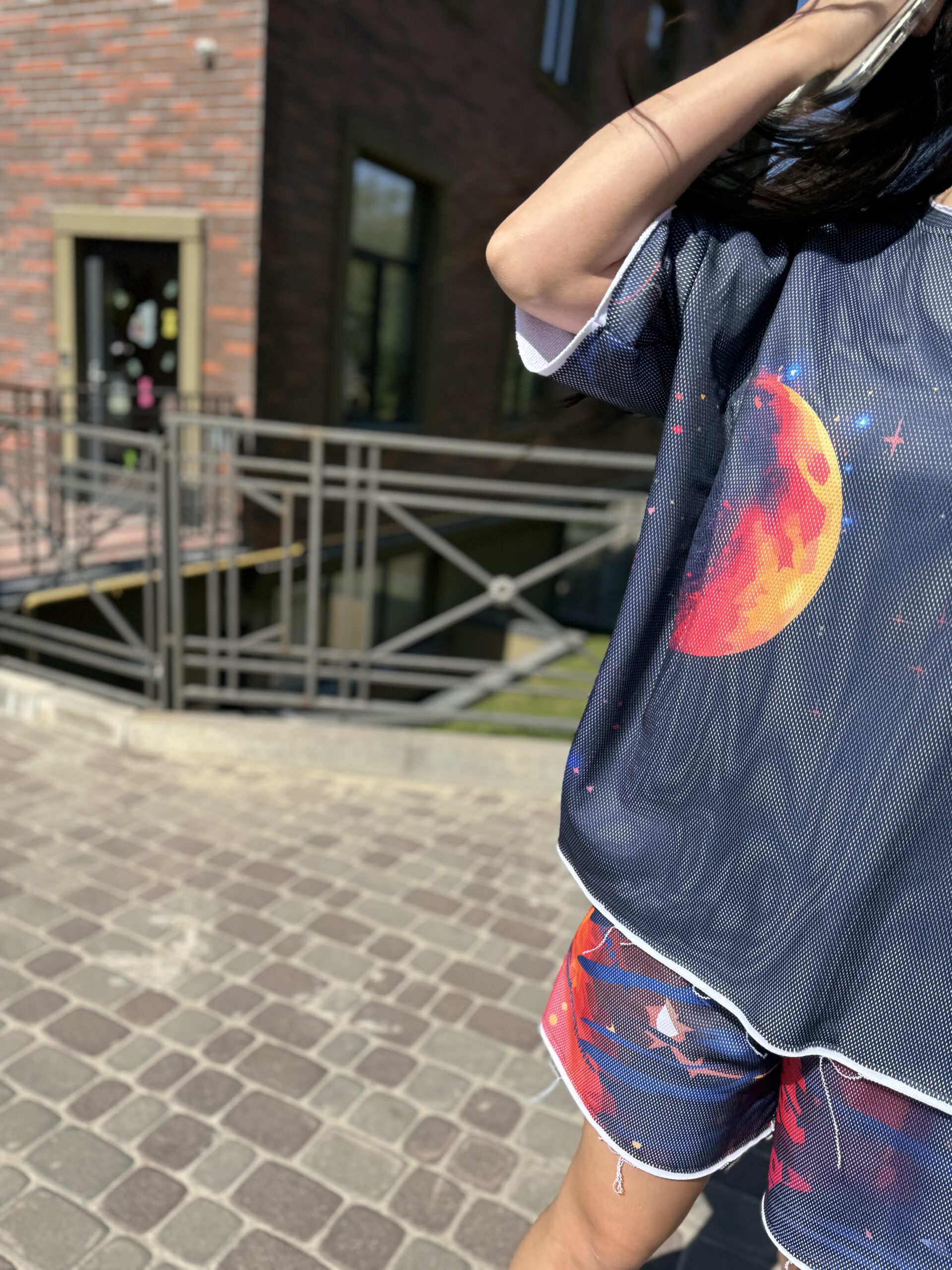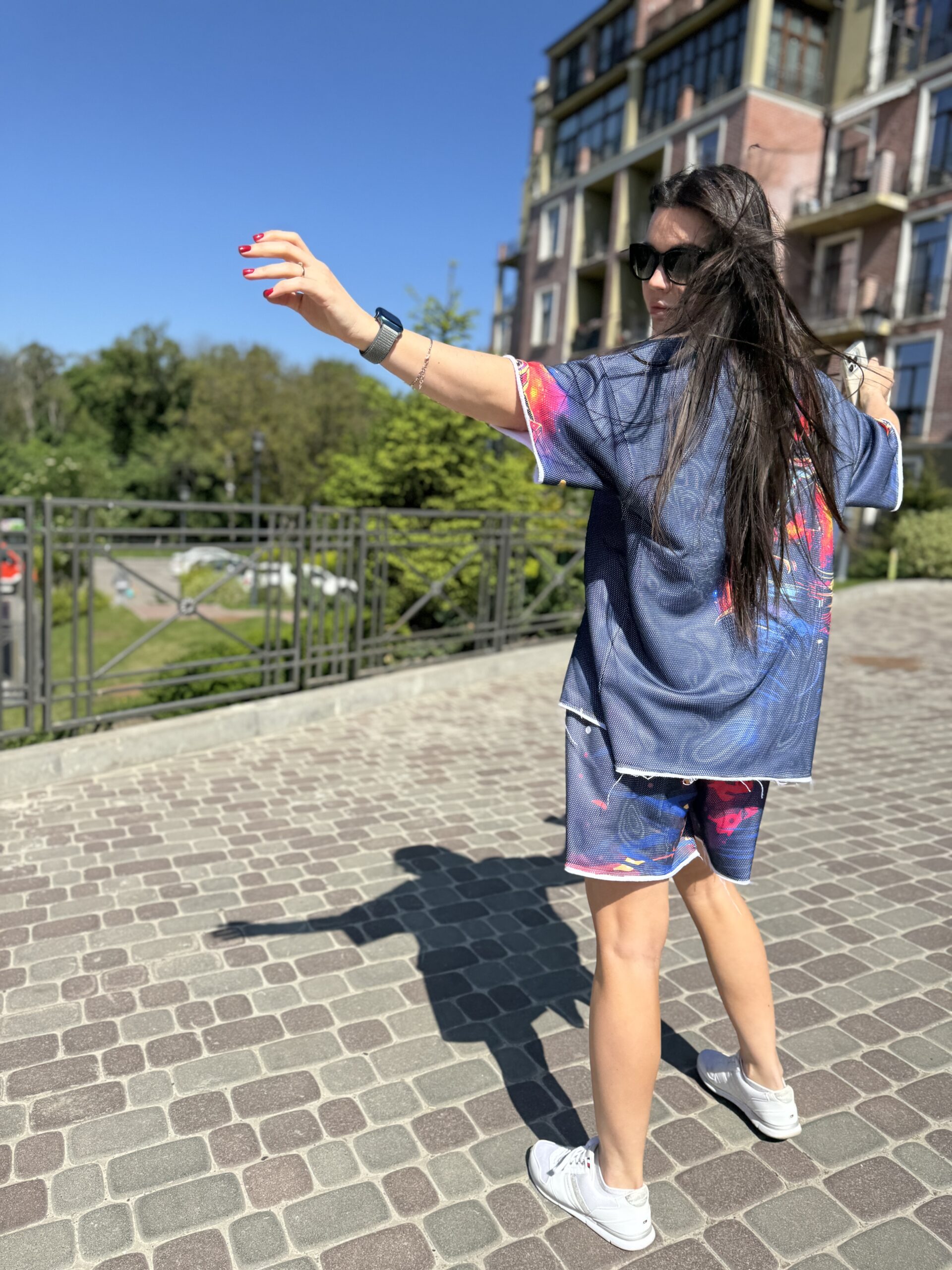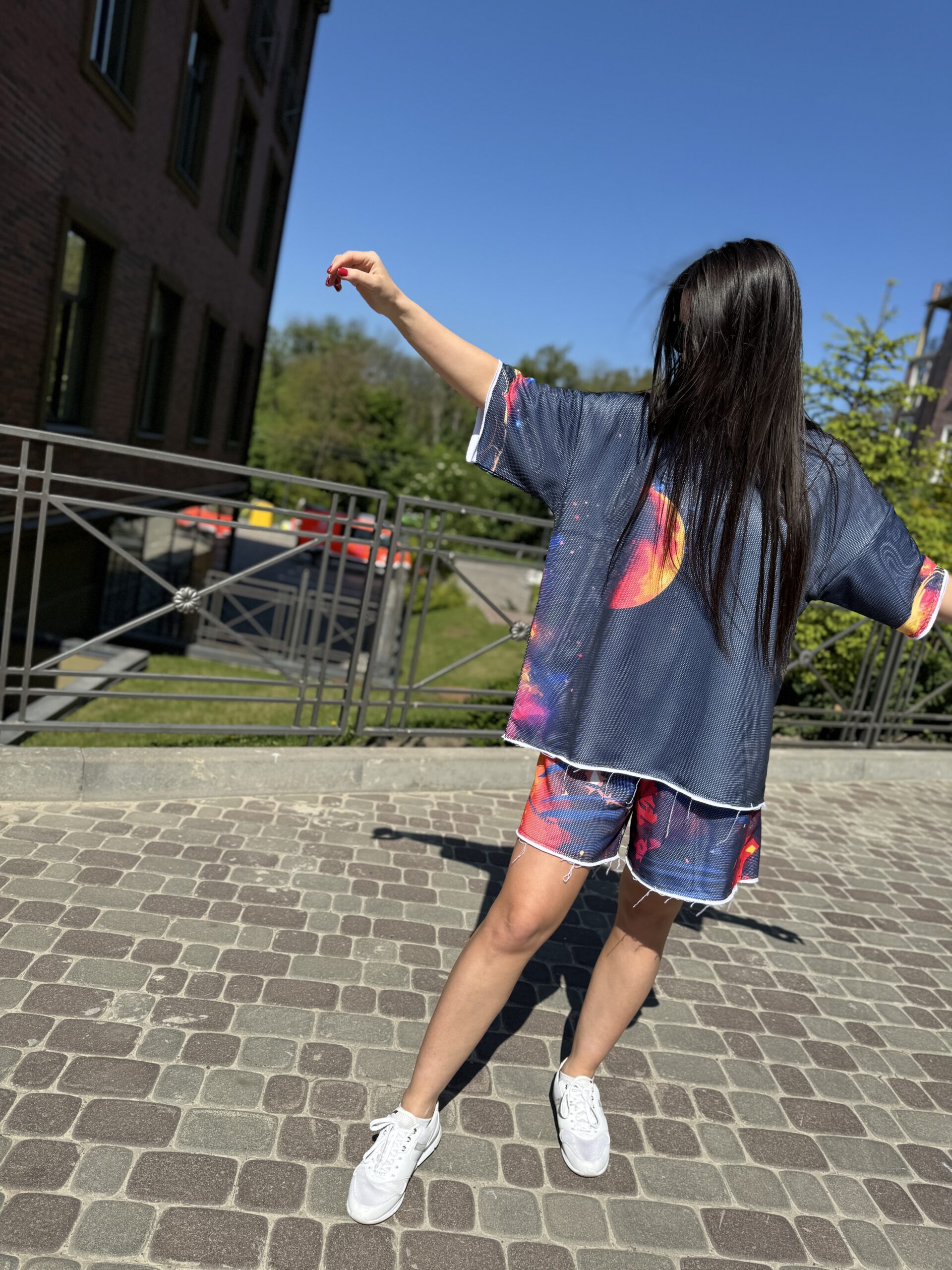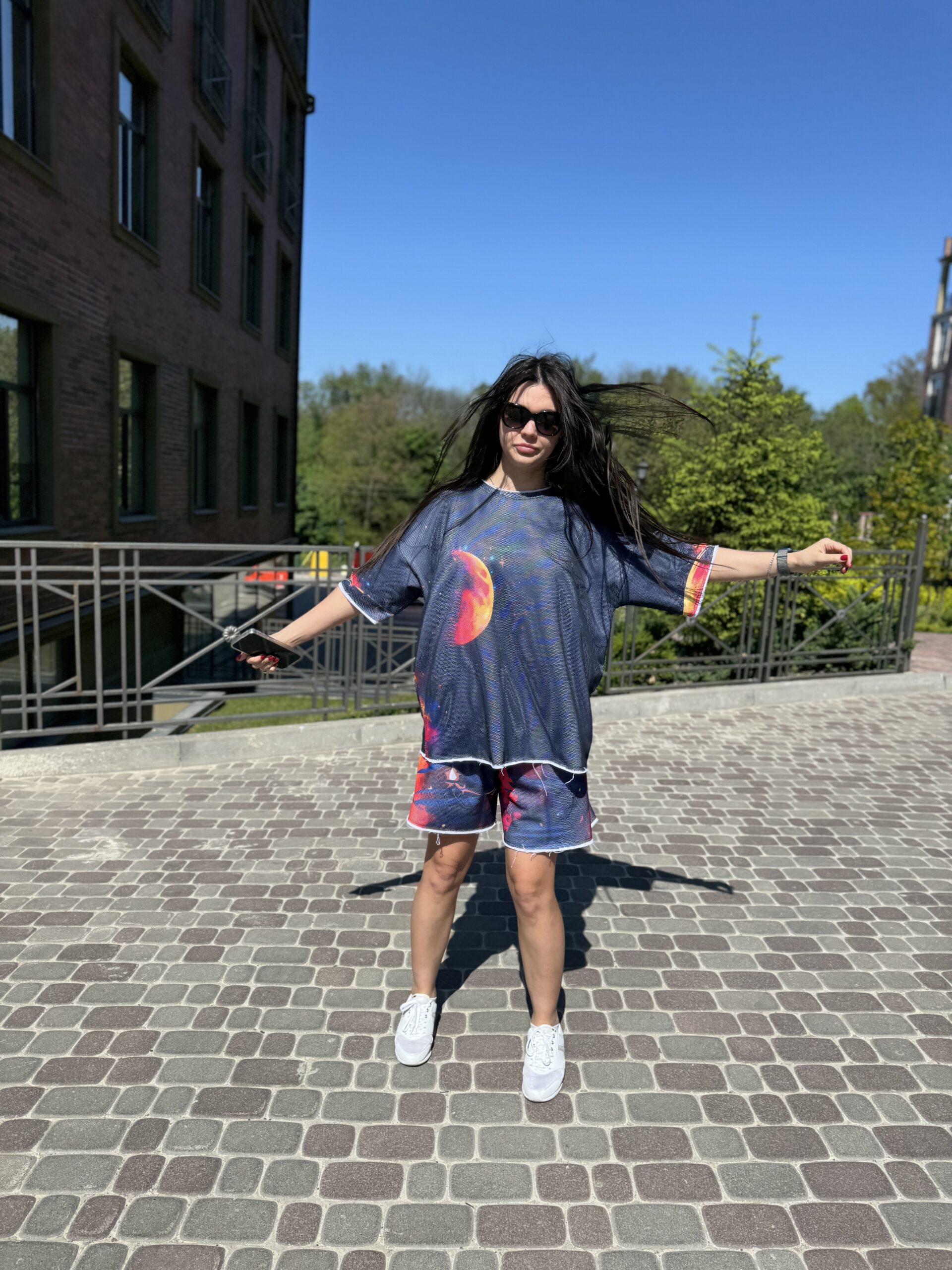 You are probably looking for: cotton suit, women’s summer suit, set with a T-shirt and shorts, clothing made of natural fabric, loose fit, designer suit, comfortable suit, cotton with mesh, suit with an original print, fashionable summer look