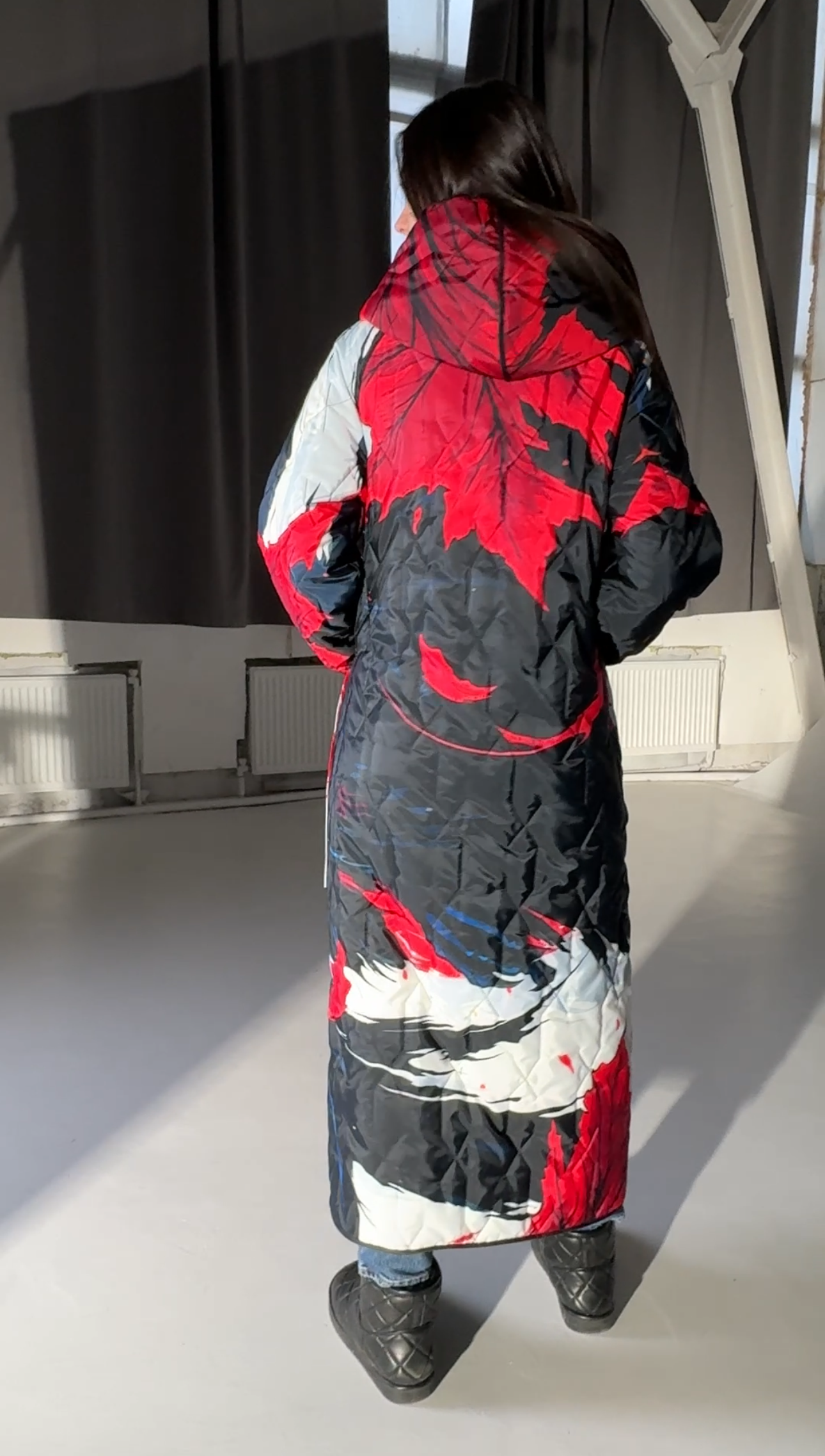A double-sided quilted coat is a stylish multifunctional model that allows you to change the look depending on your mood. One side is classic black, the other is with a bright author’s print that adds uniqueness and character.