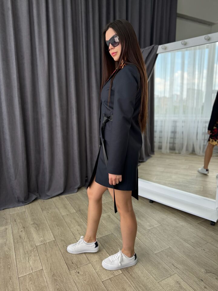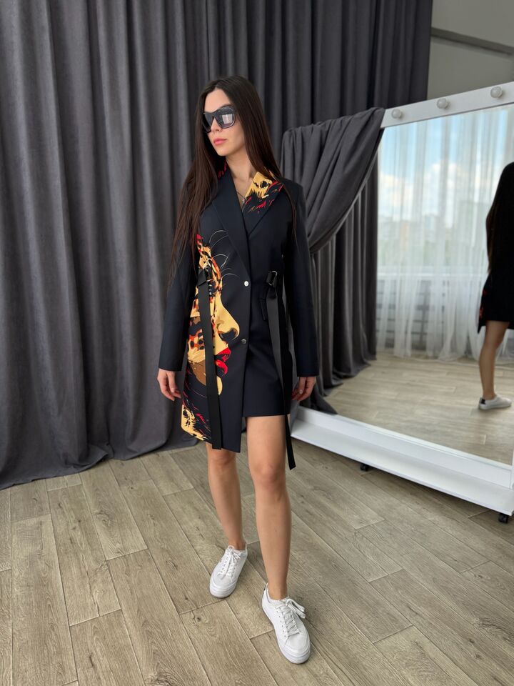 Asymmetrical cut jacket dress is a stylish and versatile item that is ideal for both everyday use and special events. It combines the comfort of a classic jacket and the femininity of a dress.