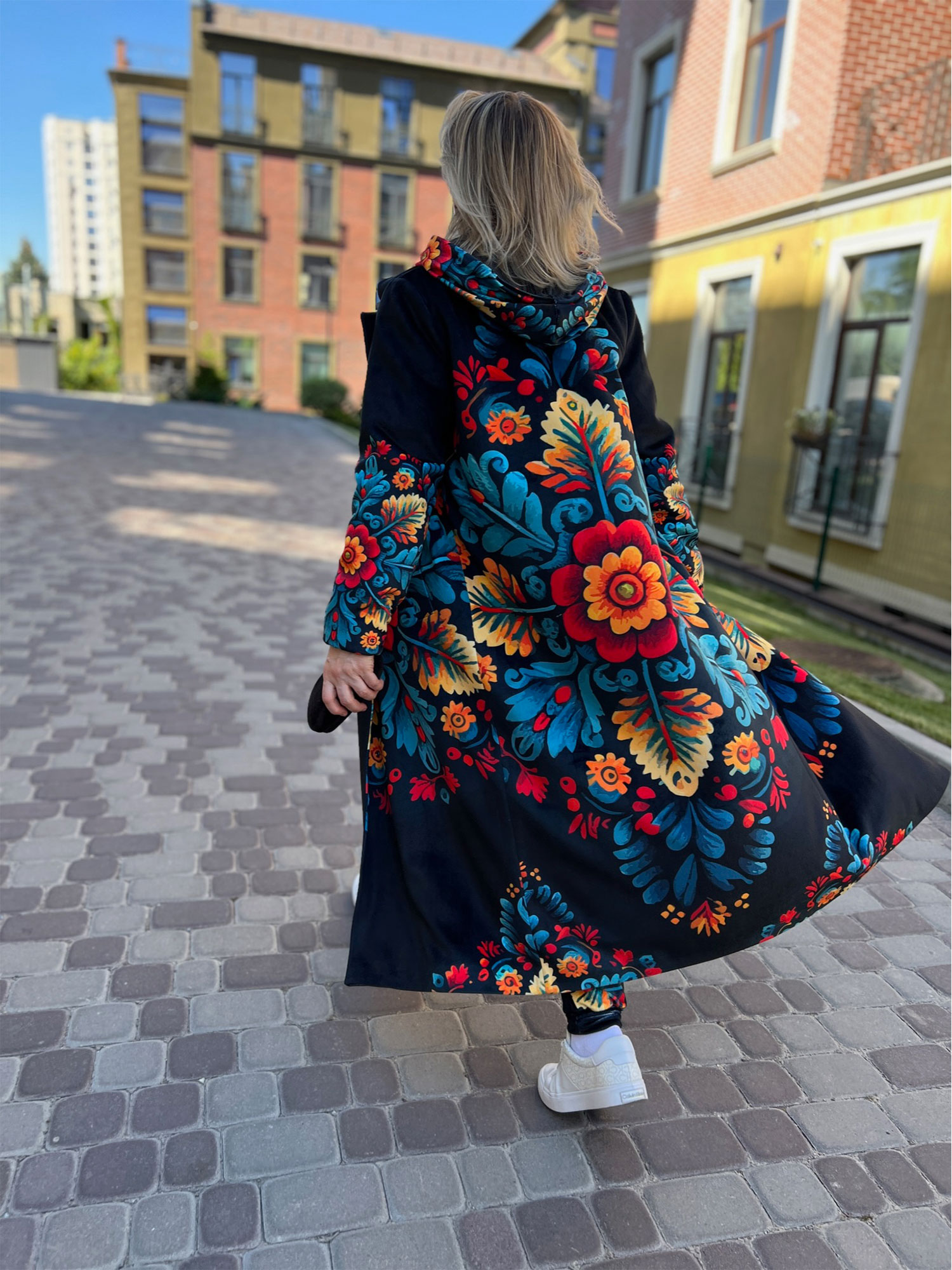 Perhaps you are looking for: velor coat, coat without a hood, stylish coat spring autumn, women’s coat with buttons, coat with lining, light insulated coat, designer coat, author’s print, straight-cut coat, off-season coat