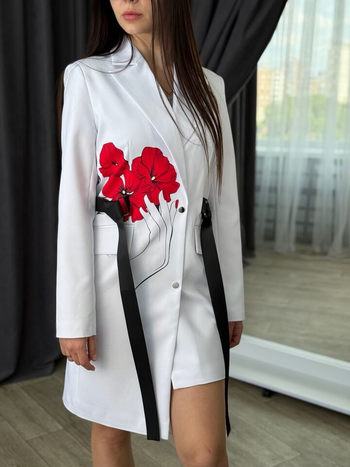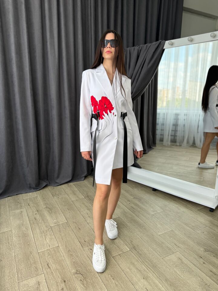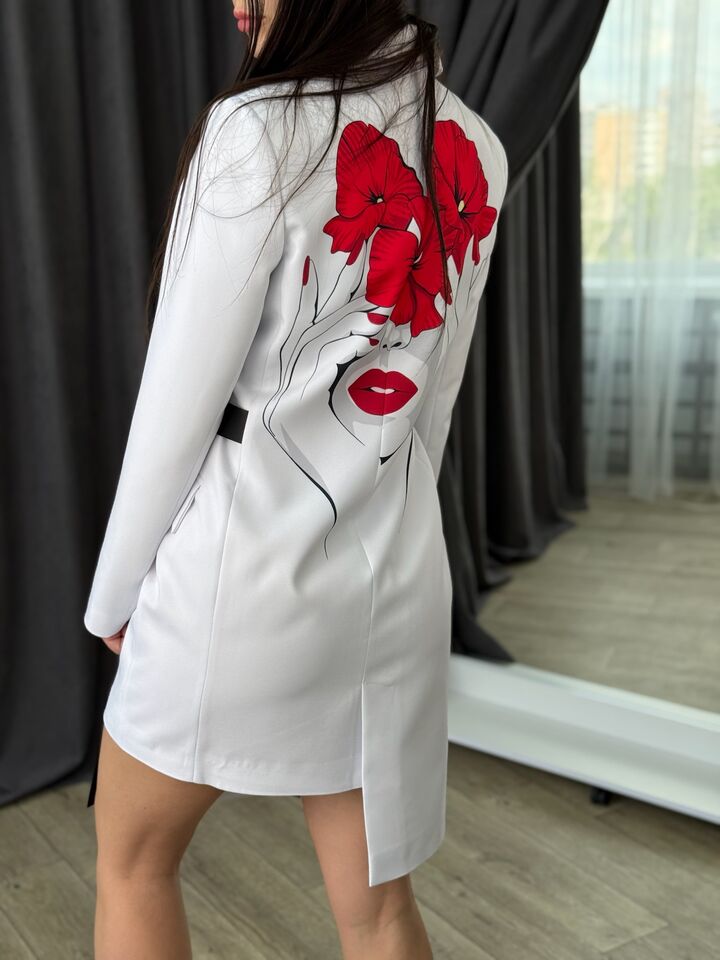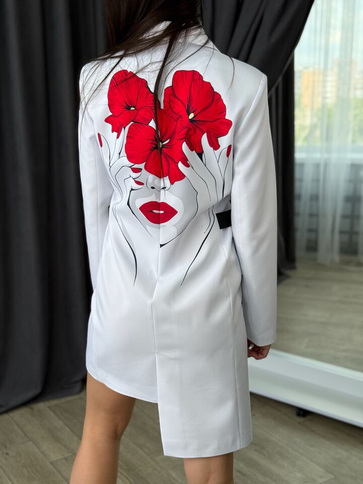 Asymmetrical cut jacket dress is a stylish and versatile item that is ideal for both everyday use and special events. It combines the comfort of a classic jacket and the femininity of a dress.