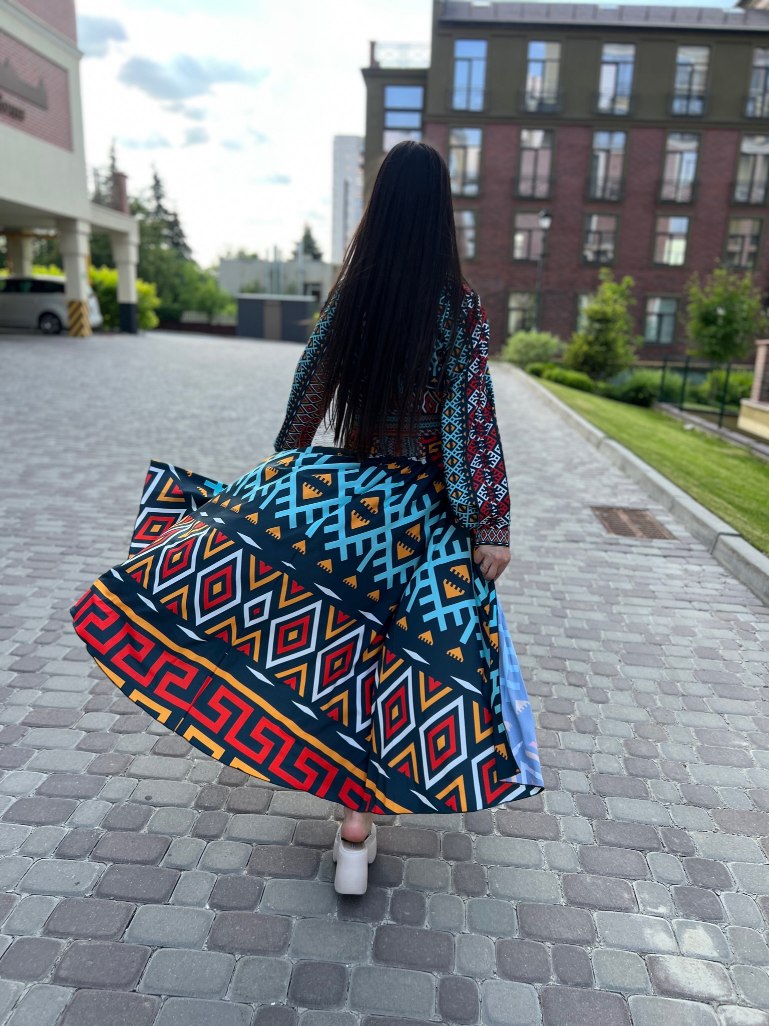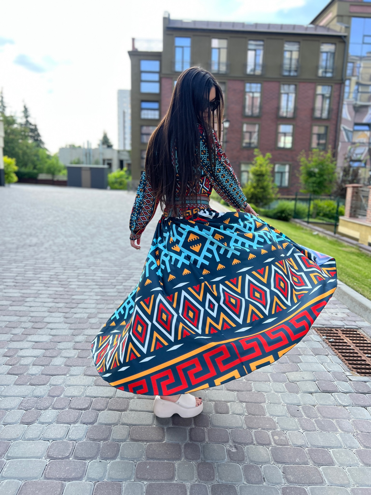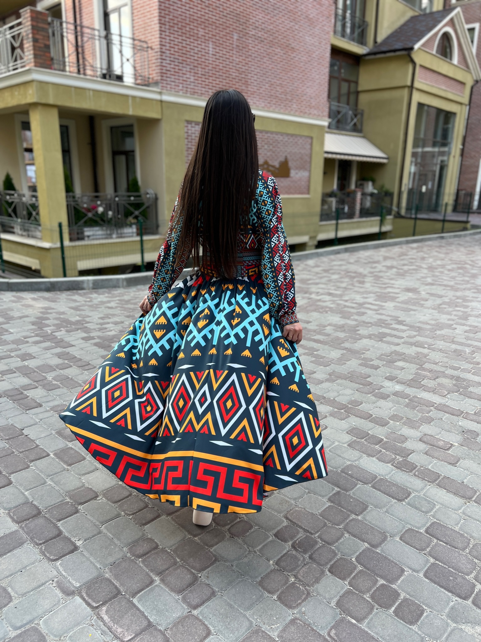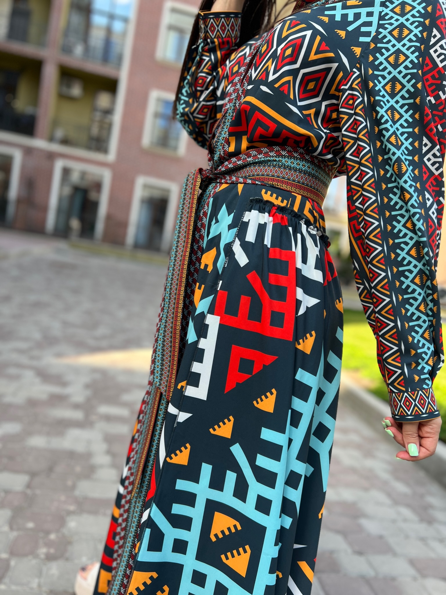 Długa suknia damska, wzór geometryczny