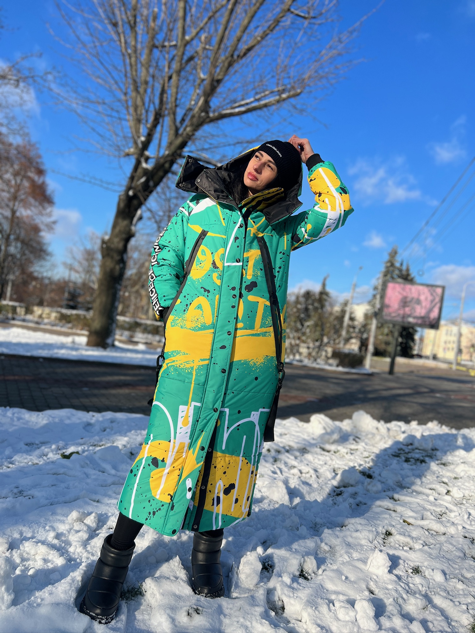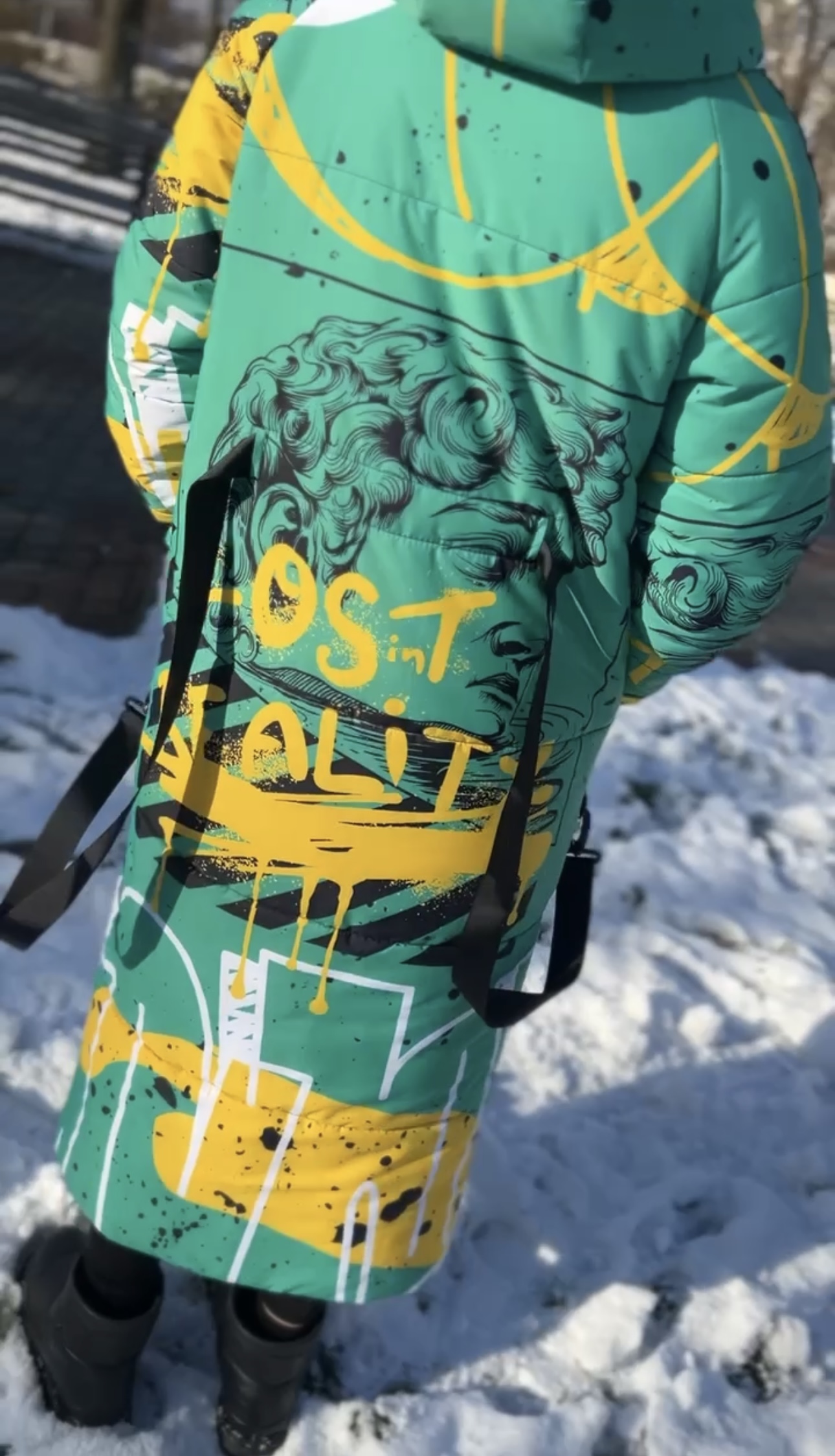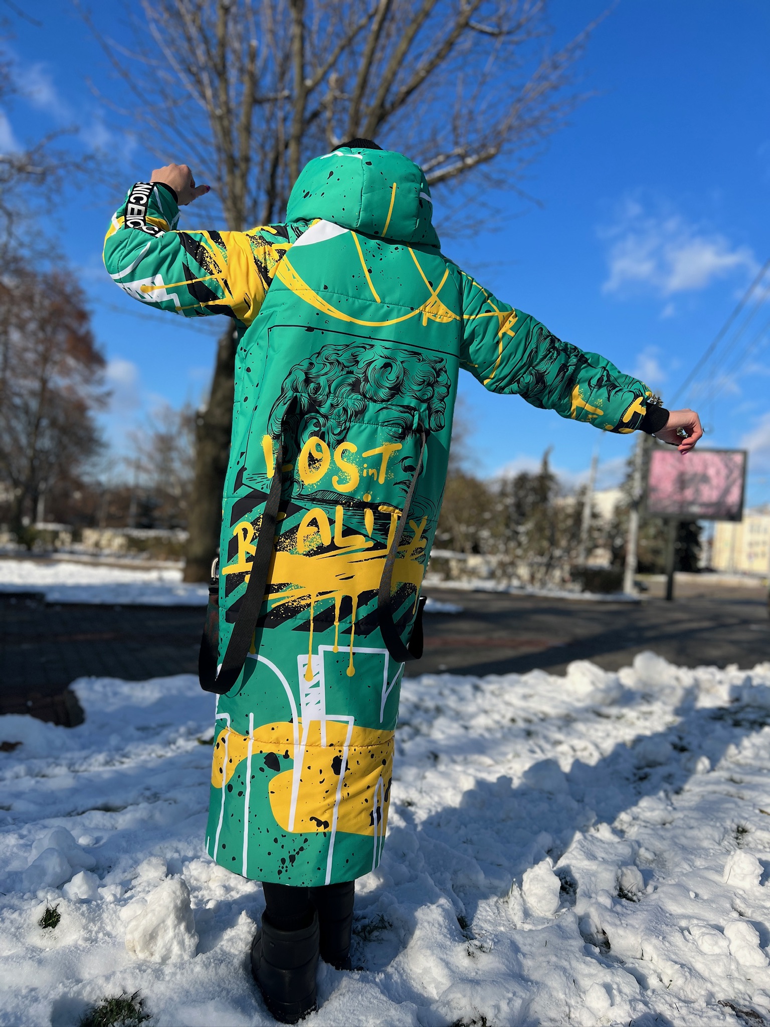 Damska kurtka zimowa o prostym kroju z kapturem to połączenie technologii, ciepła i designerskiego podejścia. Dzięki gumowanym zamkom, głębokim kieszeniom, ochronie przed wilgocią i izolacji 250-fill będzie to idealny wybór na chłodne zimy. A dzięki autorskiemu drukowi całość wygląda niepowtarzalnie, nietypowo i ekspresyjnie.