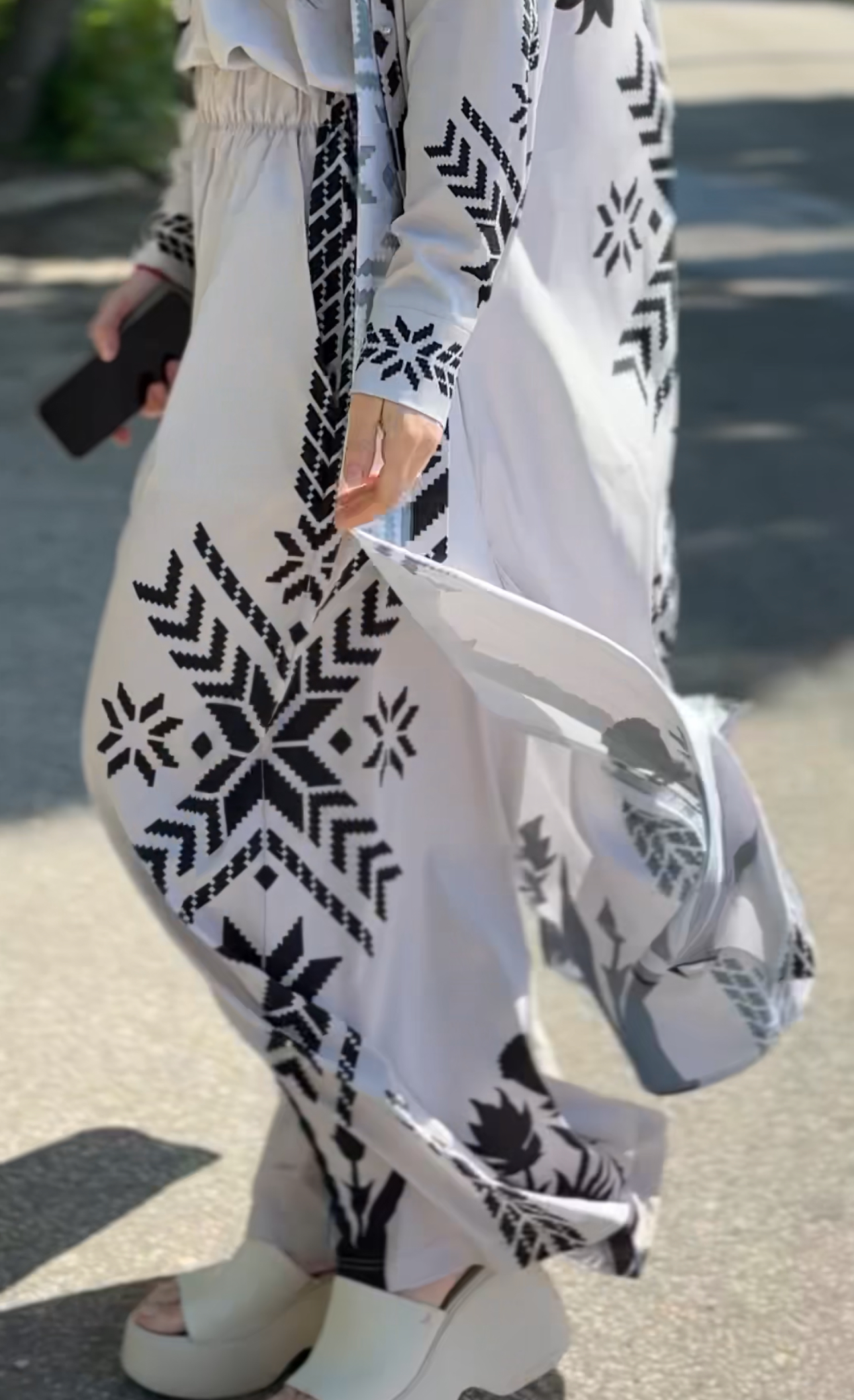 Elegancki damski garnitur, beżowy z nadrukiem narodowym