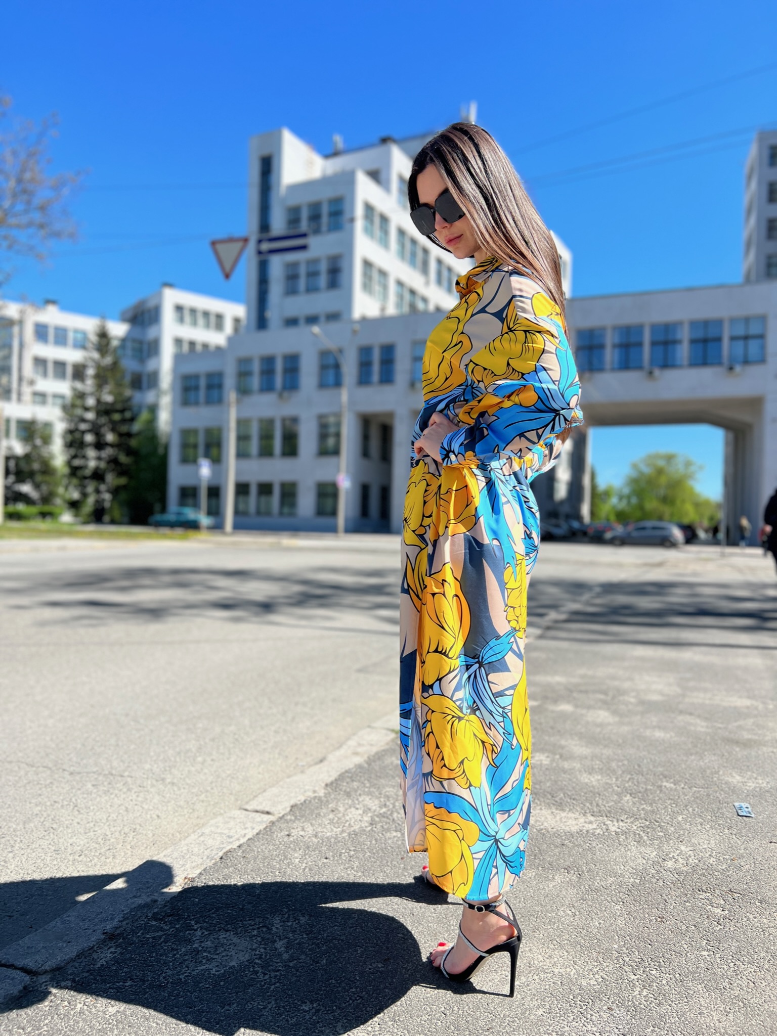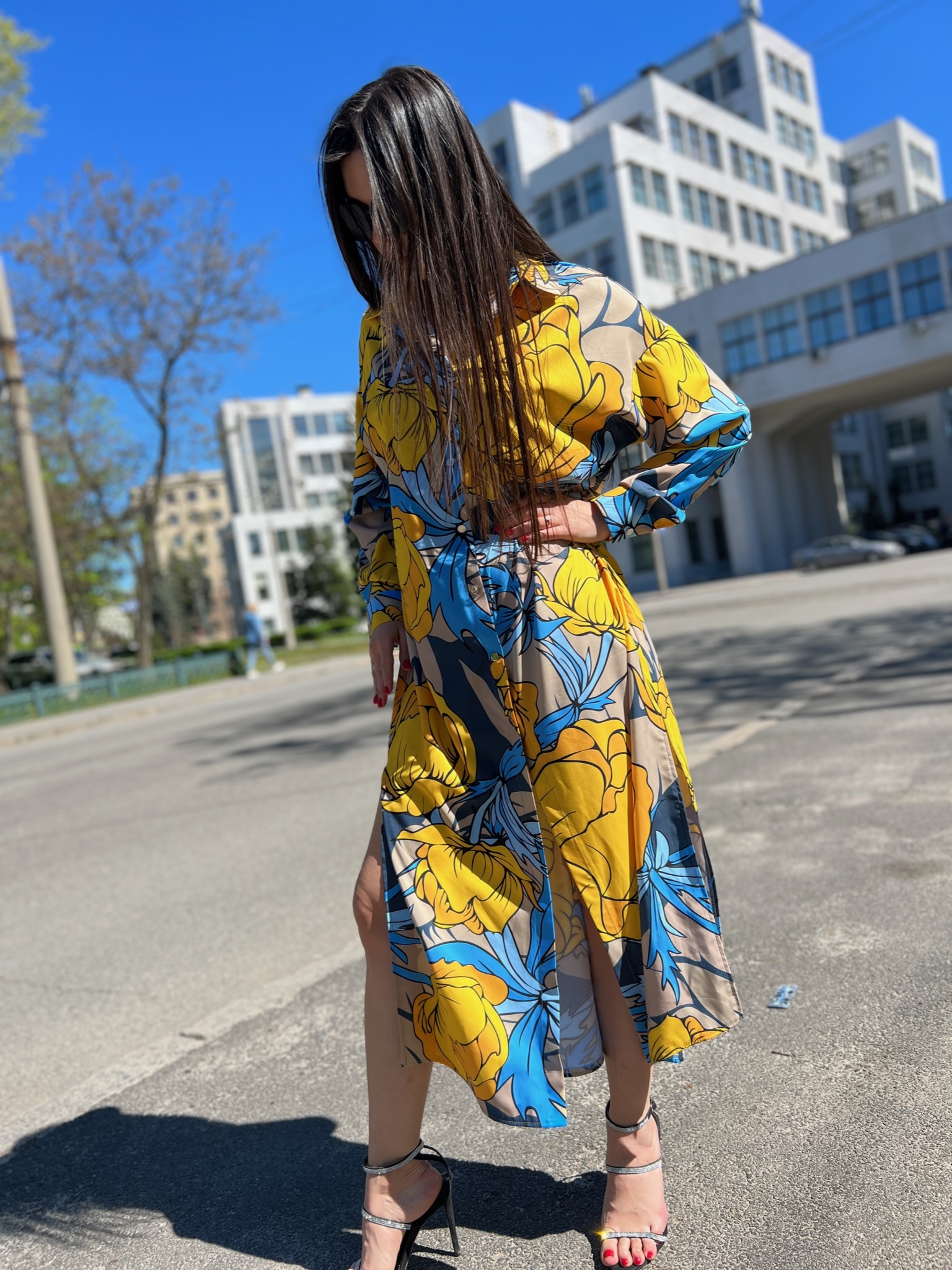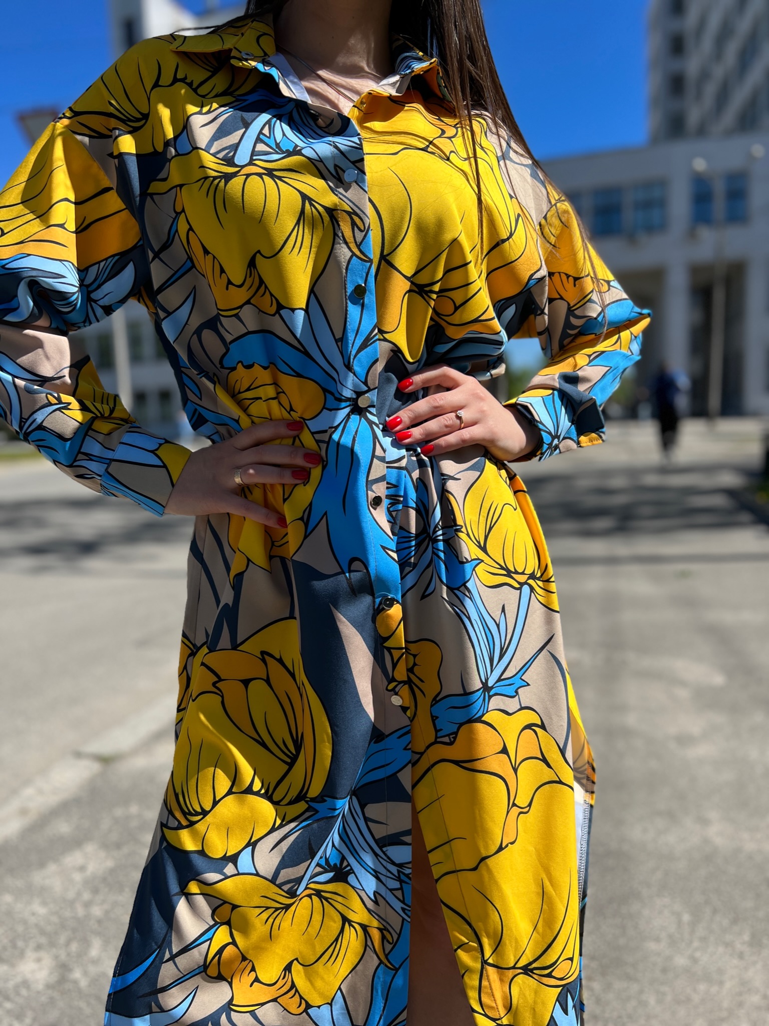 Sukienka – koszula, długa z paskiem, żółto-niebieska z kwiatami