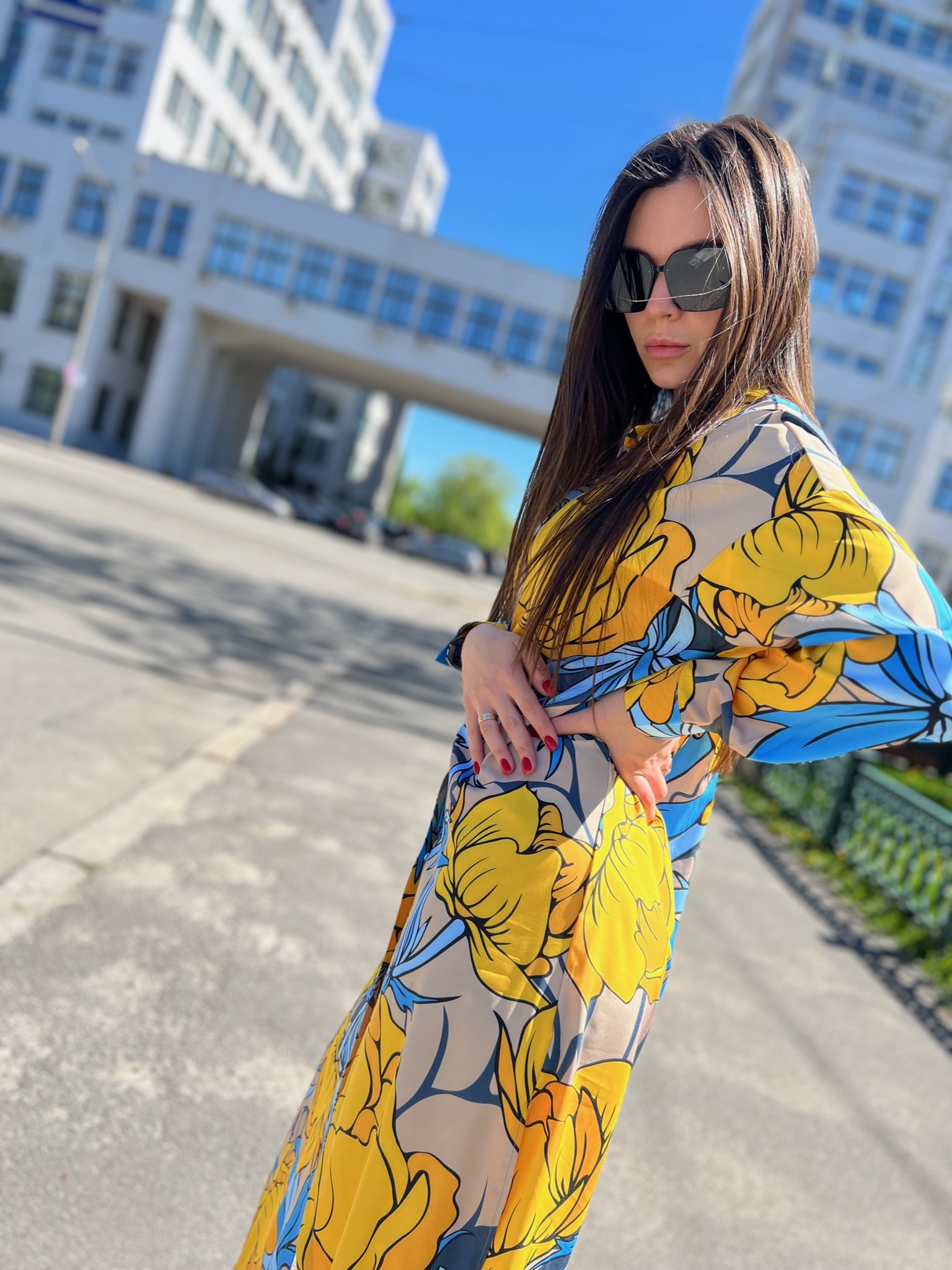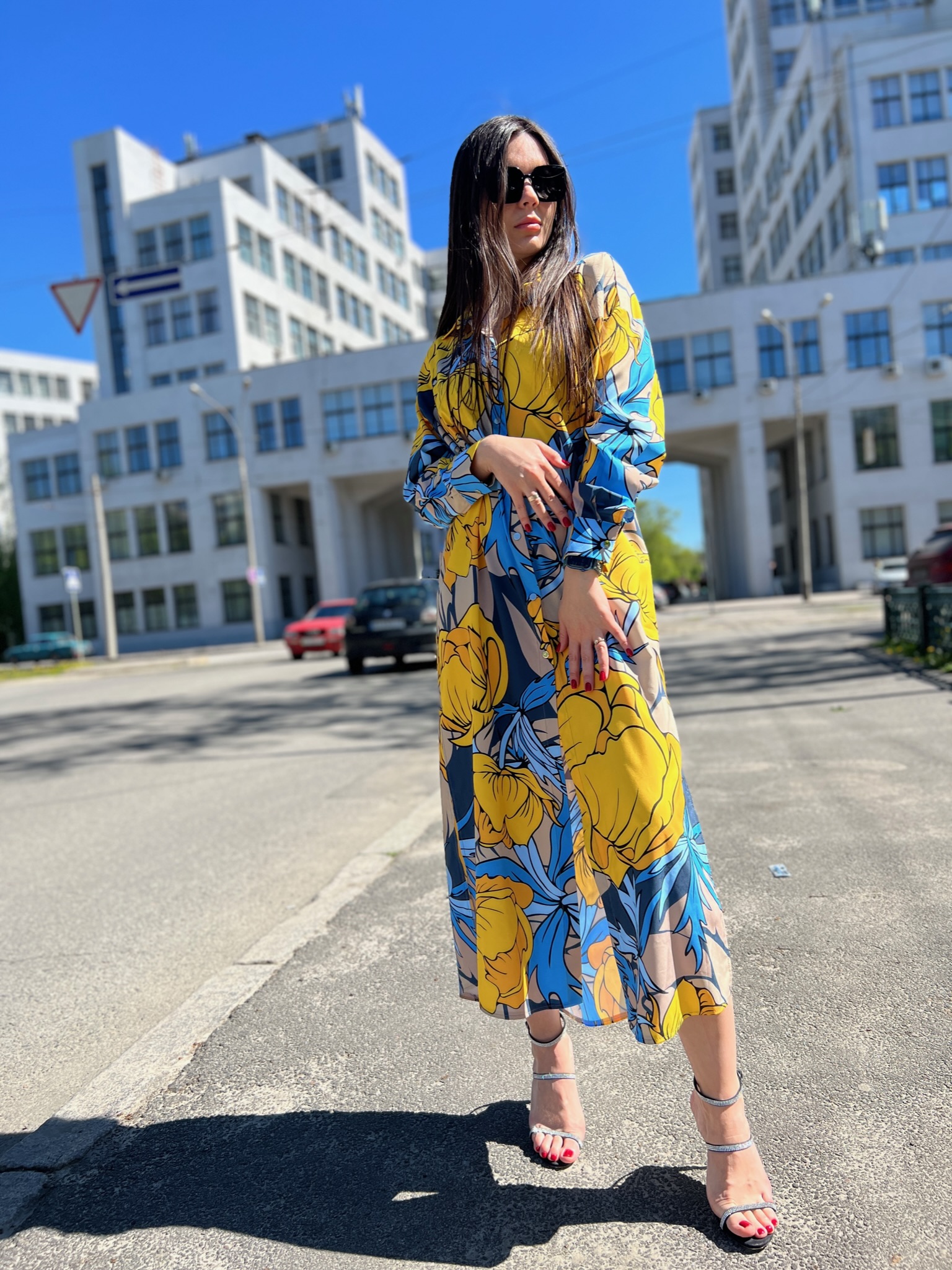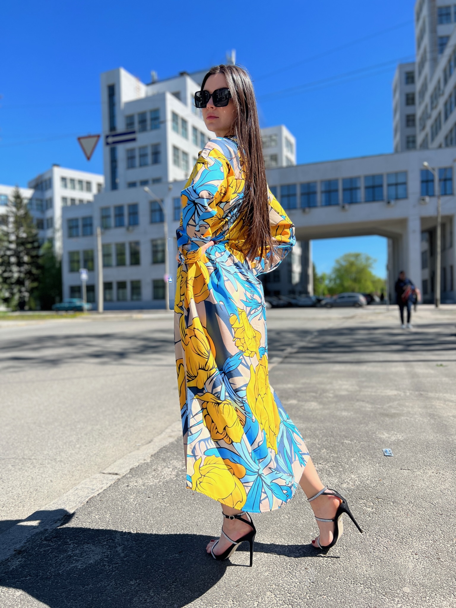 Sukienka – koszula, długa z paskiem, żółto-niebieska z kwiatami