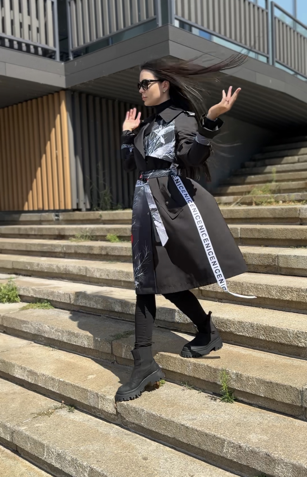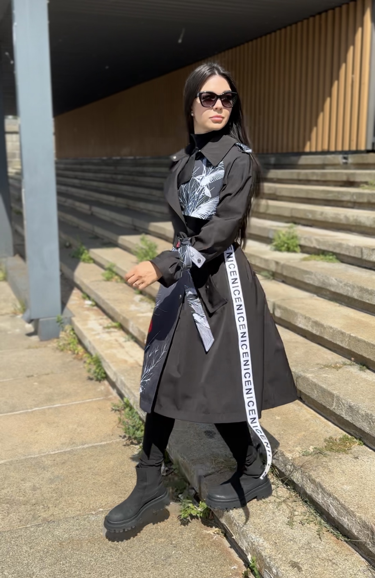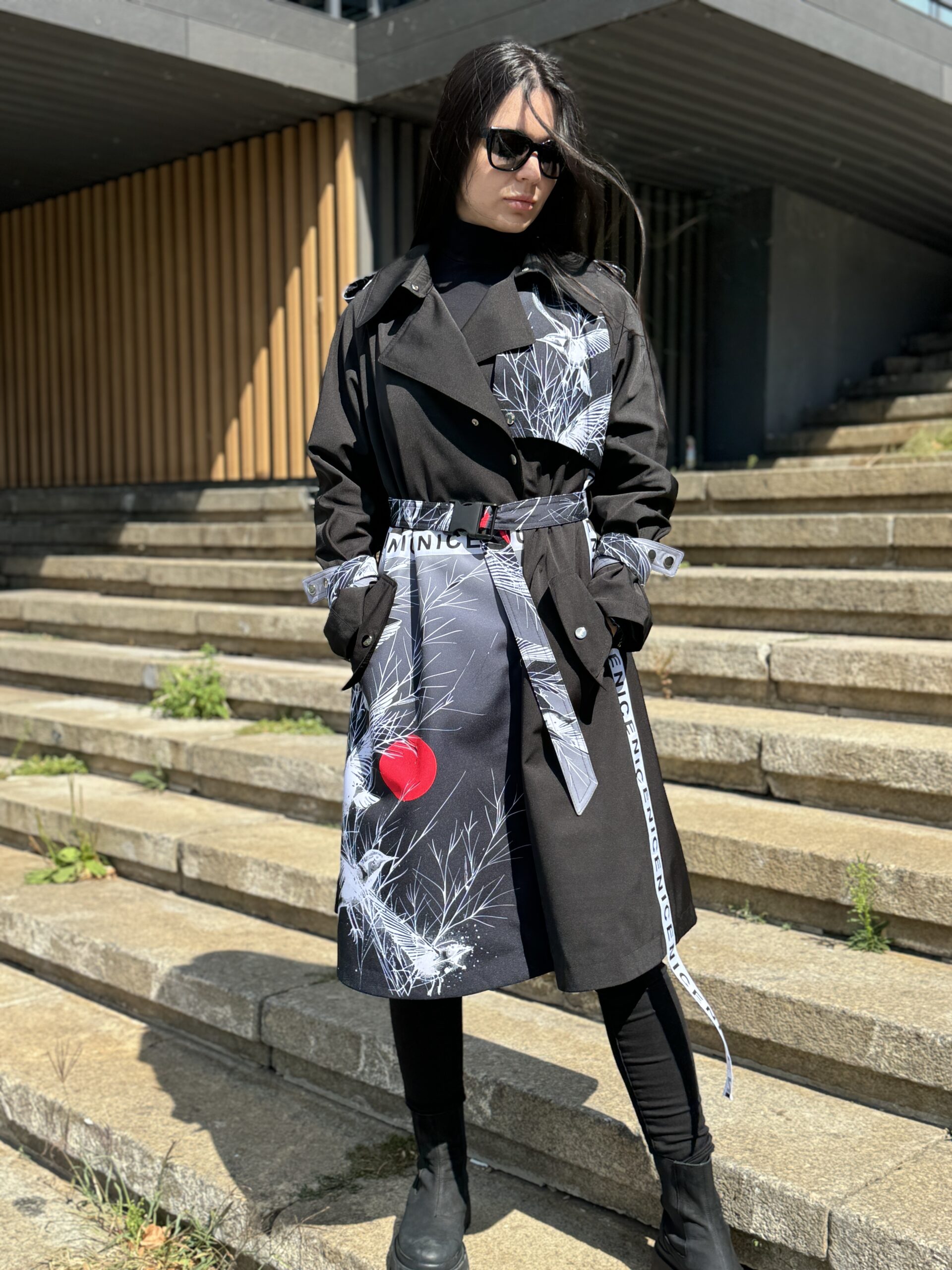 Dzięki bazowemu kolorowi w połączeniu z oryginalnymi, nadrukowanymi wstawkami, trencz wygląda oryginalnie, drogo i modnie. Luźny krój sprawia, że jest wygodny, a pasek pozwala zmieniać sylwetkę — od swobodnej po kobiecą.