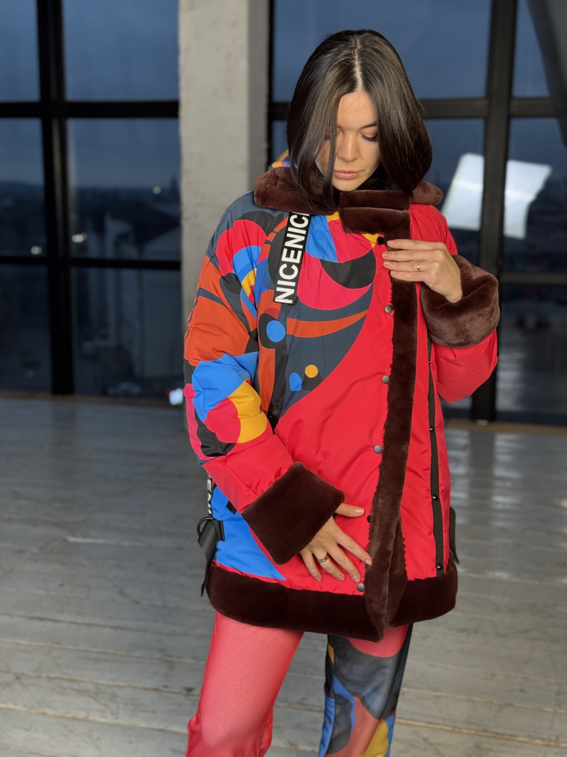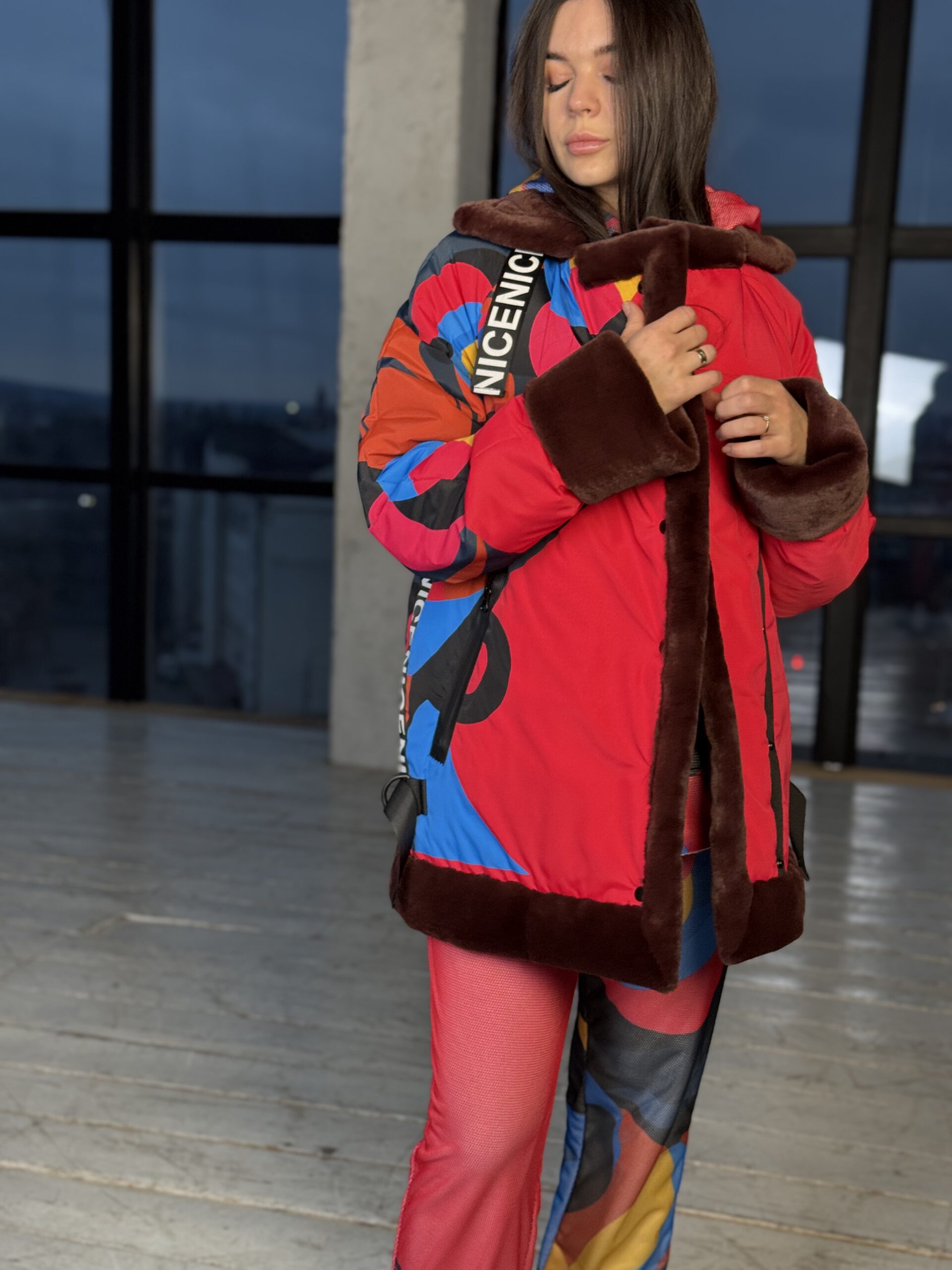 • Połączenie jasnego, designerskiego nadruku i eko-futra wygląda stylowo i drogo