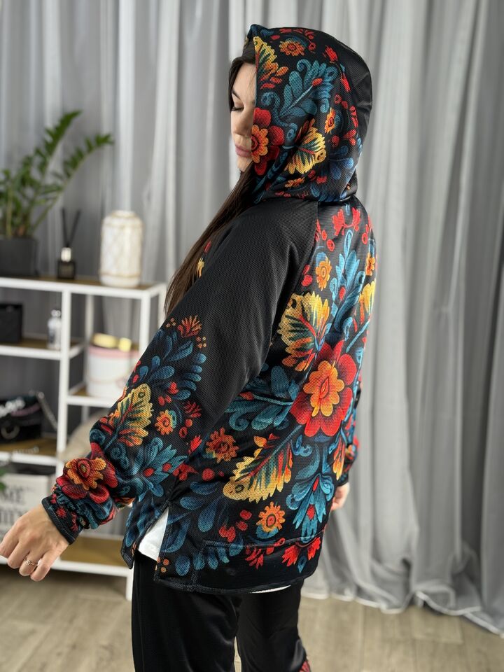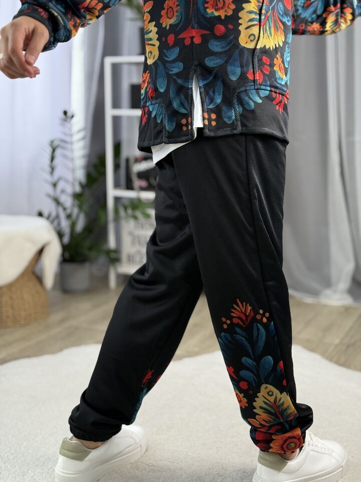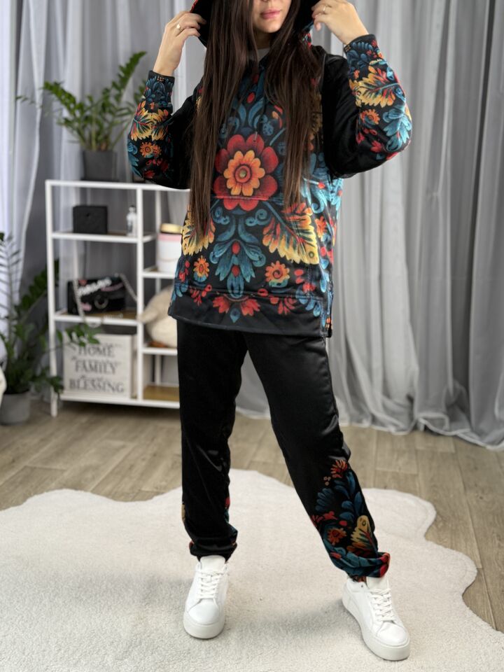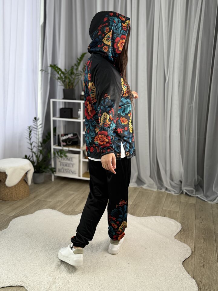 Худі вільного крою із капюшоном, кишеня “кенгуру”, рукава регланом, довжина по спинці – 70 см, довжина рукава від горловини — 73 см. Фасон штанів  – джогери із еластичною резинкою знизу, є кишені, довжина по зовнішньому шву від поясу 105 см.