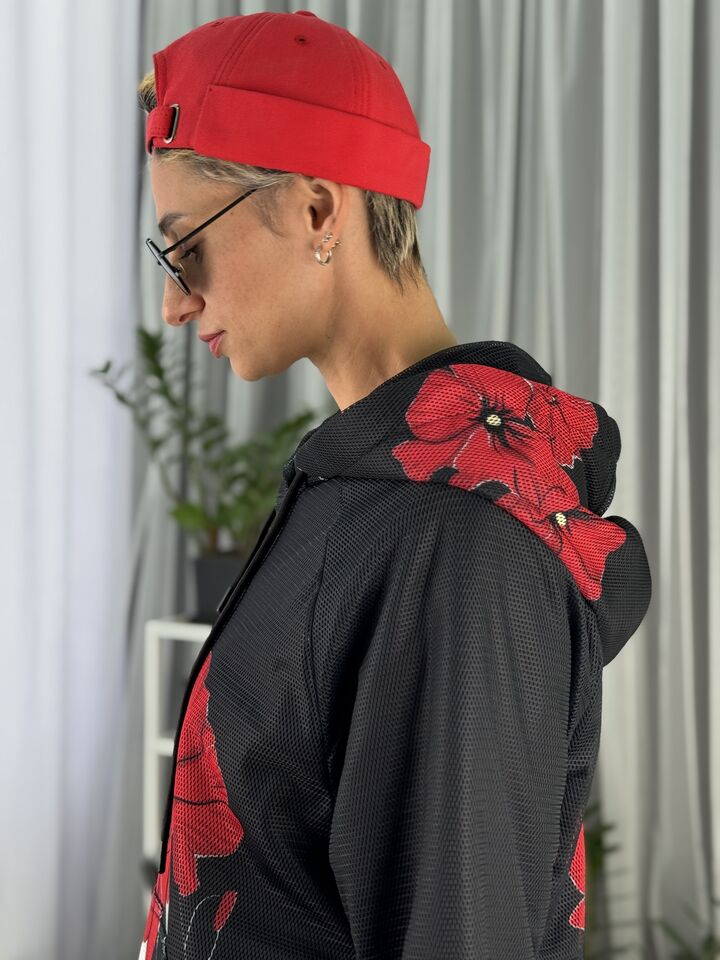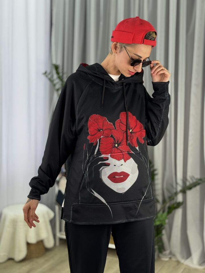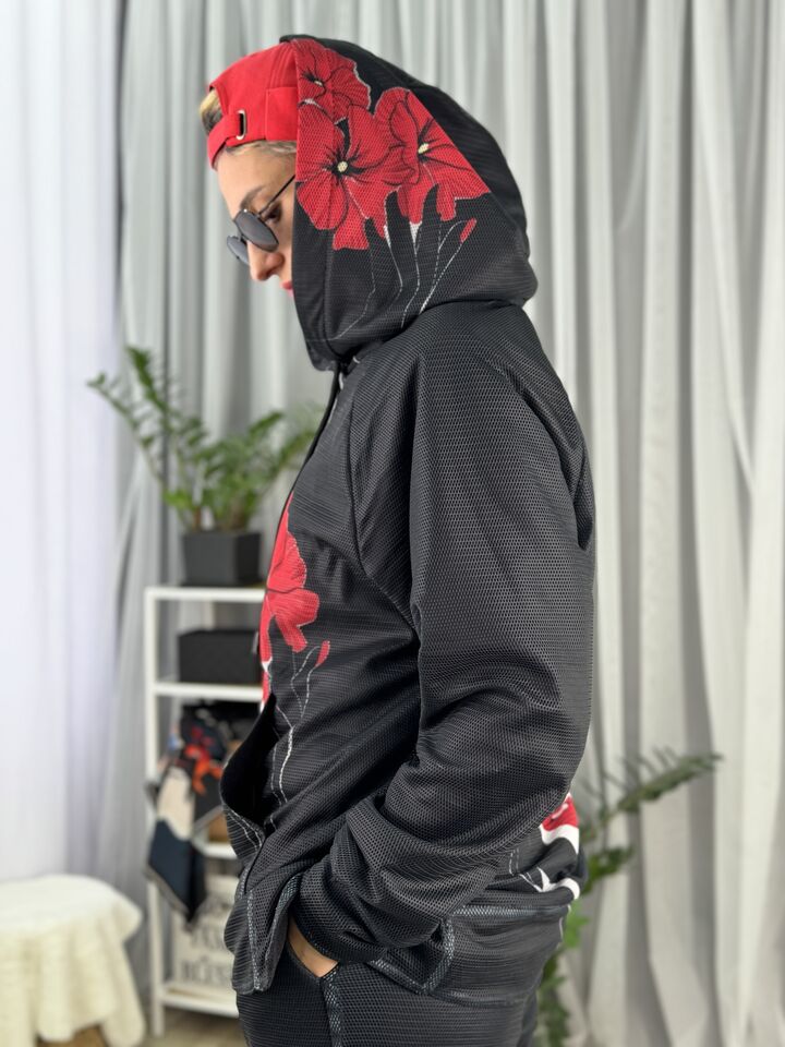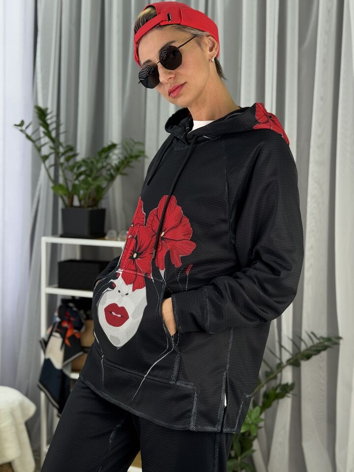 • Комплект: худі-кенгуру + прямі штани із розрізом • Сезон: весна/осінь • Матеріал: бавовна 100% та зверху сітка (поліестр) • Капюшон на худі: є • Пояс: резинка • Посадка: oversize • Догляд: прання 30°