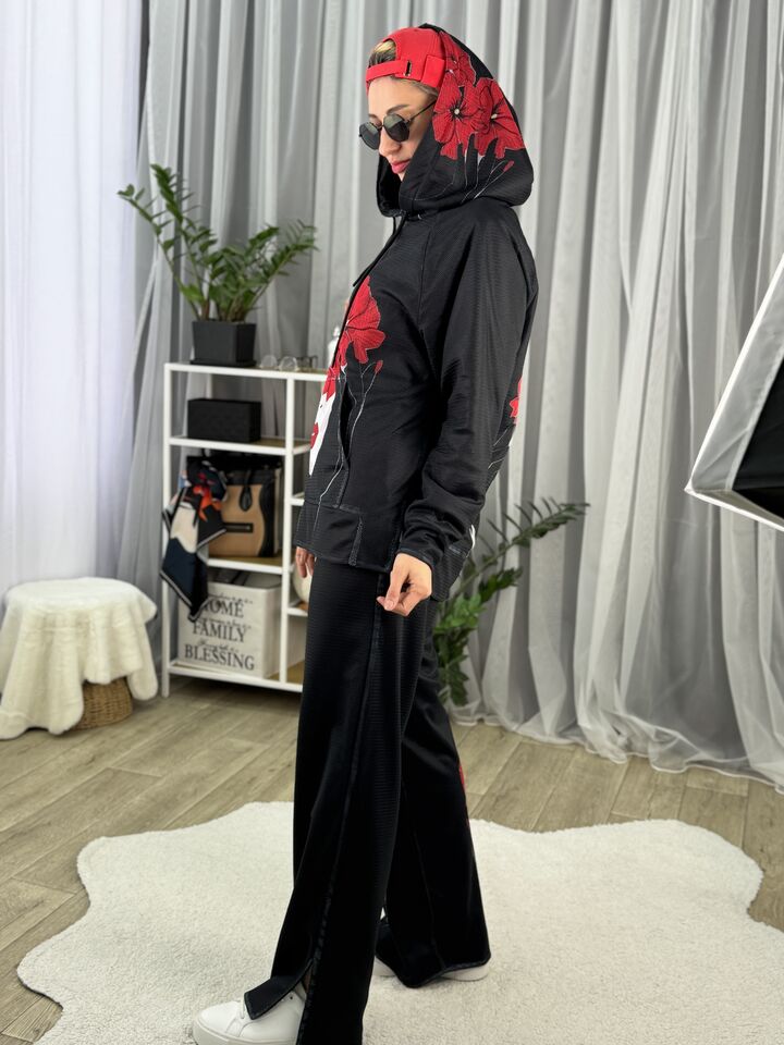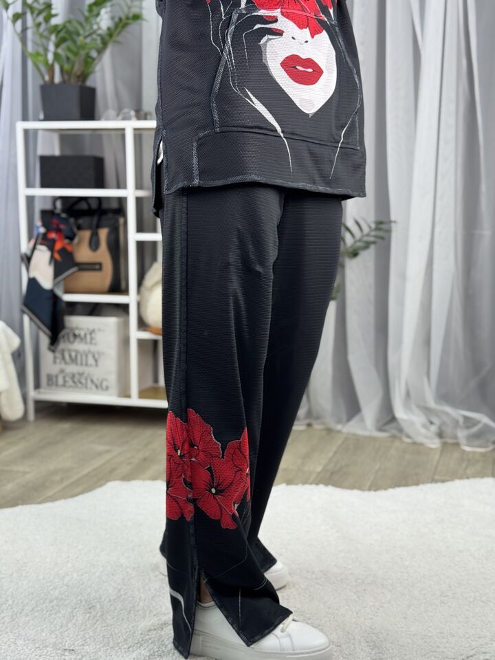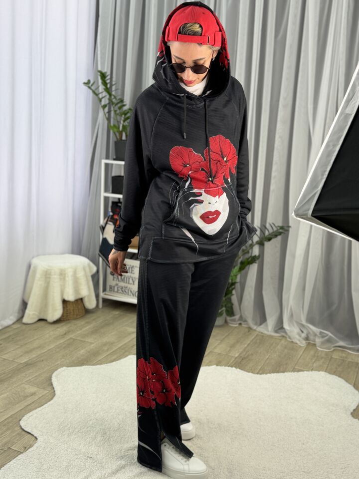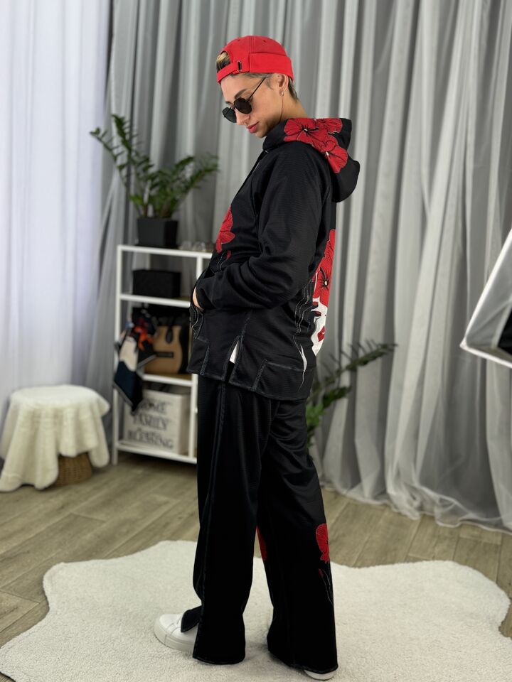 Худі вільного крою із капюшоном, кишеня “кенгуру”, рукава регланом, довжина по спинці – 70 см, довжина рукава від горловини — 73 см. Штани прямого крою зі стильними розрізами знизу, є кишені, довжина по зовнішньому шву від поясу 110 см.