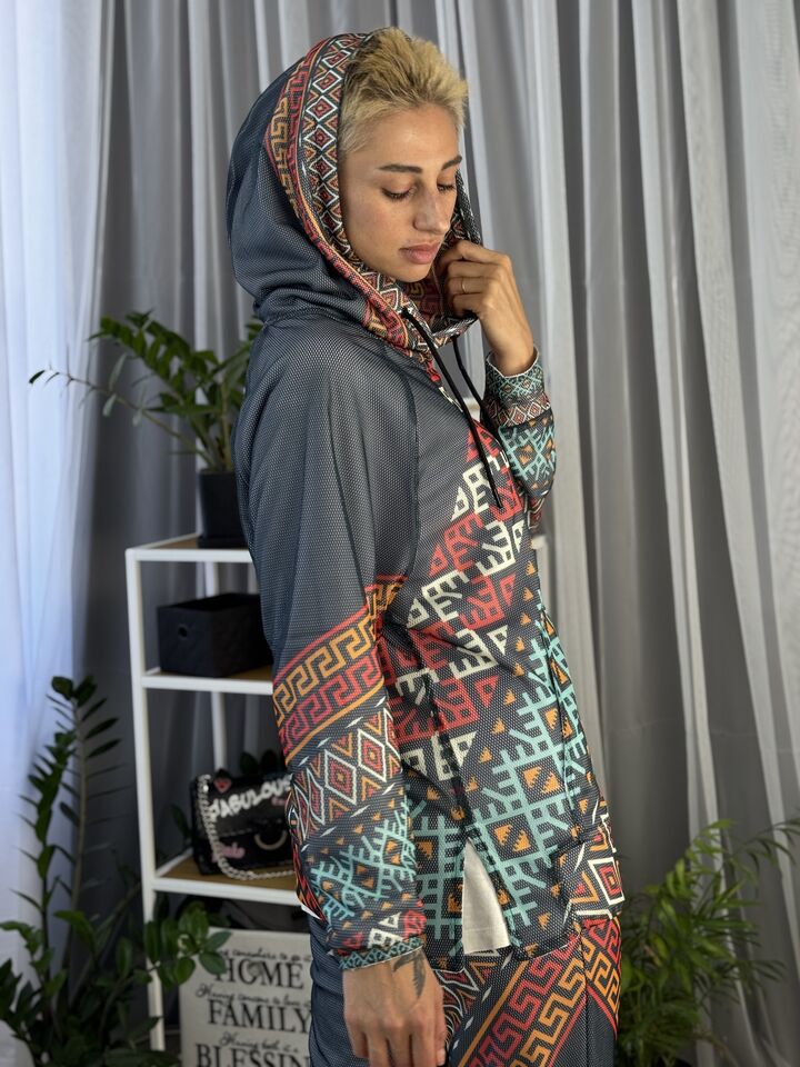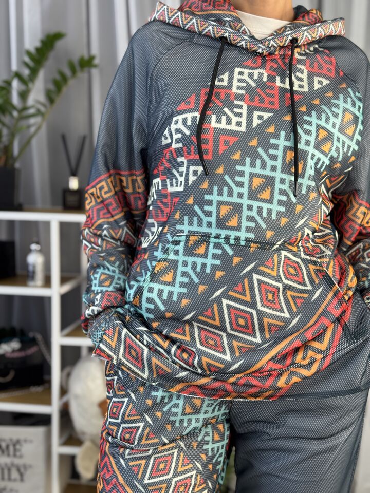 • Комплект: худі-кенгуру + штани джогери • Сезон: весна/осінь • Матеріал: бавовна 100% та зверху сітка (поліестр) • Капюшон на худі: є • Пояс: резинка • Посадка: oversize • Догляд: прання 30°
