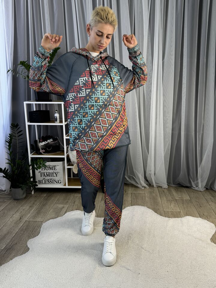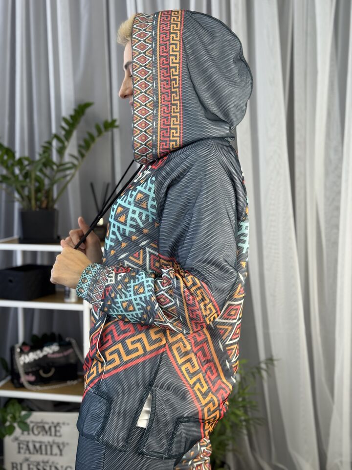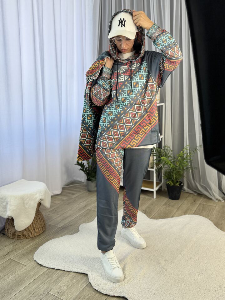 Худі вільного крою із капюшоном, кишеня “кенгуру”, рукава регланом, довжина по спинці – 70 см, довжина рукава від горловини — 73 см. Фасон штанів  – джогери із еластичною резинкою знизу, є кишені, довжина по зовнішньому шву від поясу 105 см.