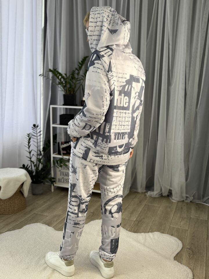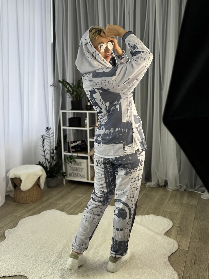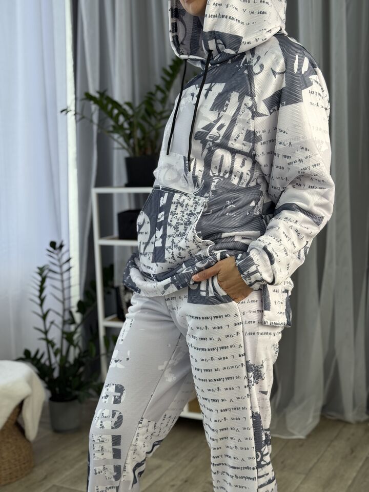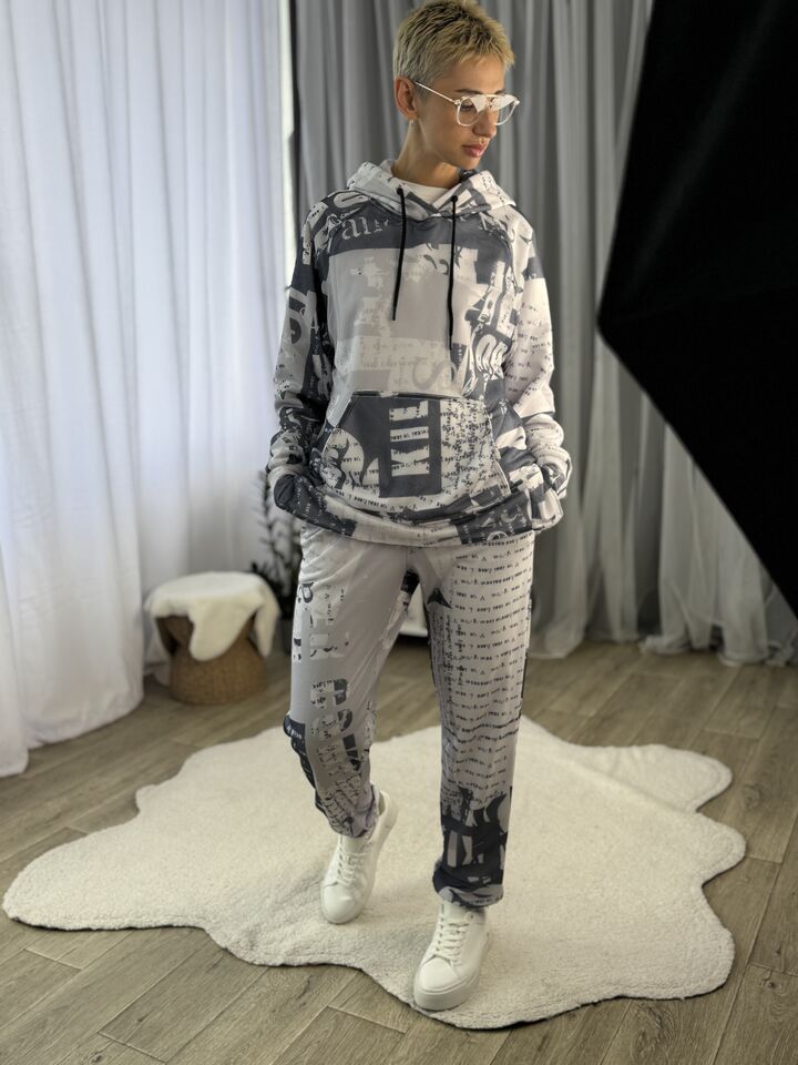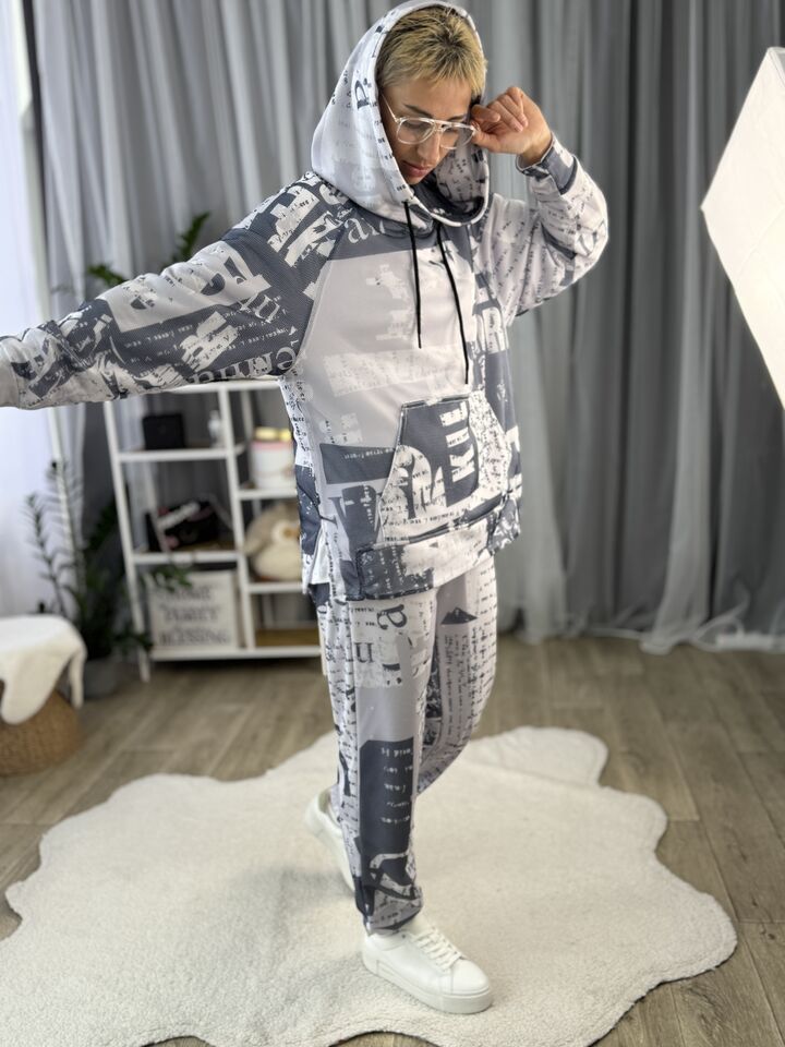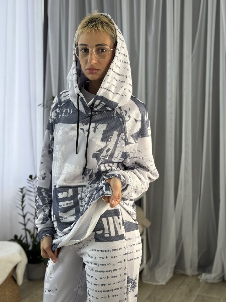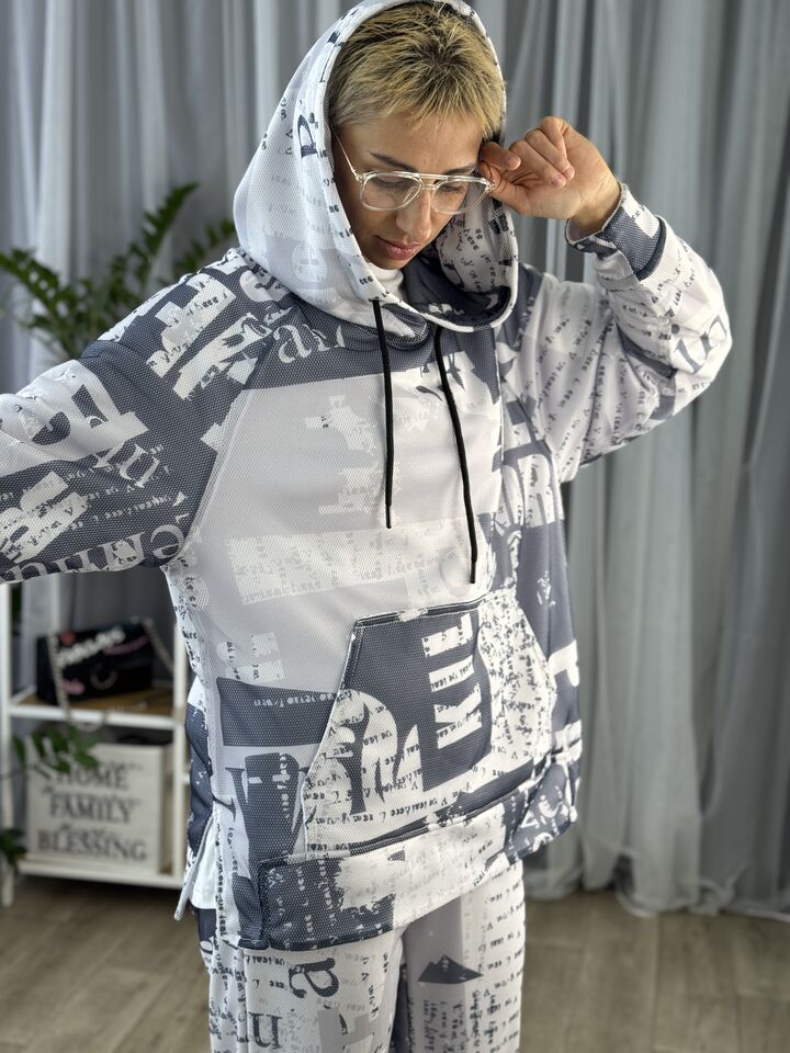 Худі вільного крою із капюшоном, кишеня “кенгуру”, рукава регланом, довжина по спинці – 70 см, довжина рукава від горловини — 73 см. Фасон штанів  – джогери із еластичною резинкою знизу, є кишені, довжина по зовнішньому шву від поясу 105 см.