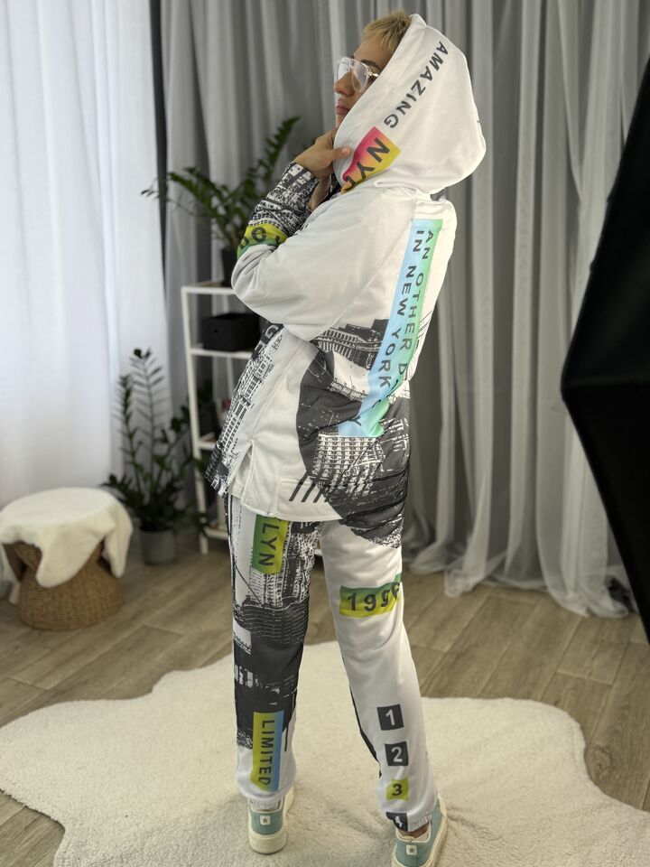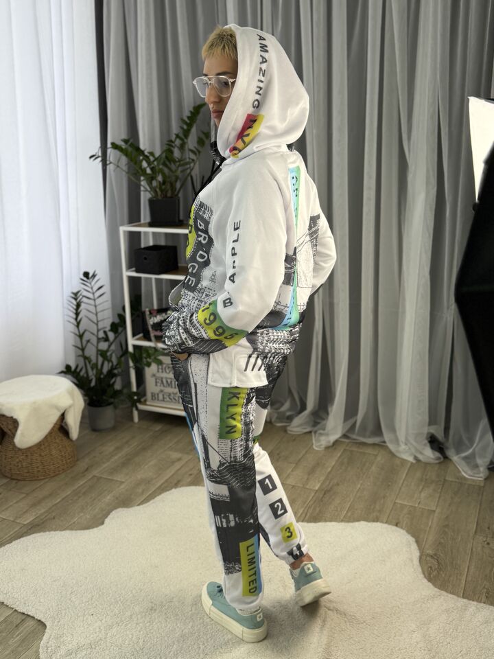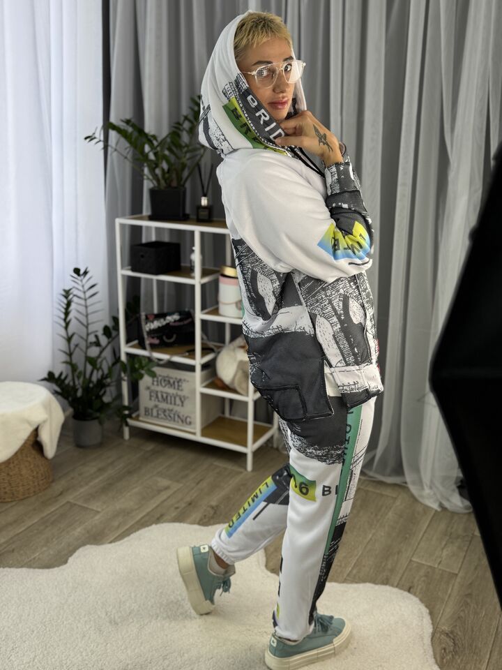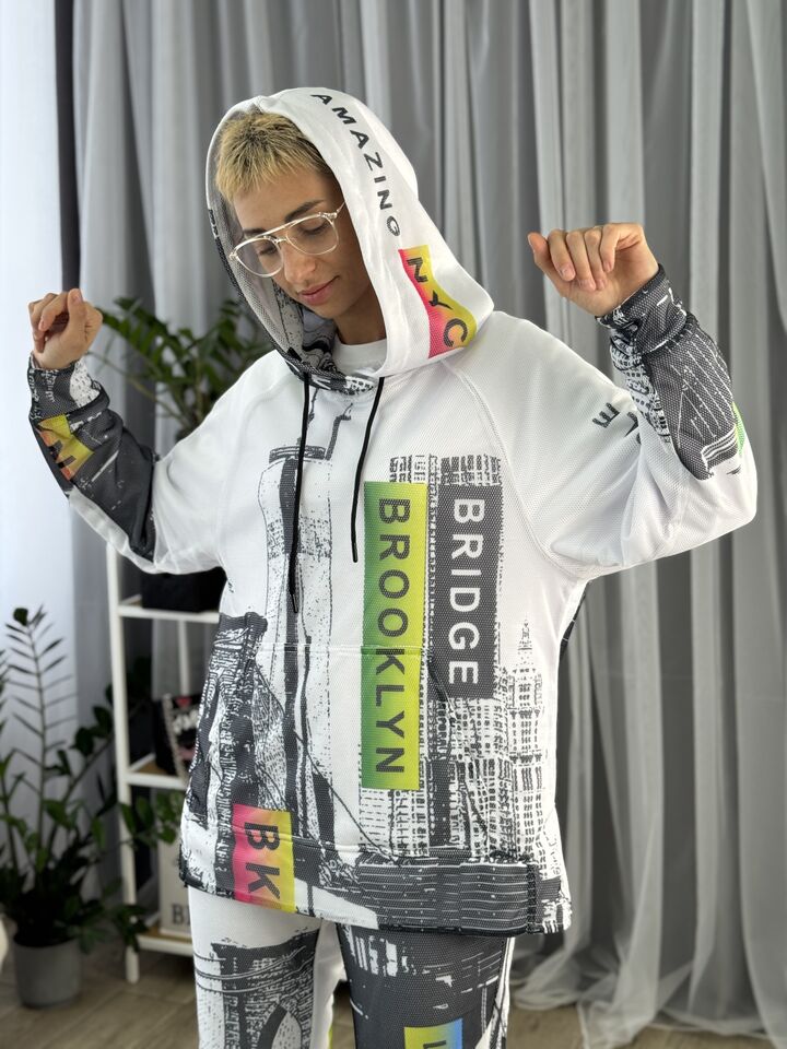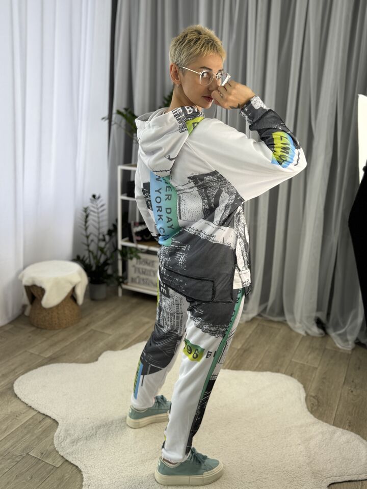 Худі вільного крою із капюшоном, кишеня “кенгуру”, рукава регланом, довжина по спинці – 70 см, довжина рукава від горловини — 73 см. Фасон штанів  – джогери із еластичною резинкою знизу, є кишені, довжина по зовнішньому шву від поясу 105 см.