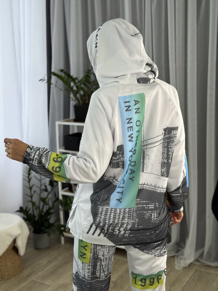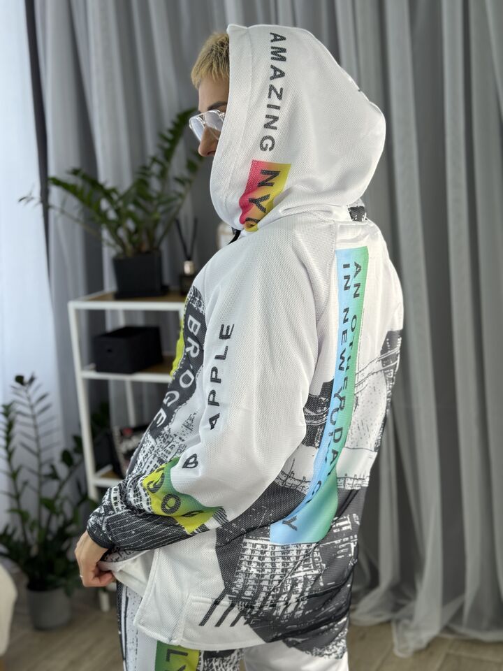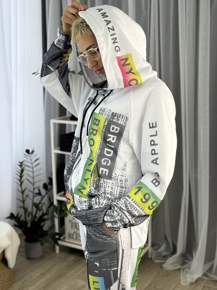 • Комплект: худі-кенгуру + штани джогери • Сезон: весна/осінь • Матеріал: бавовна 100% та зверху сітка (поліестр) • Капюшон на худі: є • Пояс: резинка • Посадка: oversize • Догляд: прання 30°