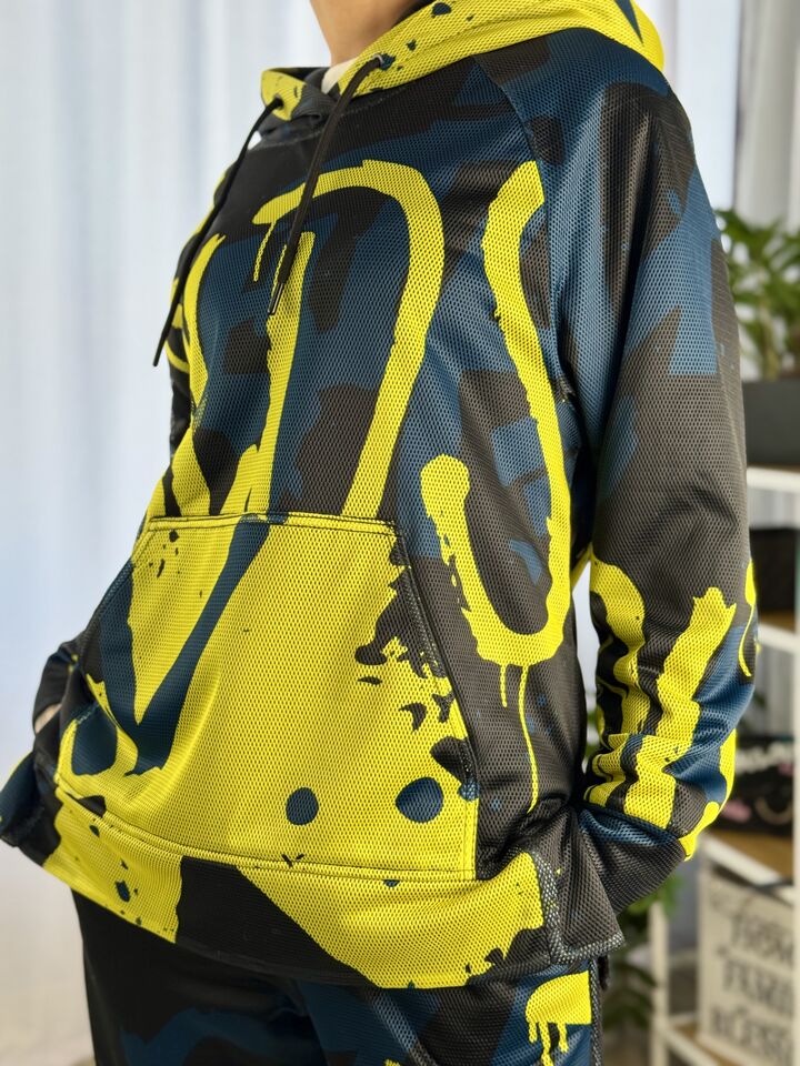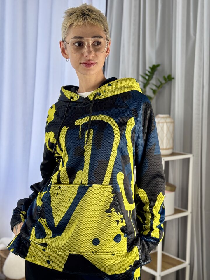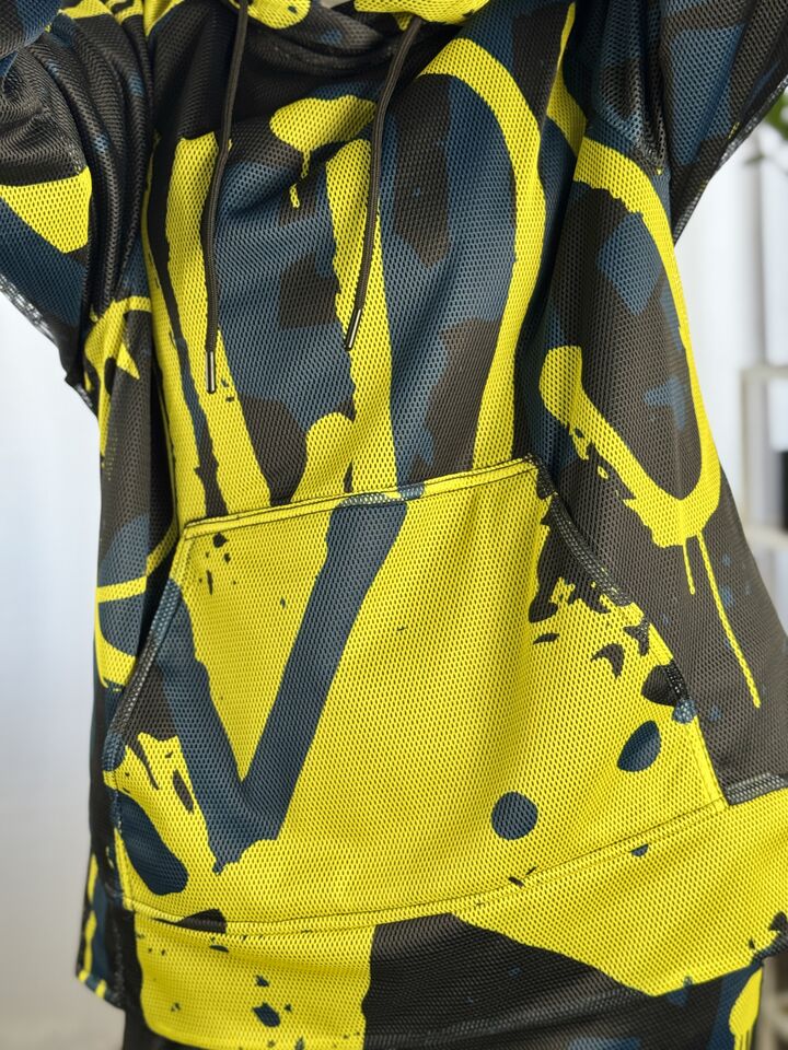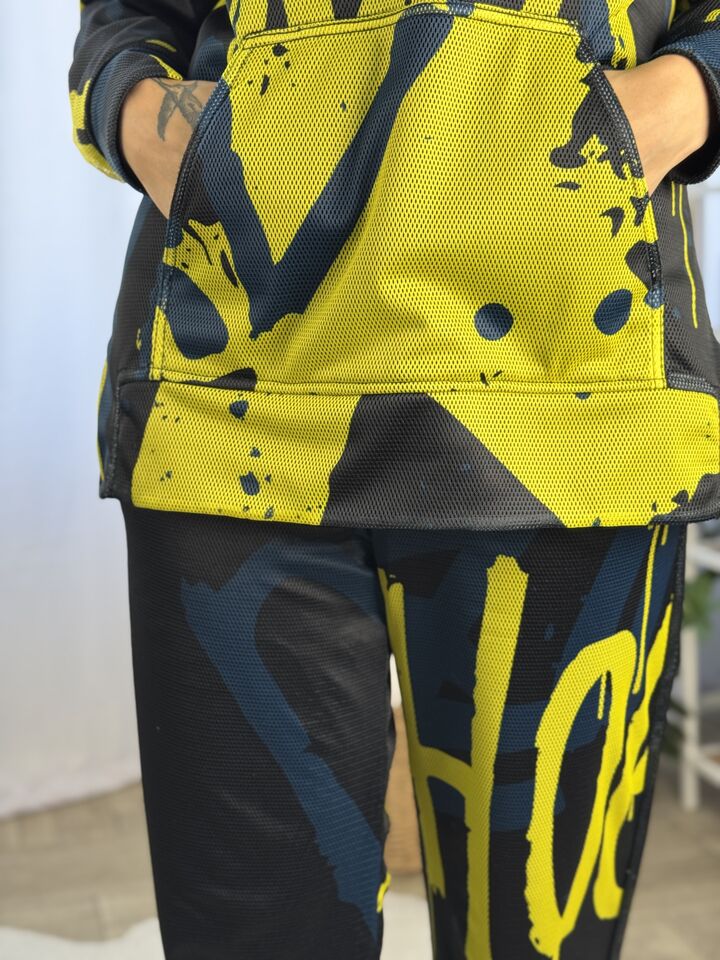 • Комплект: худі-кенгуру + прямі штани із розрізом • Сезон: весна/осінь • Матеріал: бавовна 100% та зверху сітка (поліестр) • Капюшон на худі: є • Пояс: резинка • Посадка: oversize • Догляд: прання 30°
