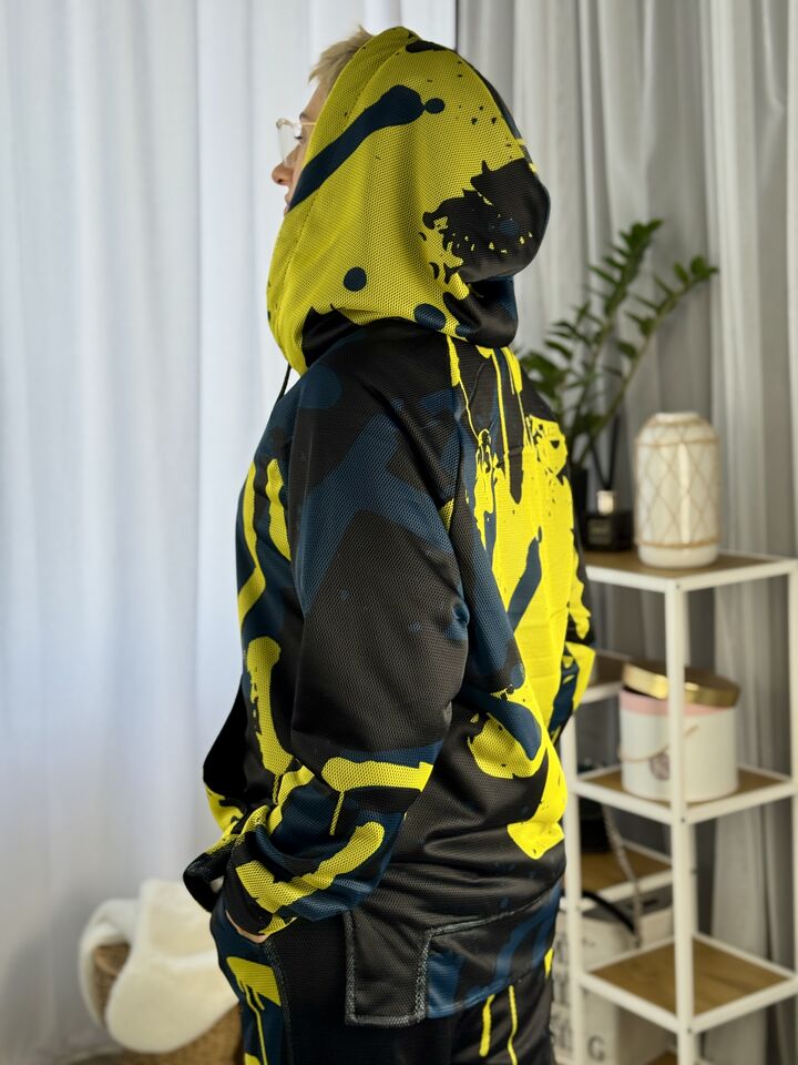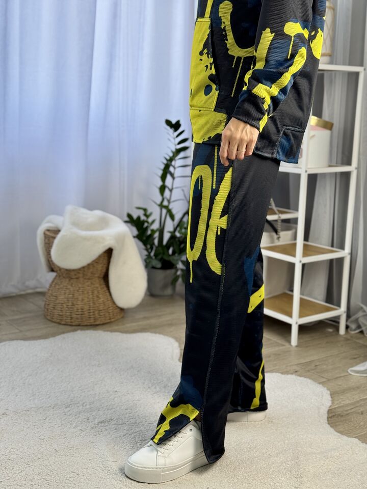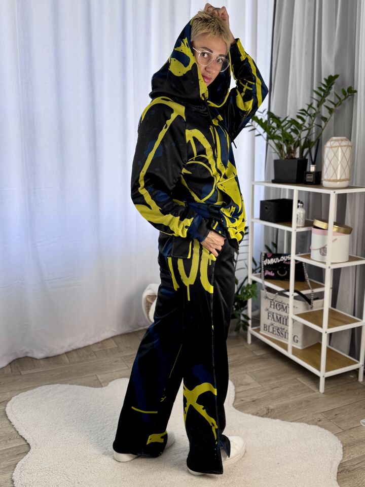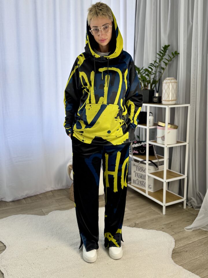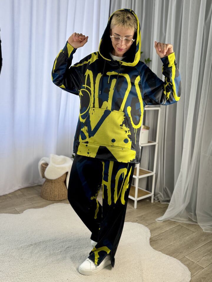 Худі вільного крою із капюшоном, кишеня “кенгуру”, рукава регланом, довжина по спинці – 70 см, довжина рукава від горловини — 73 см. Штани прямого крою зі стильними розрізами знизу, є кишені, довжина по зовнішньому шву від поясу 110 см.