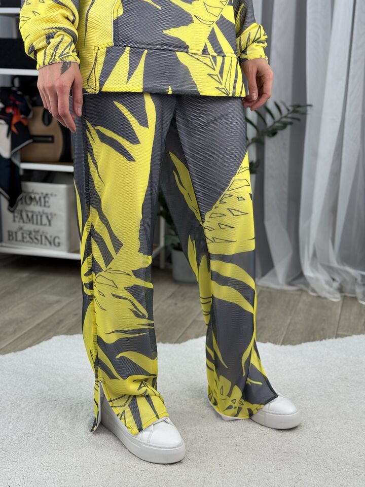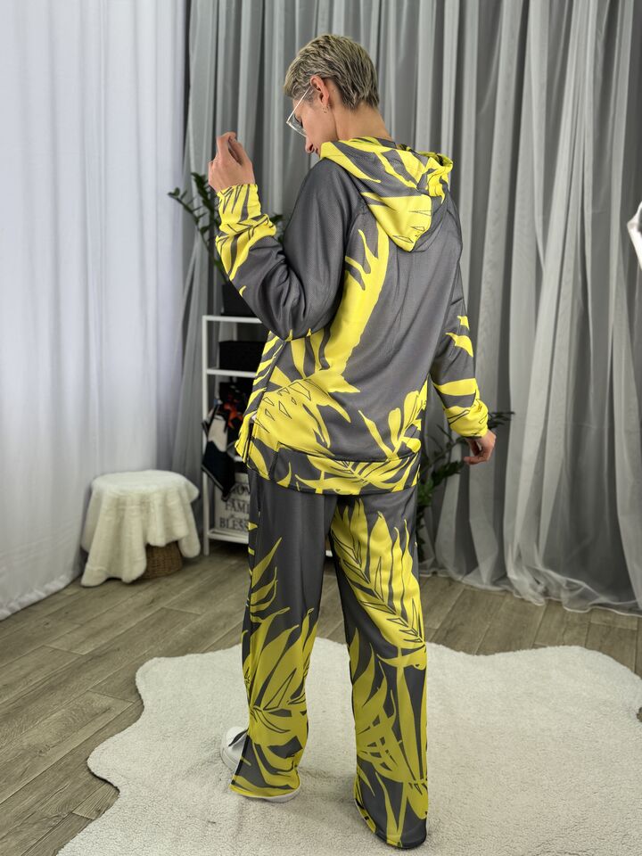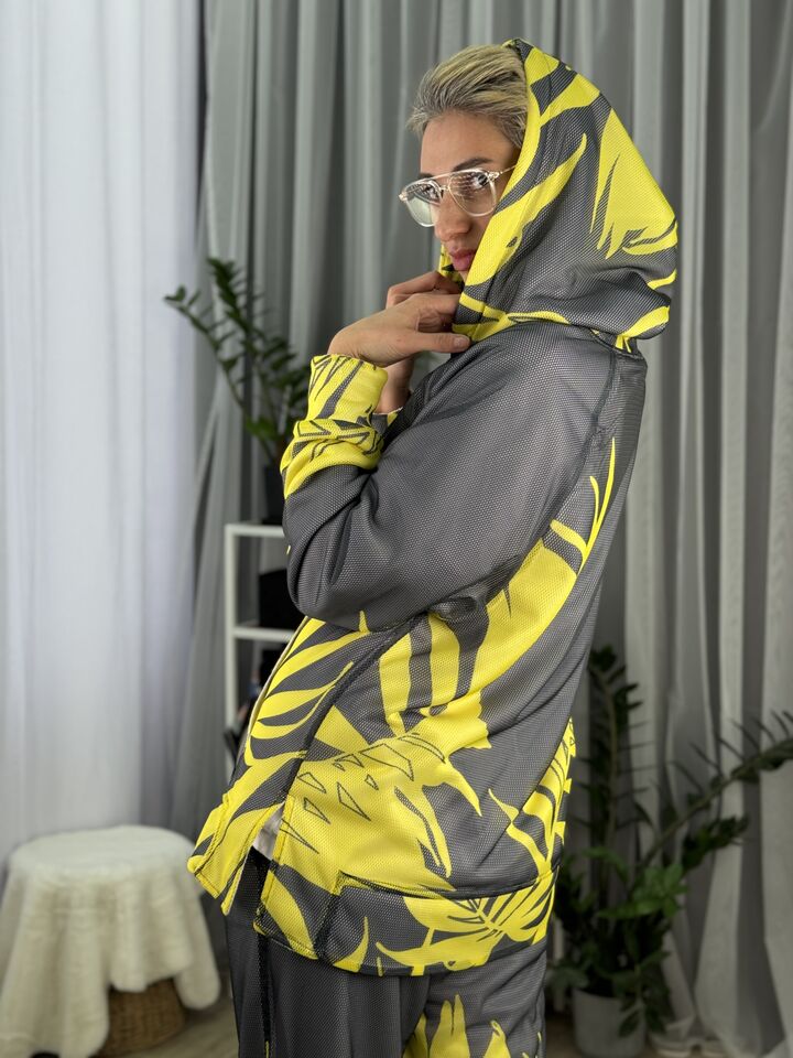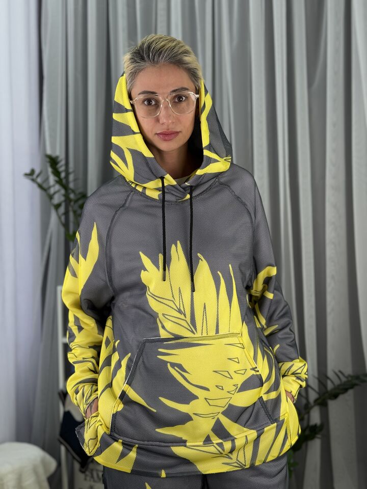 Худі вільного крою із капюшоном, кишеня “кенгуру”, рукава регланом, довжина по спинці – 70 см, довжина рукава від горловини — 73 см. Штани прямого крою зі стильними розрізами знизу, є кишені, довжина по зовнішньому шву від поясу 110 см.