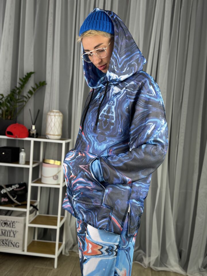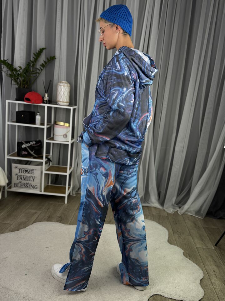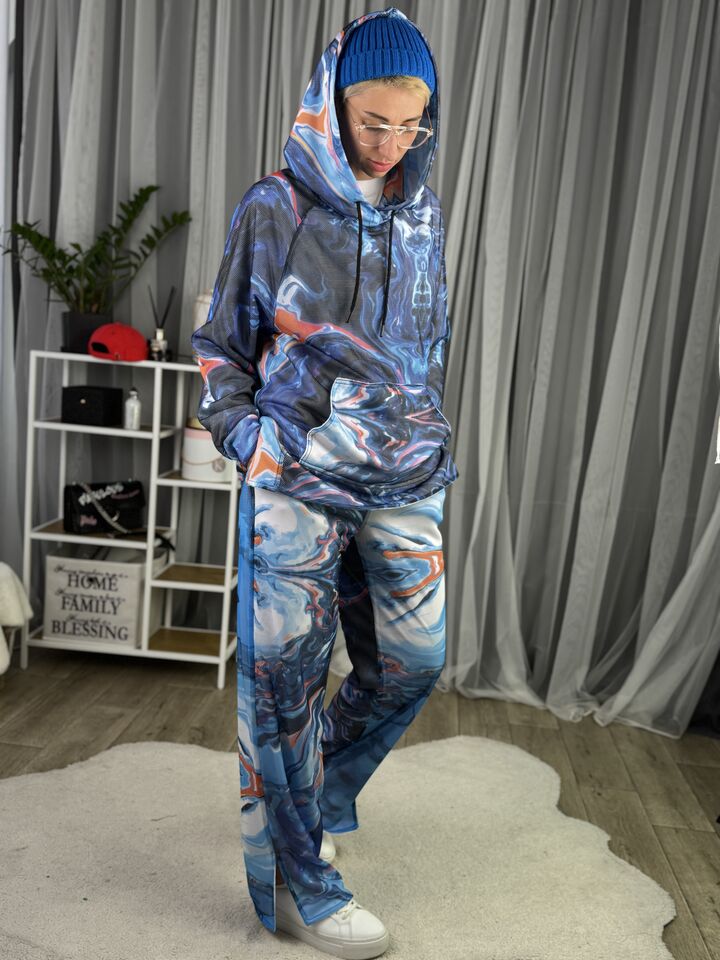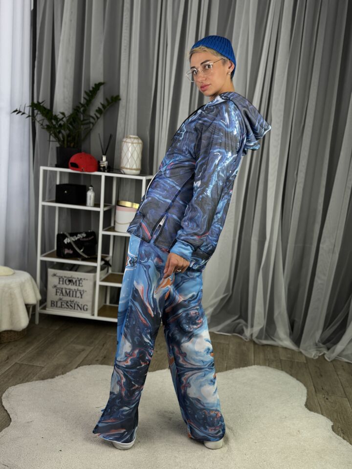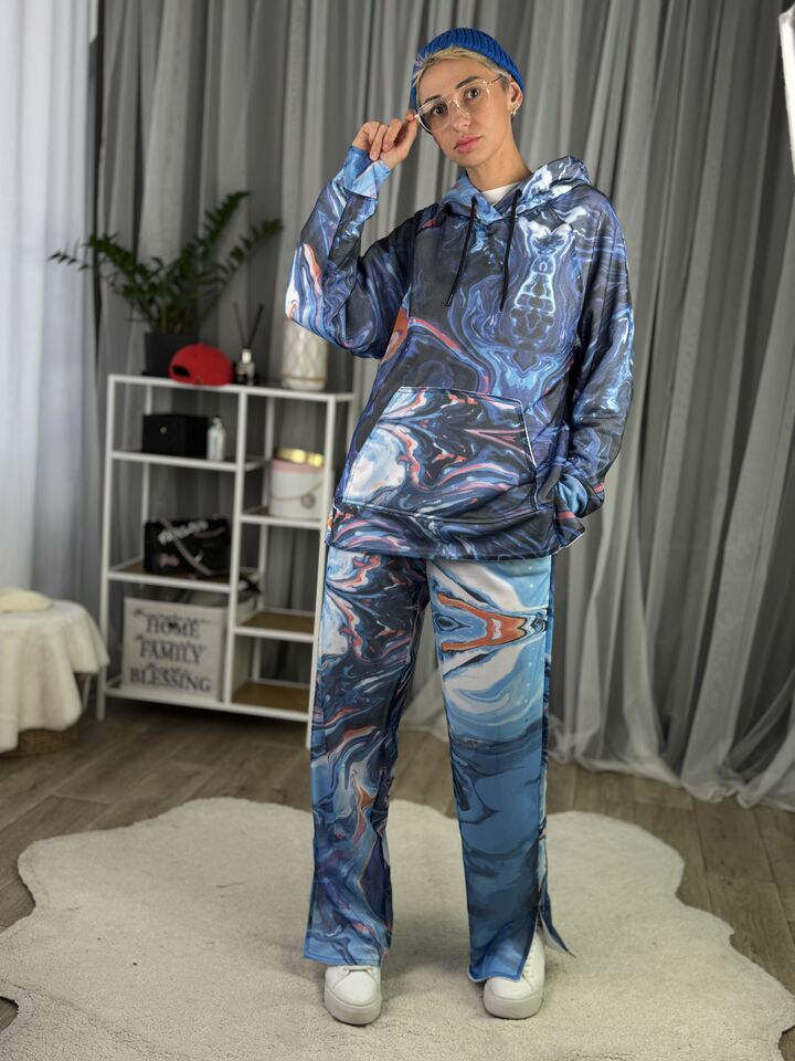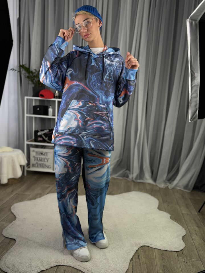 Худі вільного крою із капюшоном, кишеня “кенгуру”, рукава регланом, довжина по спинці – 70 см, довжина рукава від горловини — 73 см. Штани прямого крою зі стильними розрізами знизу, є кишені, довжина по зовнішньому шву від поясу 110 см.