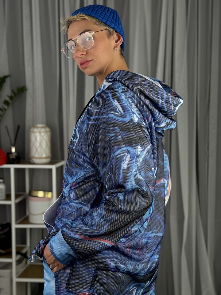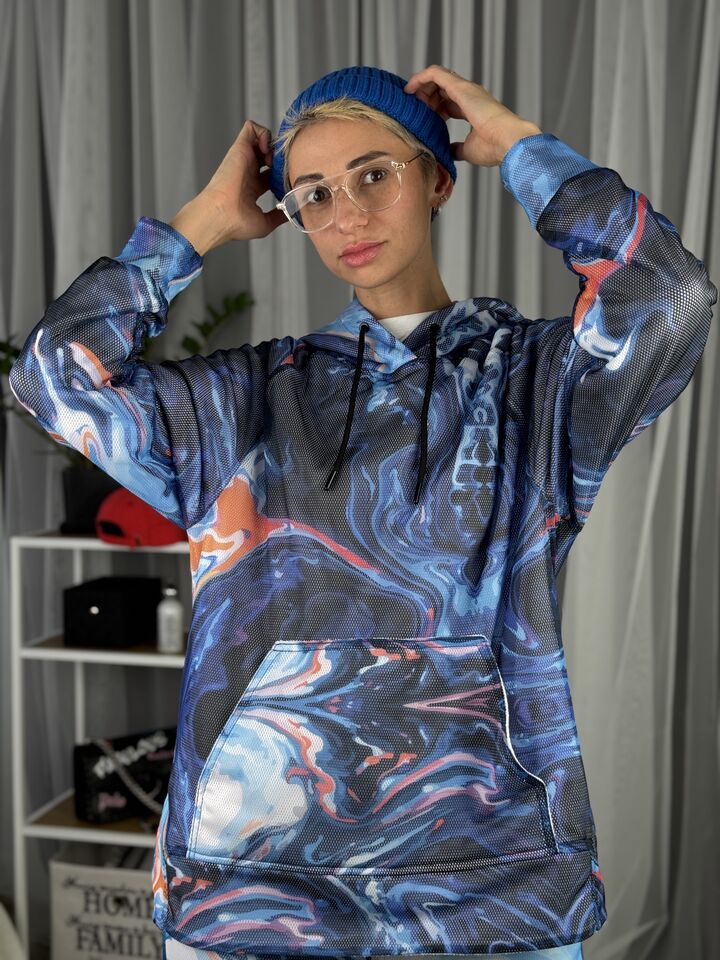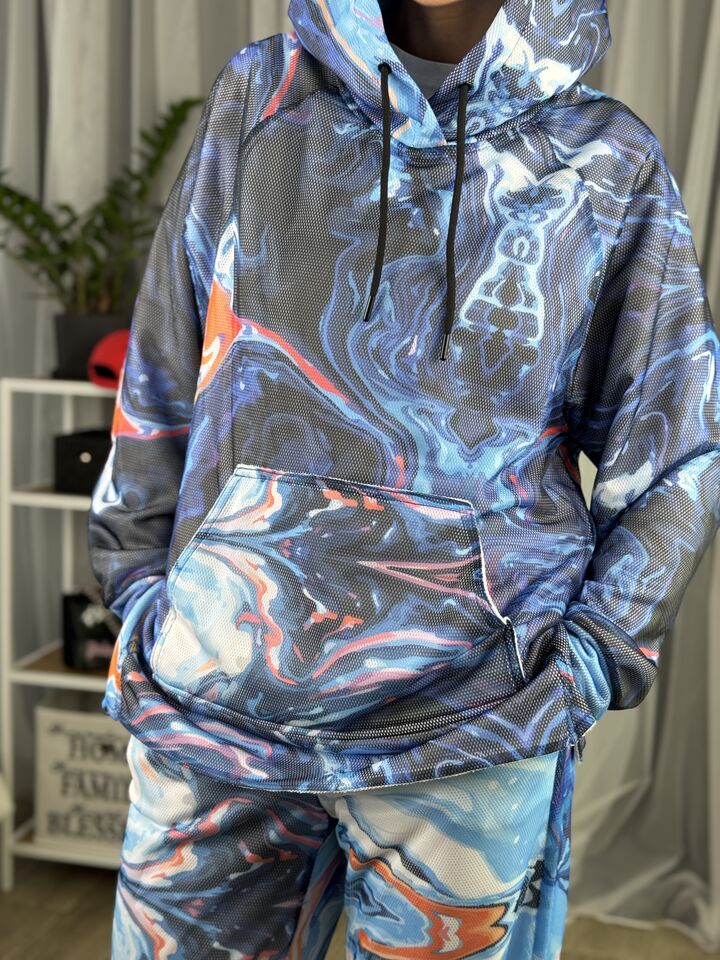 • Комплект: худі-кенгуру + прямі штани із розрізом • Сезон: весна/осінь • Матеріал: бавовна 100% та зверху сітка (поліестр) • Капюшон на худі: є • Пояс: резинка • Посадка: oversize • Догляд: прання 30°