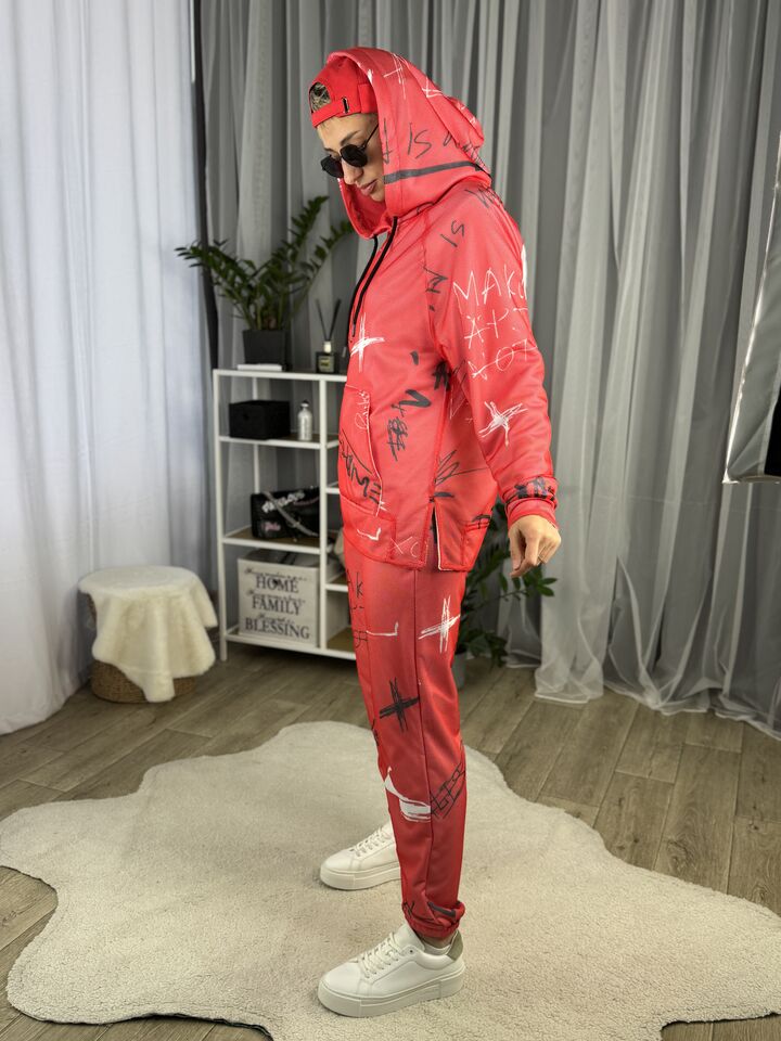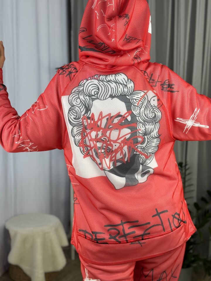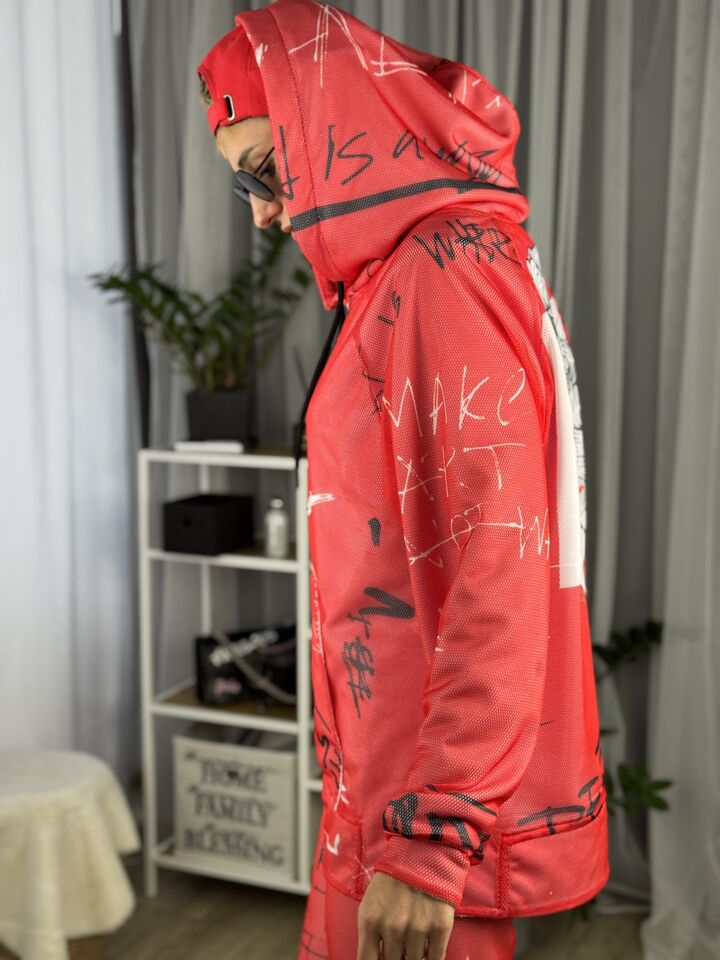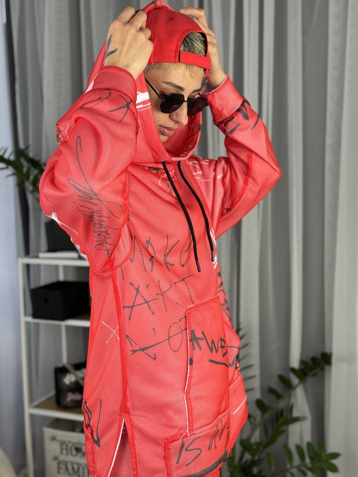 • Комплект: худі-кенгуру + штани джогери • Сезон: весна/осінь • Матеріал: бавовна 100% та зверху сітка (поліестр) • Капюшон на худі: є • Пояс: резинка • Посадка: oversize • Догляд: прання 30°