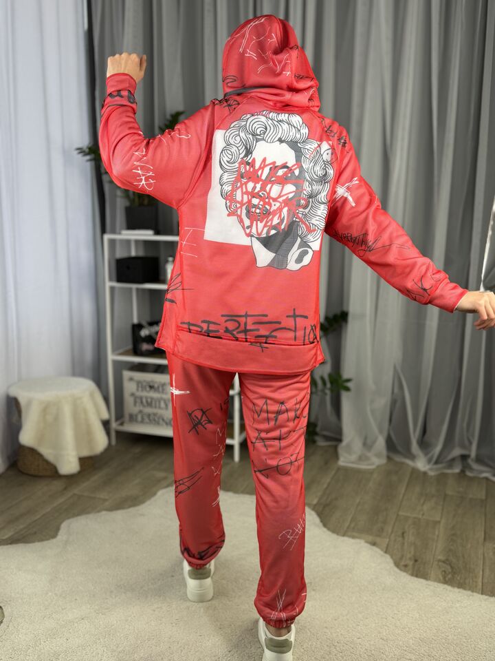 Худі вільного крою із капюшоном, кишеня “кенгуру”, рукава регланом, довжина по спинці – 70 см, довжина рукава від горловини — 73 см. Фасон штанів  – джогери із еластичною резинкою знизу, є кишені, довжина по зовнішньому шву від поясу 105 см.