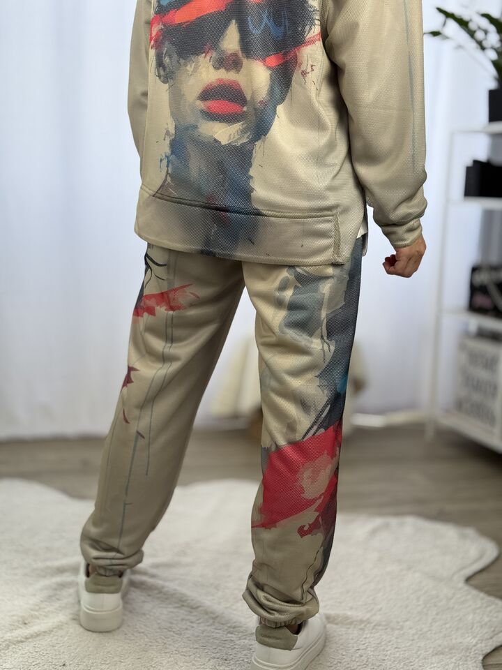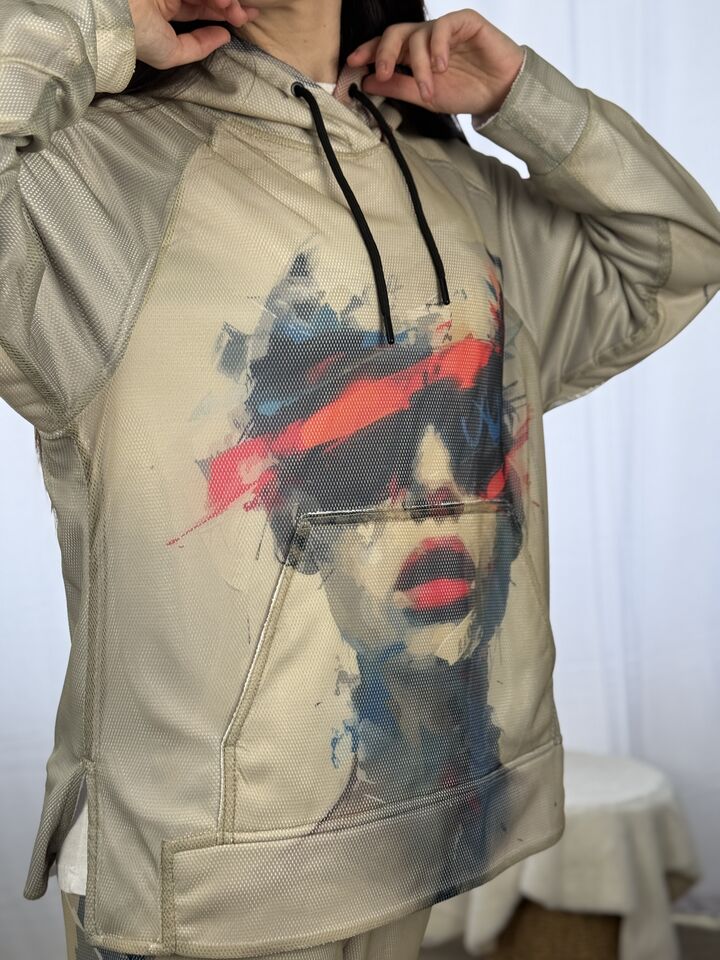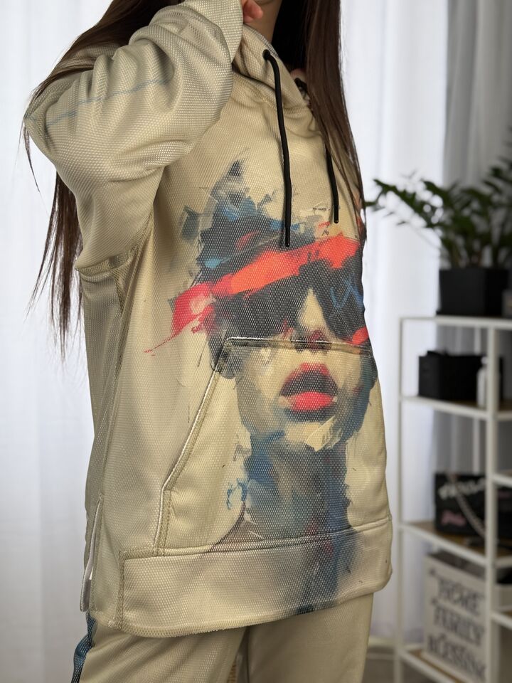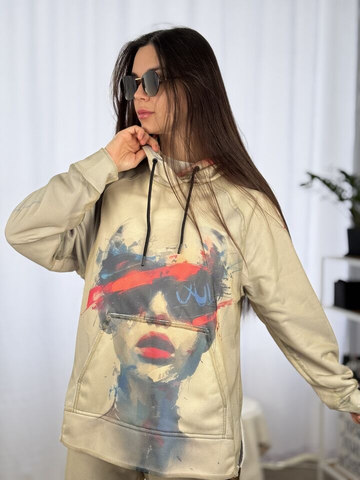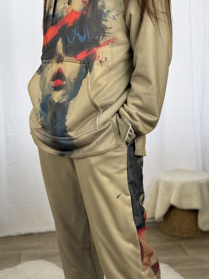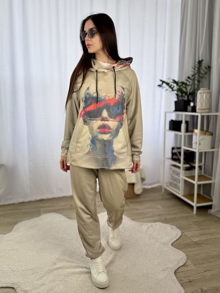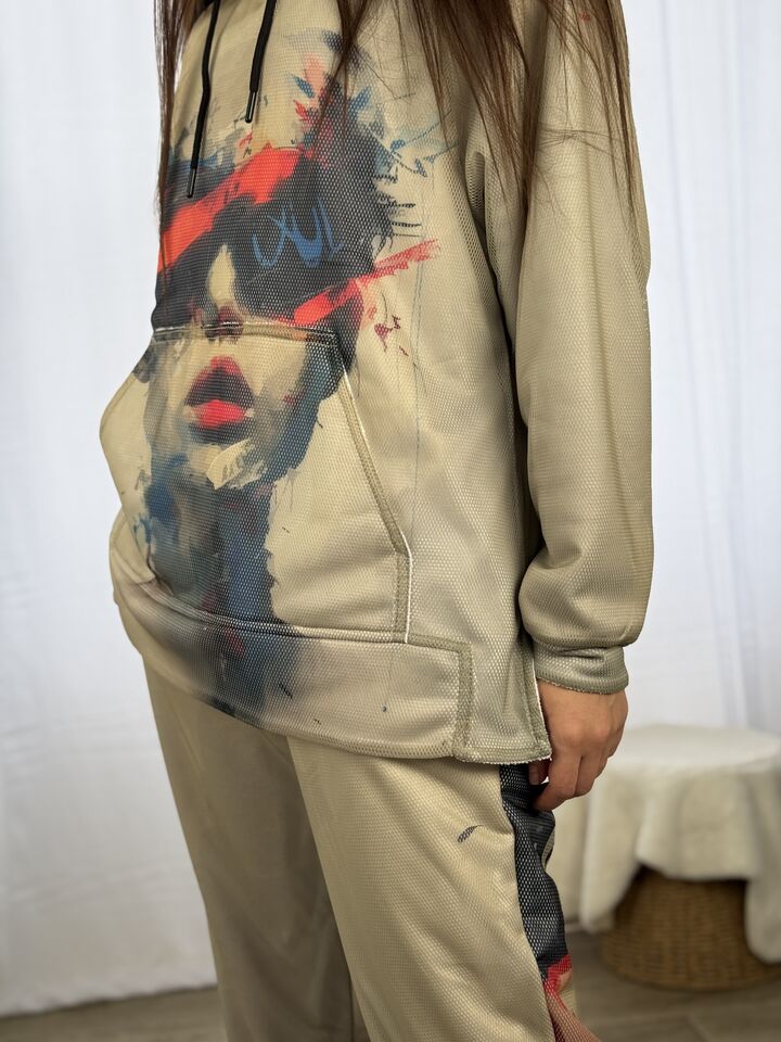 Худі вільного крою із капюшоном, кишеня “кенгуру”, рукава регланом, довжина по спинці – 70 см, довжина рукава від горловини — 73 см. Фасон штанів  – джогери із еластичною резинкою знизу, є кишені, довжина по зовнішньому шву від поясу 105 см.