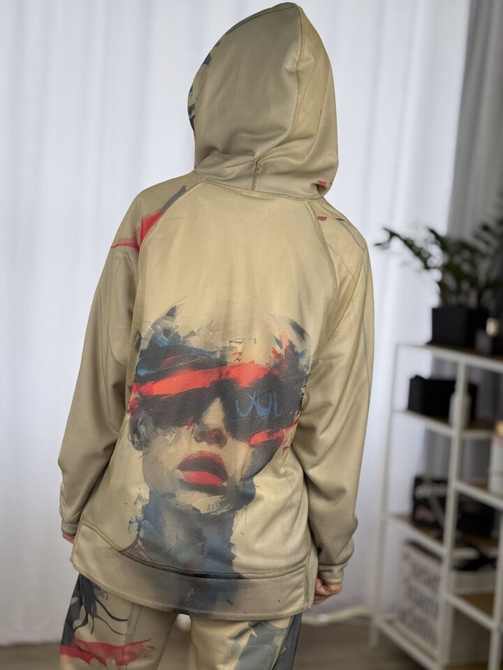 • Комплект: худі-кенгуру + штани джогери • Сезон: весна/осінь • Матеріал: бавовна 100% та зверху сітка (поліестр) • Капюшон на худі: є • Пояс: резинка • Посадка: oversize • Догляд: прання 30°