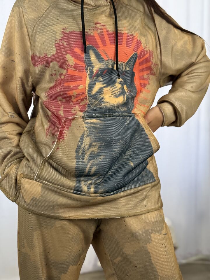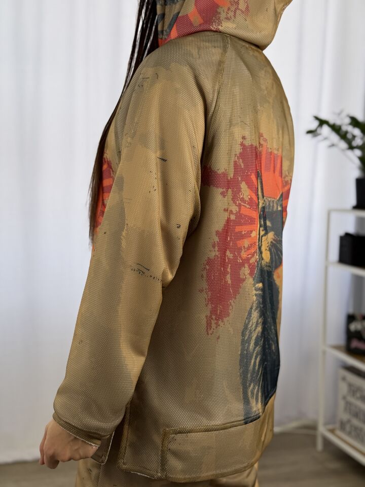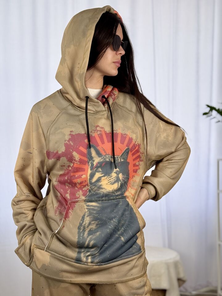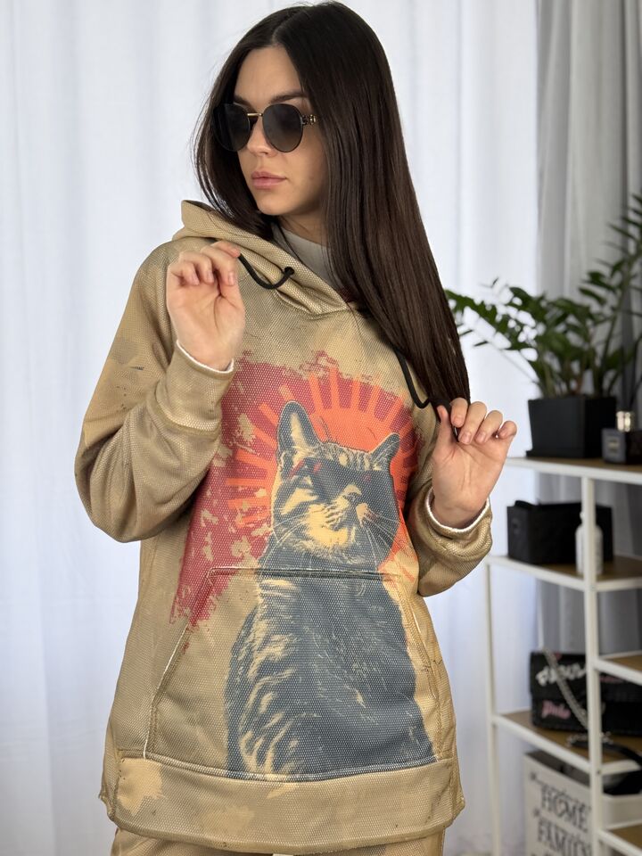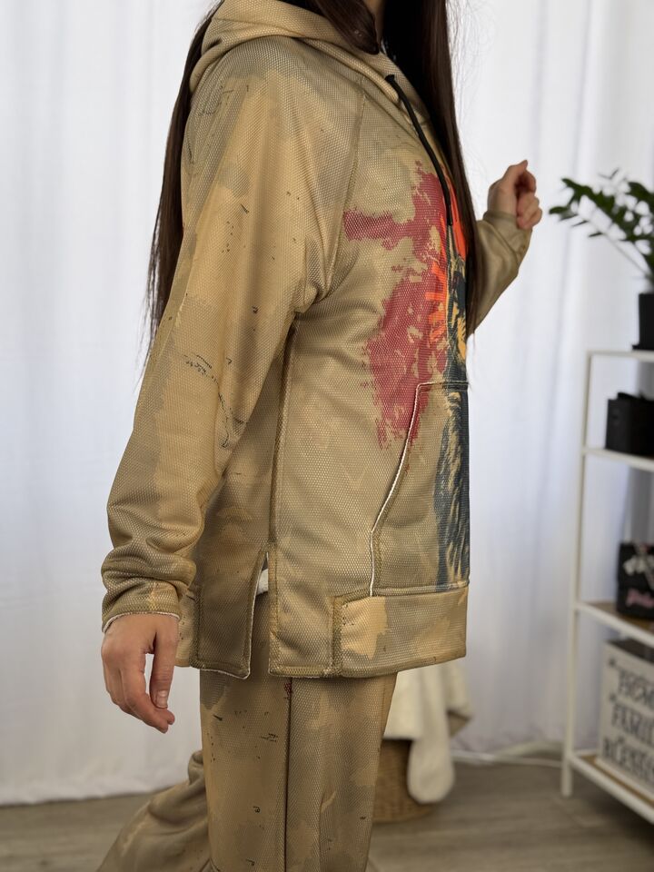 Худі вільного крою із капюшоном, кишеня “кенгуру”, рукава регланом, довжина по спинці – 70 см, довжина рукава від горловини — 73 см. Фасон штанів – джогери із еластичною резинкою знизу, є кишені, довжина по зовнішньому шву від поясу 105 см.
