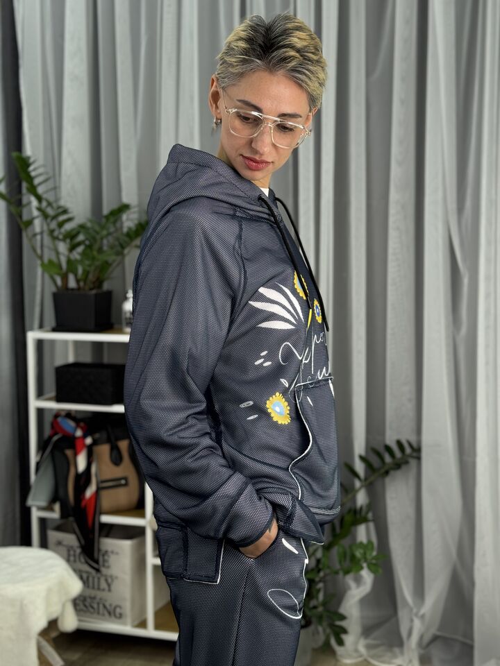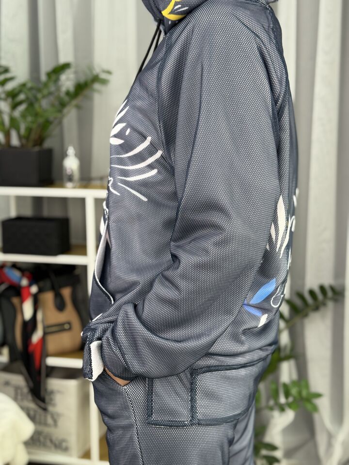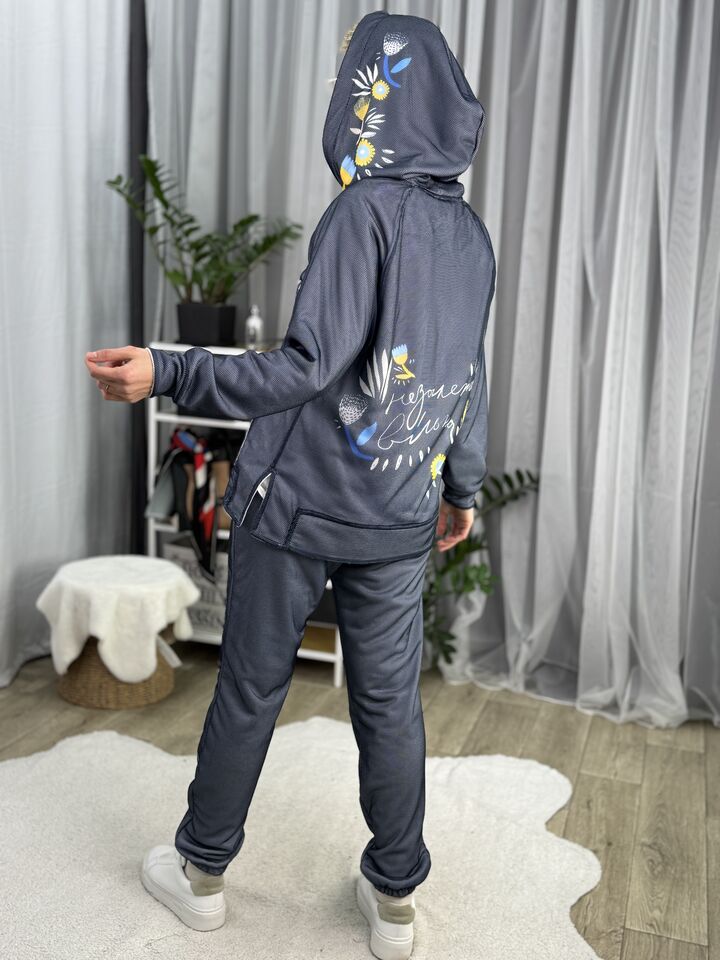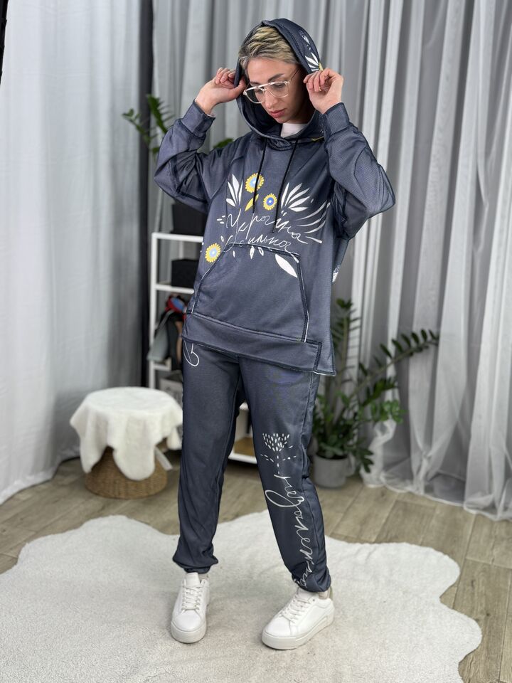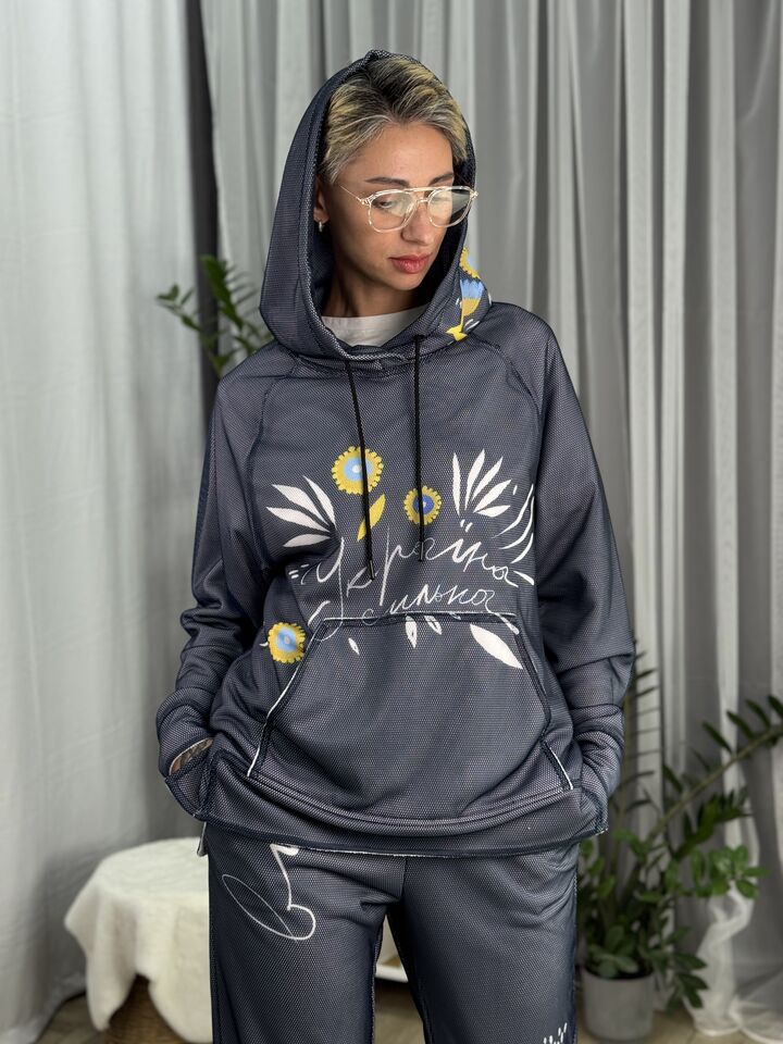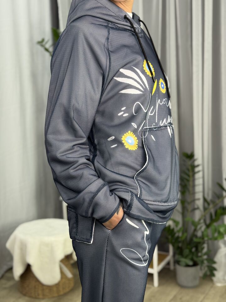 Худі вільного крою із капюшоном, кишеня “кенгуру”, рукава регланом, довжина по спинці – 70 см, довжина рукава від горловини — 73 см. Фасон штанів  – джогери із еластичною резинкою знизу, є кишені, довжина по зовнішньому шву від поясу 105 см.