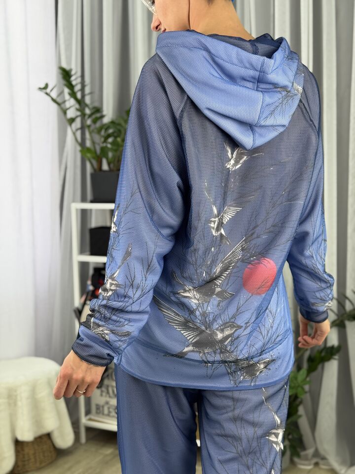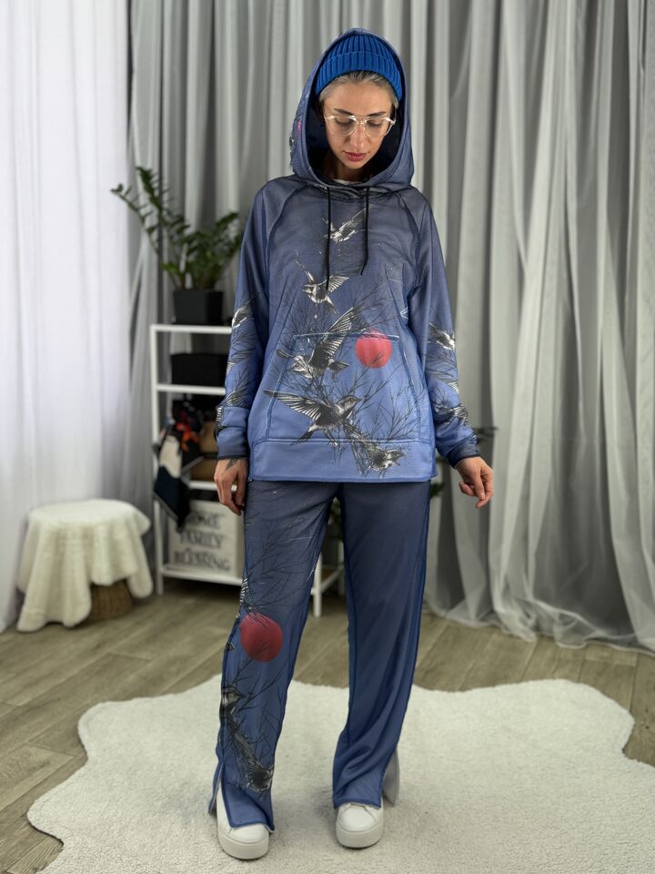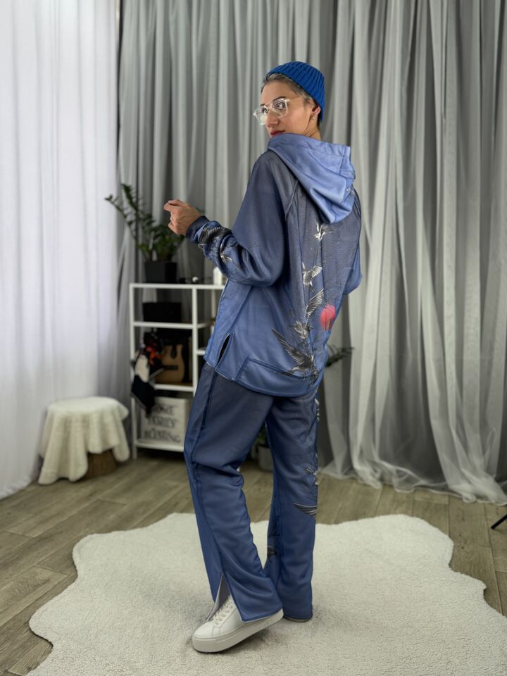 Худі вільного крою із капюшоном, кишеня “кенгуру”, рукава регланом, довжина по спинці – 70 см, довжина рукава від горловини — 73 см. Штани прямого крою зі стильними розрізами знизу, є кишені, довжина по зовнішньому шву від поясу 110 см.
