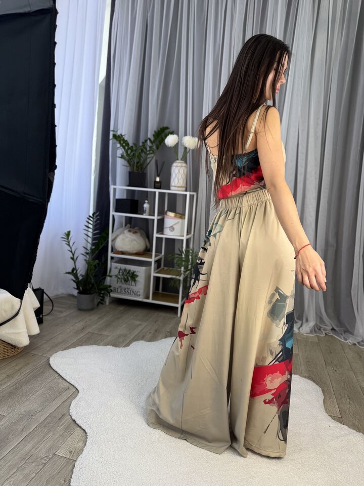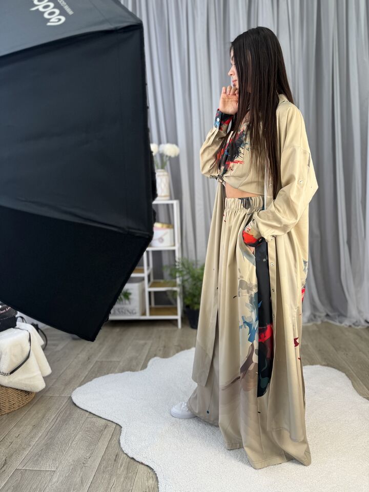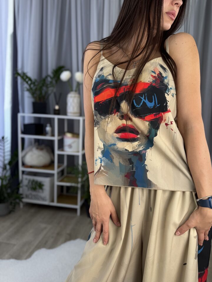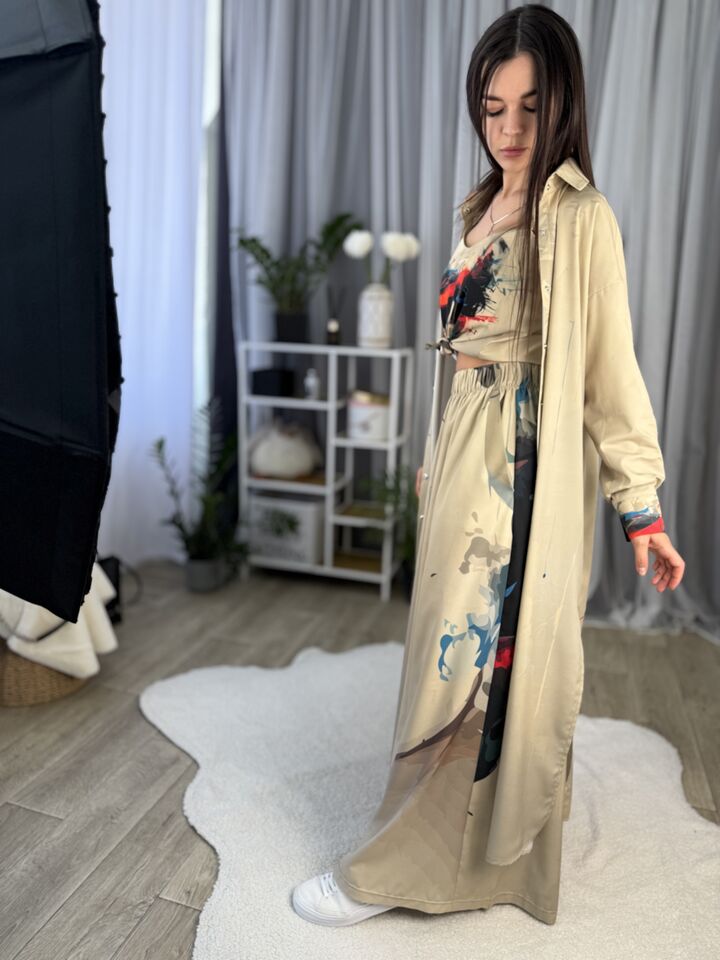 Унікальний жіночий комплект, що складається з брюк, майки на регульованих бретелях і довгої сорочки. Це не просто одяг — це три варіанти стильних образів в одному комплекті: