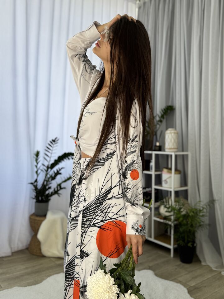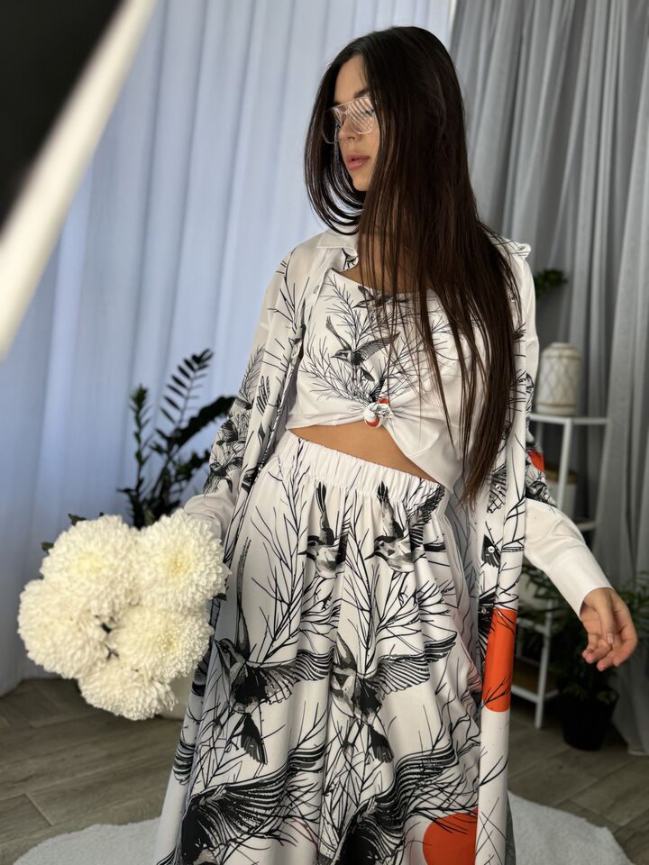 Унікальний жіночий комплект, що складається з брюк, майки на регульованих бретелях і довгої сорочки. Це не просто одяг — це три варіанти стильних образів в одному комплекті: