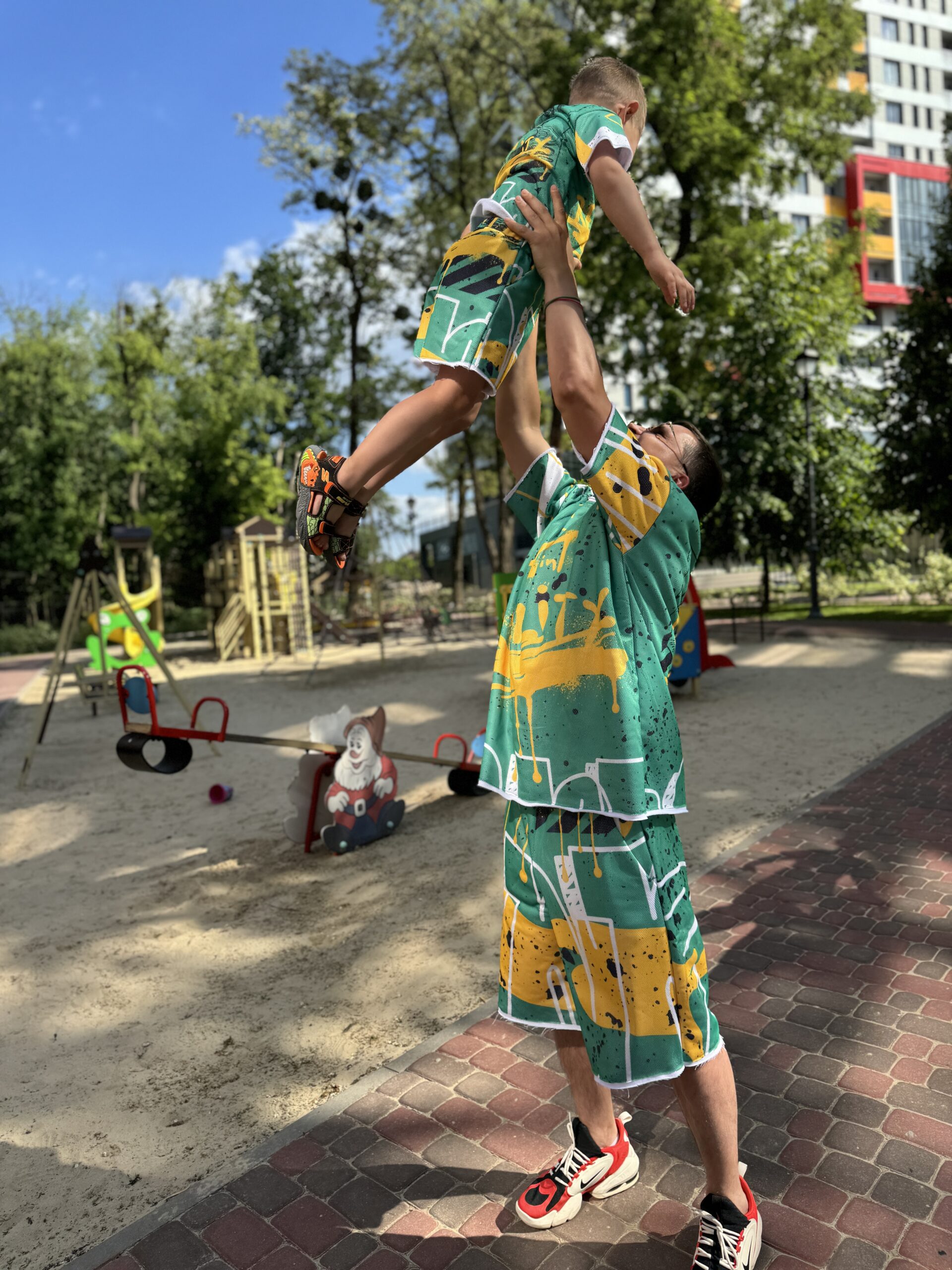 Костюм із бавовняної тканини в поєднанні із сіткою, це означає, що до тіла натуральна тканина, приємна, мʼяка, дихає, але коліна не витягнуться, костюм не буде кошлатитись і всі інші неприємностей які повʼязані із натуральними тканинами – НЕ БУДЕ