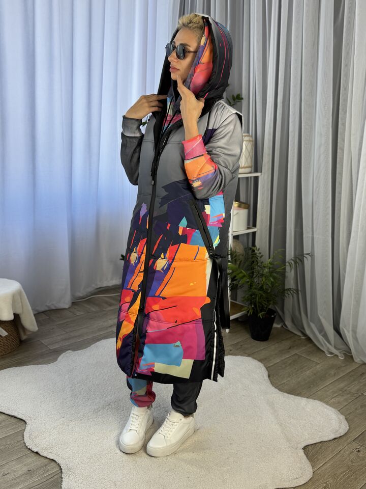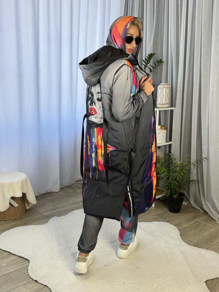Жіноча довга жилетка, весна/осінь, сіра із принтом