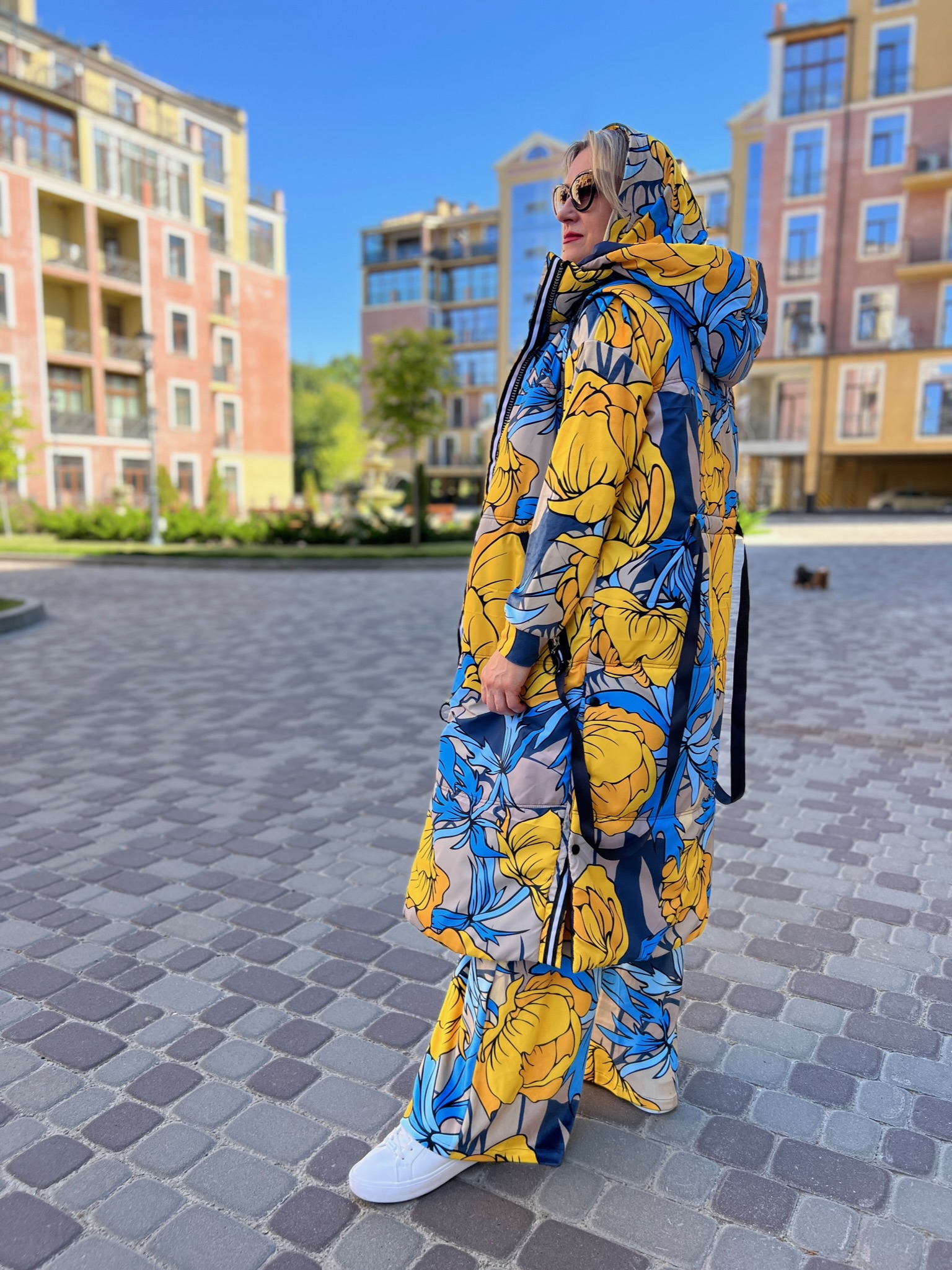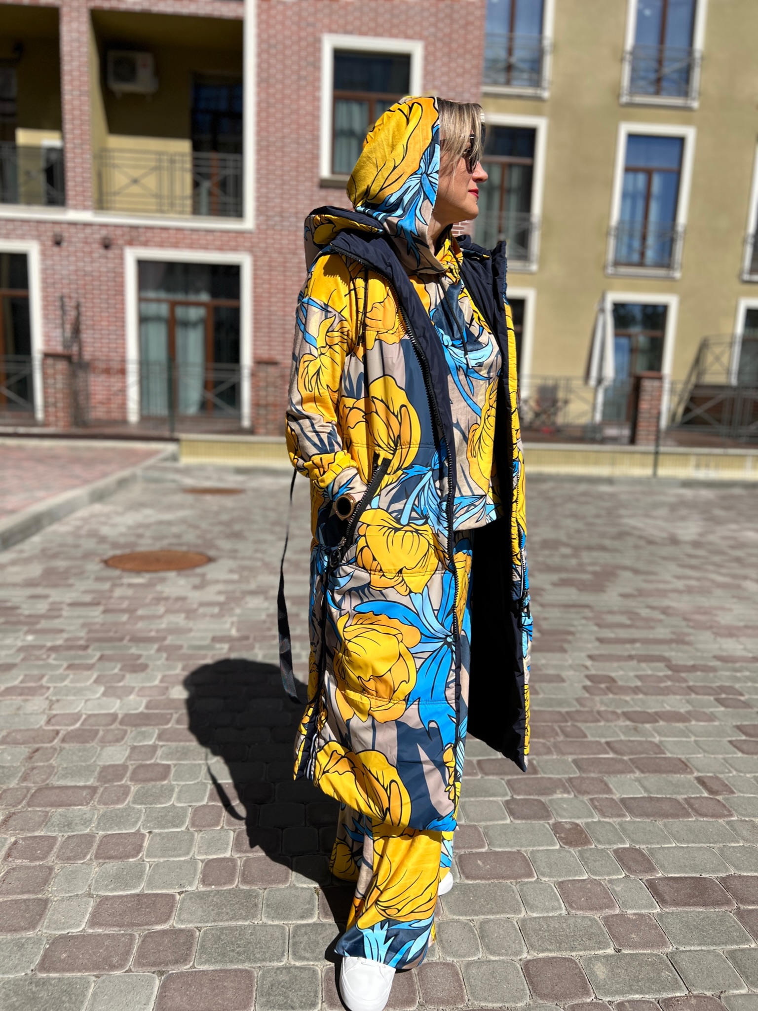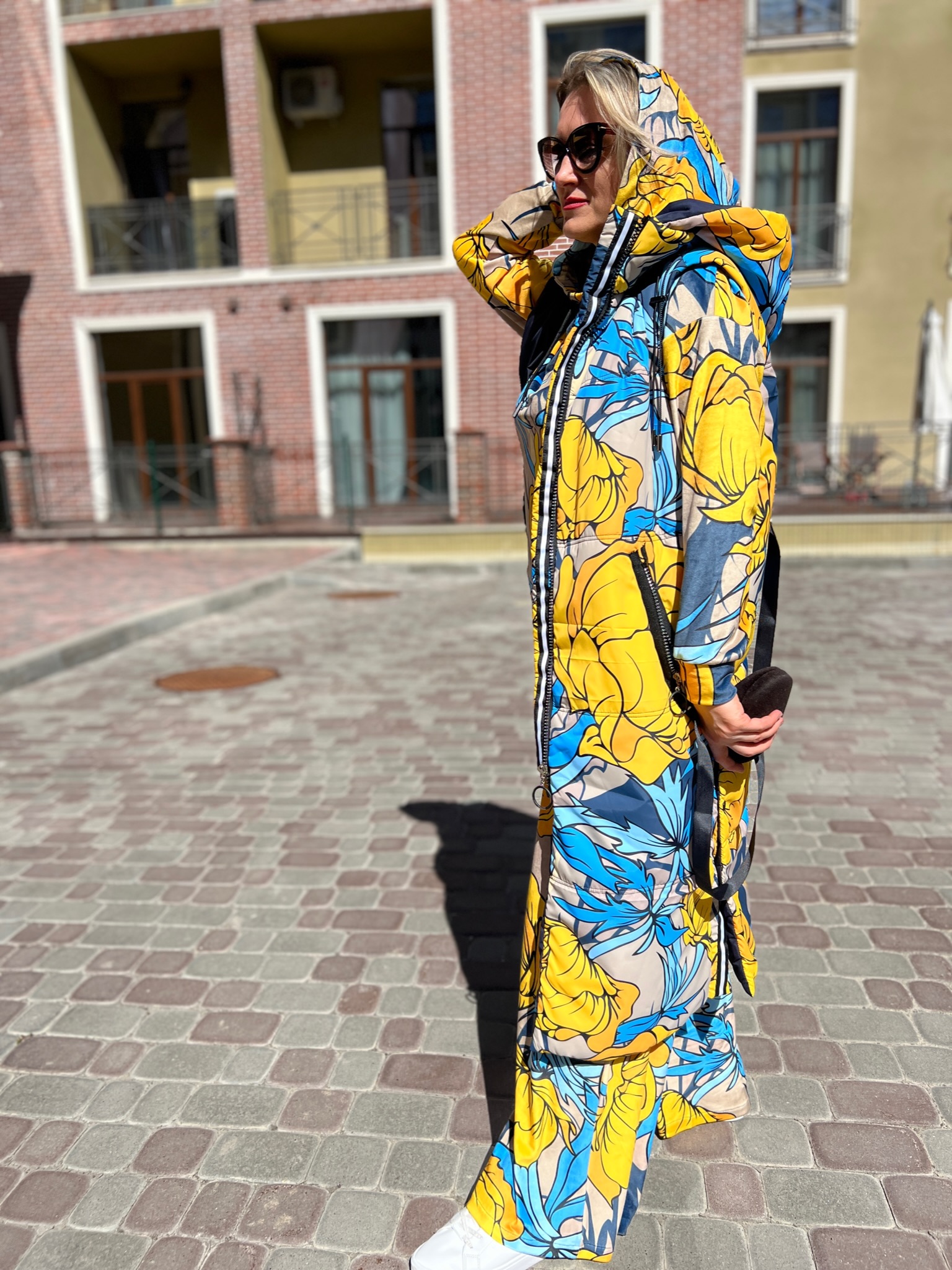Прямий крій, застібується на блискавці, кишені, на блискавці, з обох сторін є розрізи на кнопках, капюшон на кнопках – зʼємний, доповнена декоративними елементами.