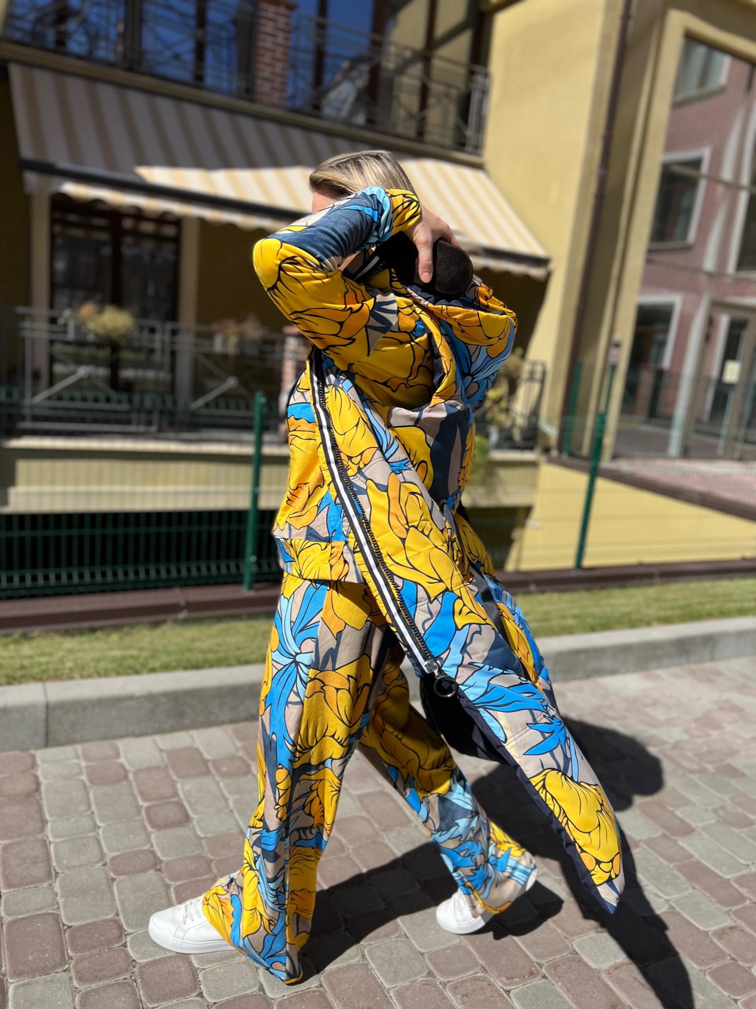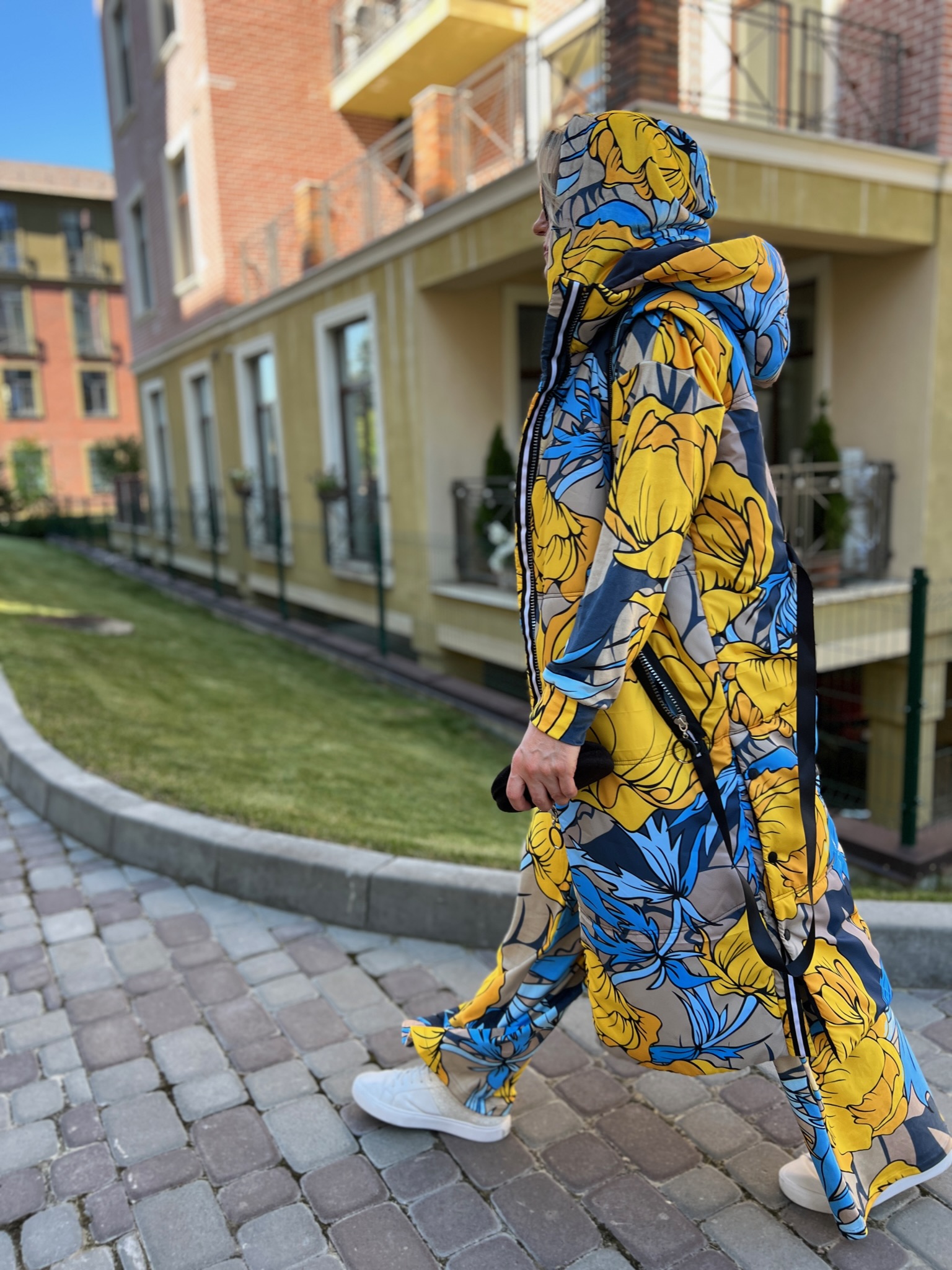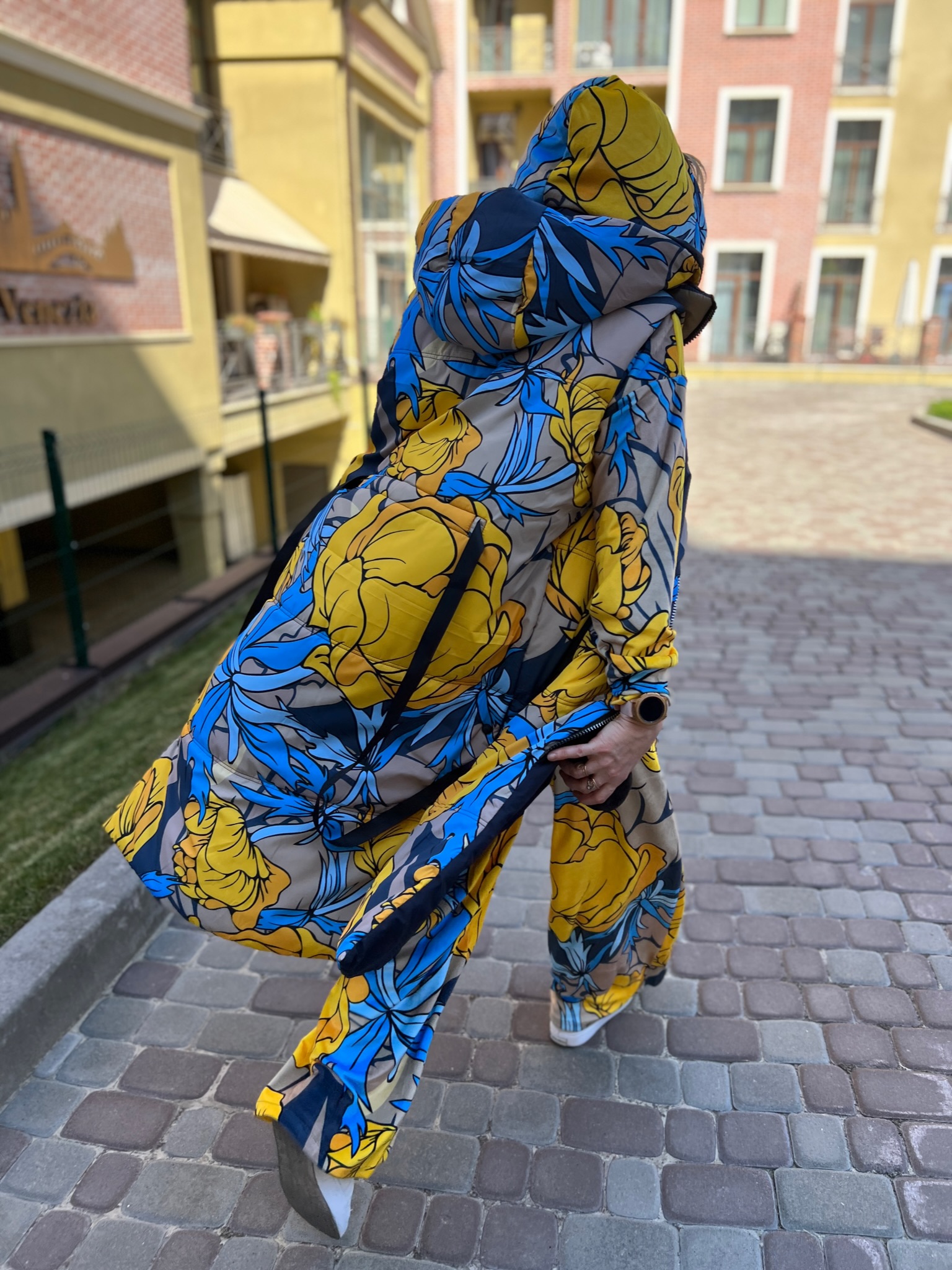 Прямий крій, застібується на блискавці, кишені, на блискавці, з обох сторін є розрізи на кнопках, капюшон на кнопках – зʼємний, доповнена декоративними елементами.