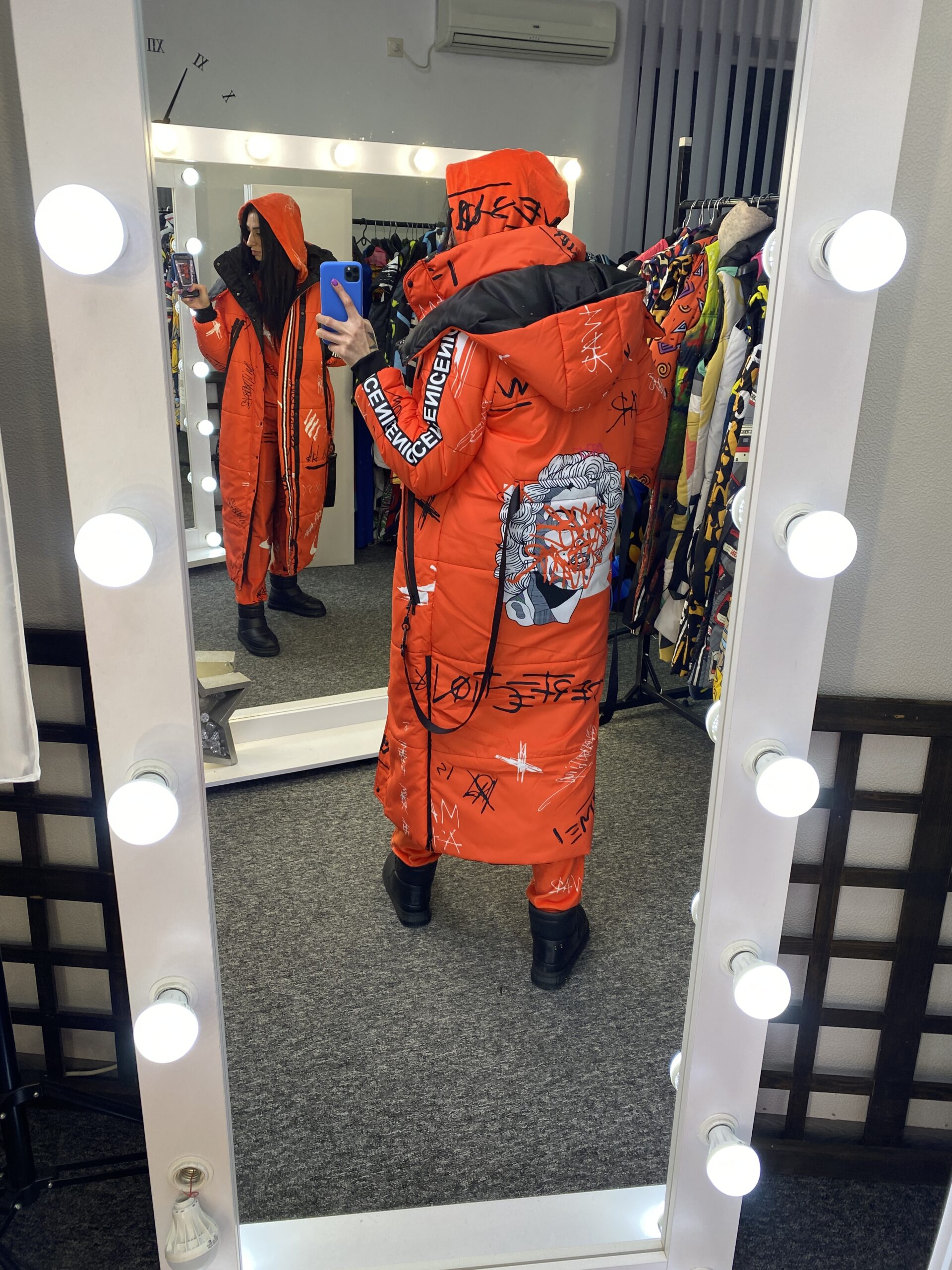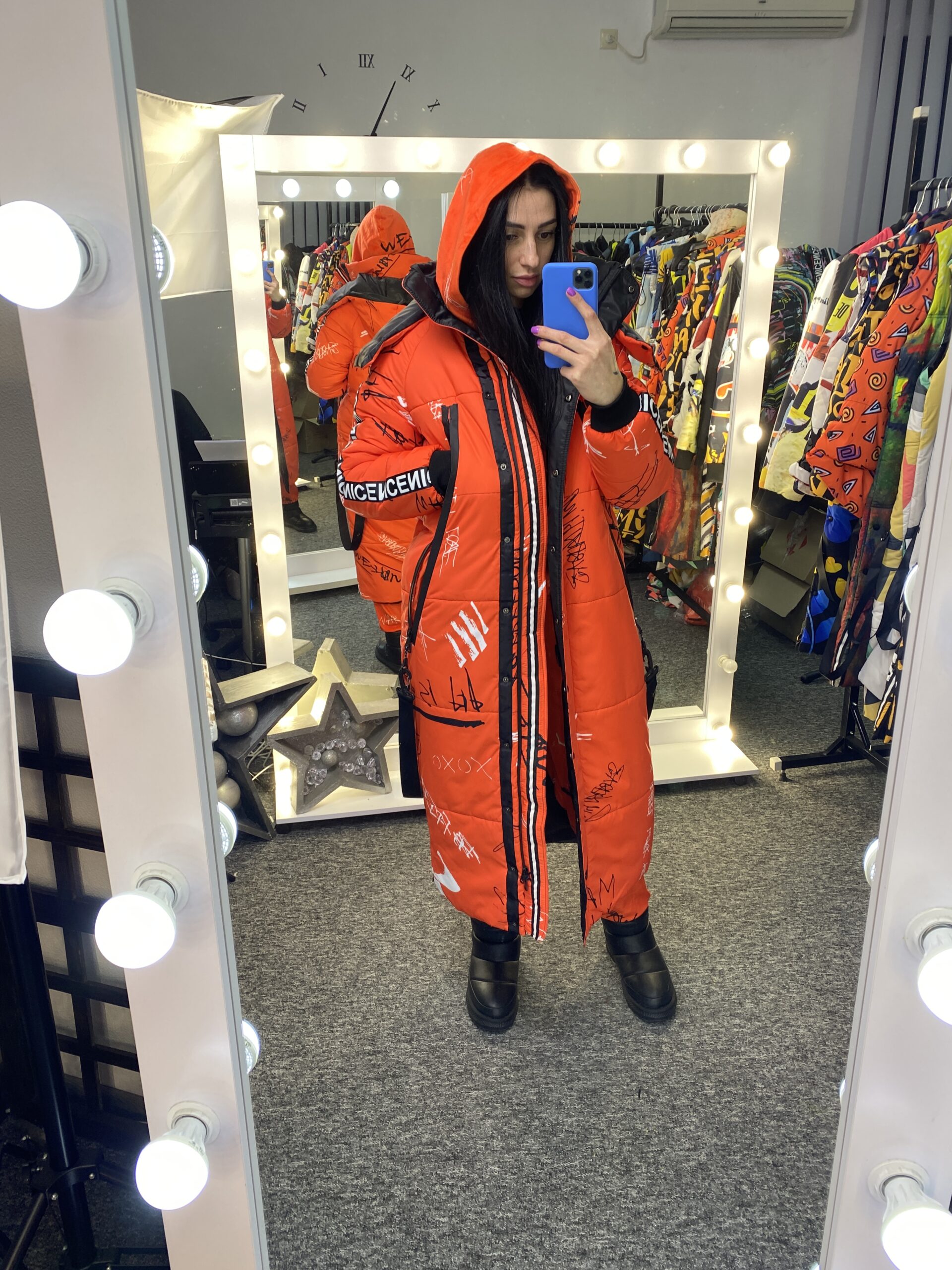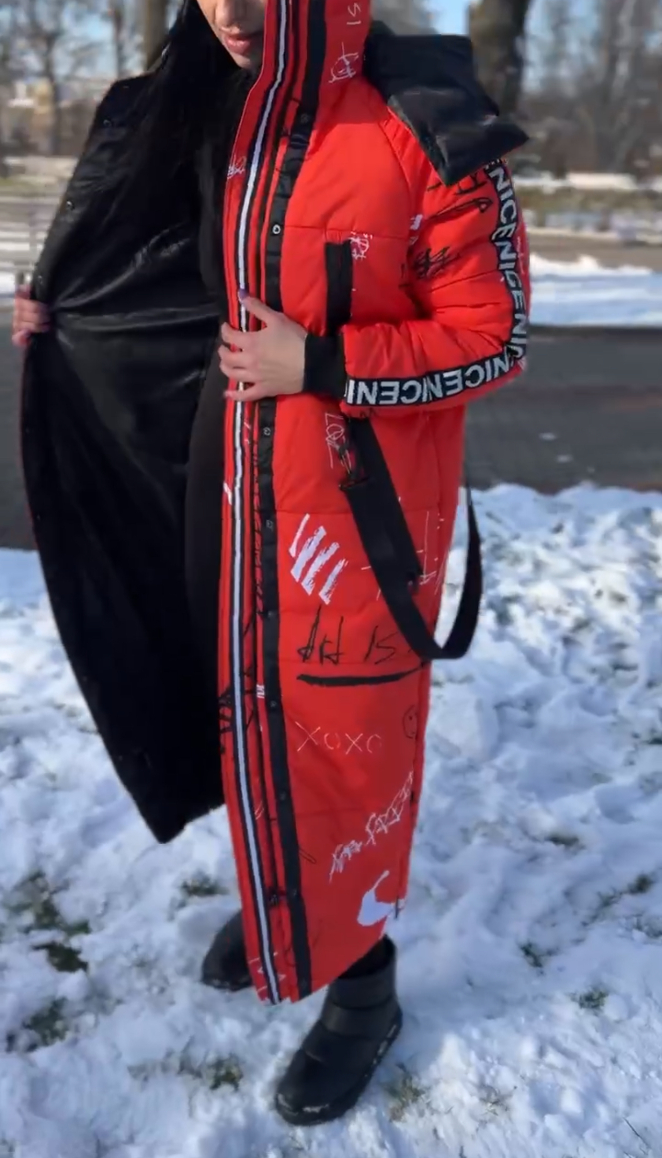 Прямий крій, блискавка двостороння – можна розстібати знизу, зверху планка із кнопками, рукава регланом, на манжетах, капюшон з’ємний: на кнопочках, є бокові розрізи, на блискавках, можна розстібати для зручності при хотьбі, є кишені по 2шт з обох сторін, всі блискавки прорезинені – захищають від дощу та снігу. Декорована стрічкою, яка застібається біля кишень, можна використовувати як пасок. Довжина 127 см, довжина рукава по зовнішньому шву від горловини 77 см, температурний режим до -20 градусів.