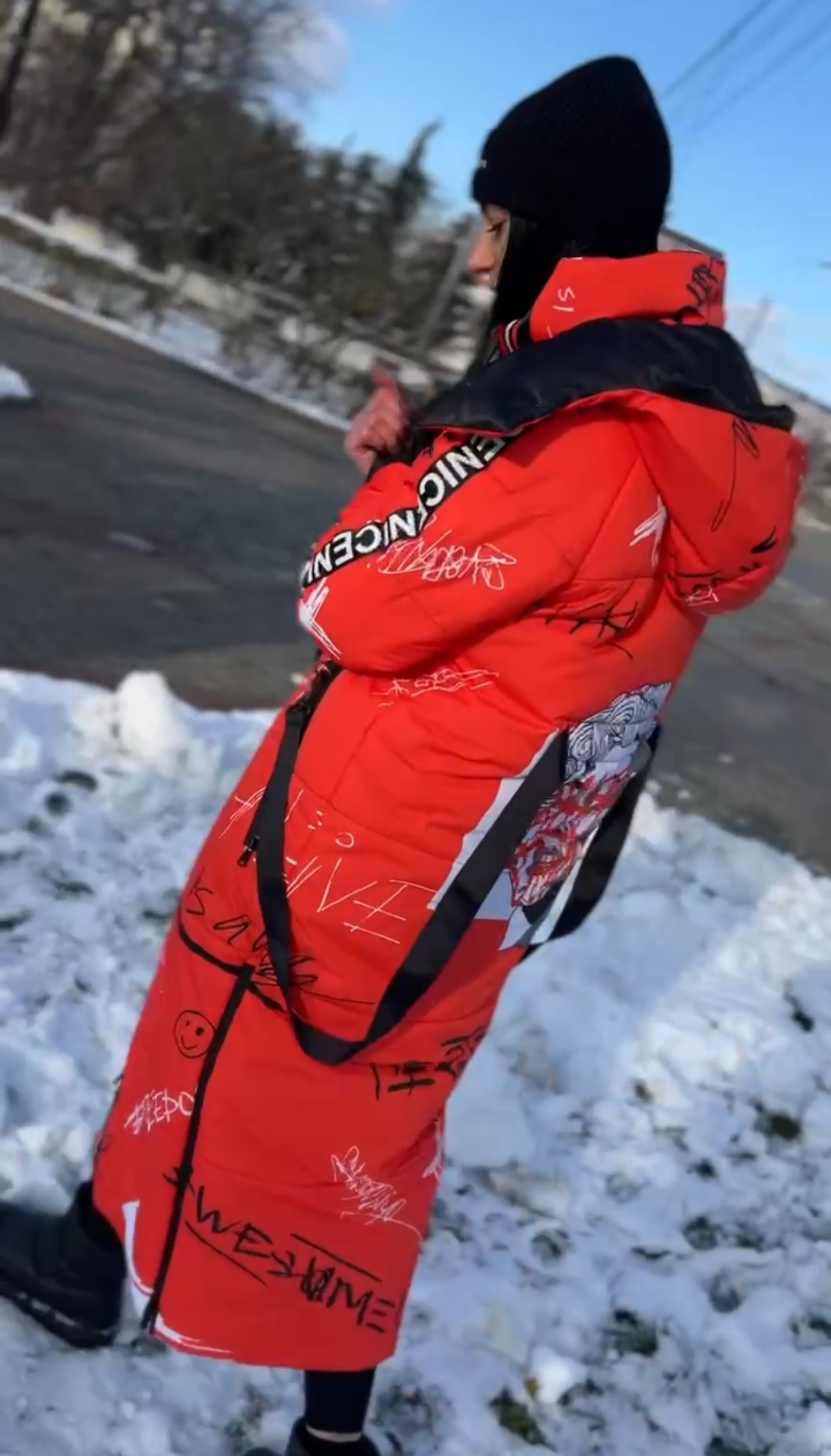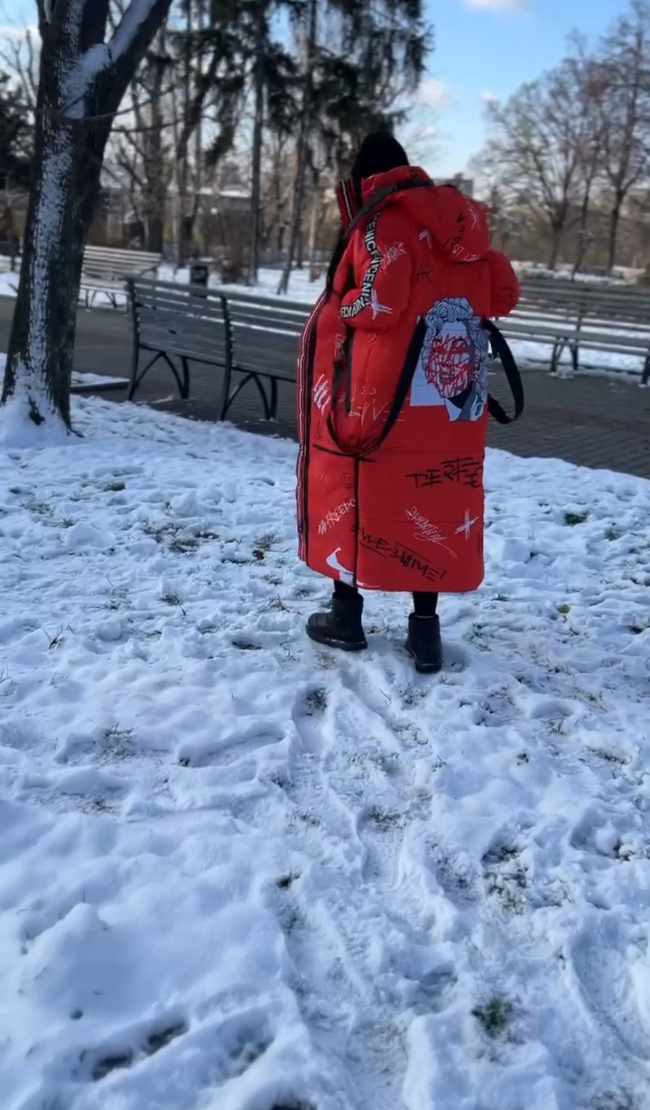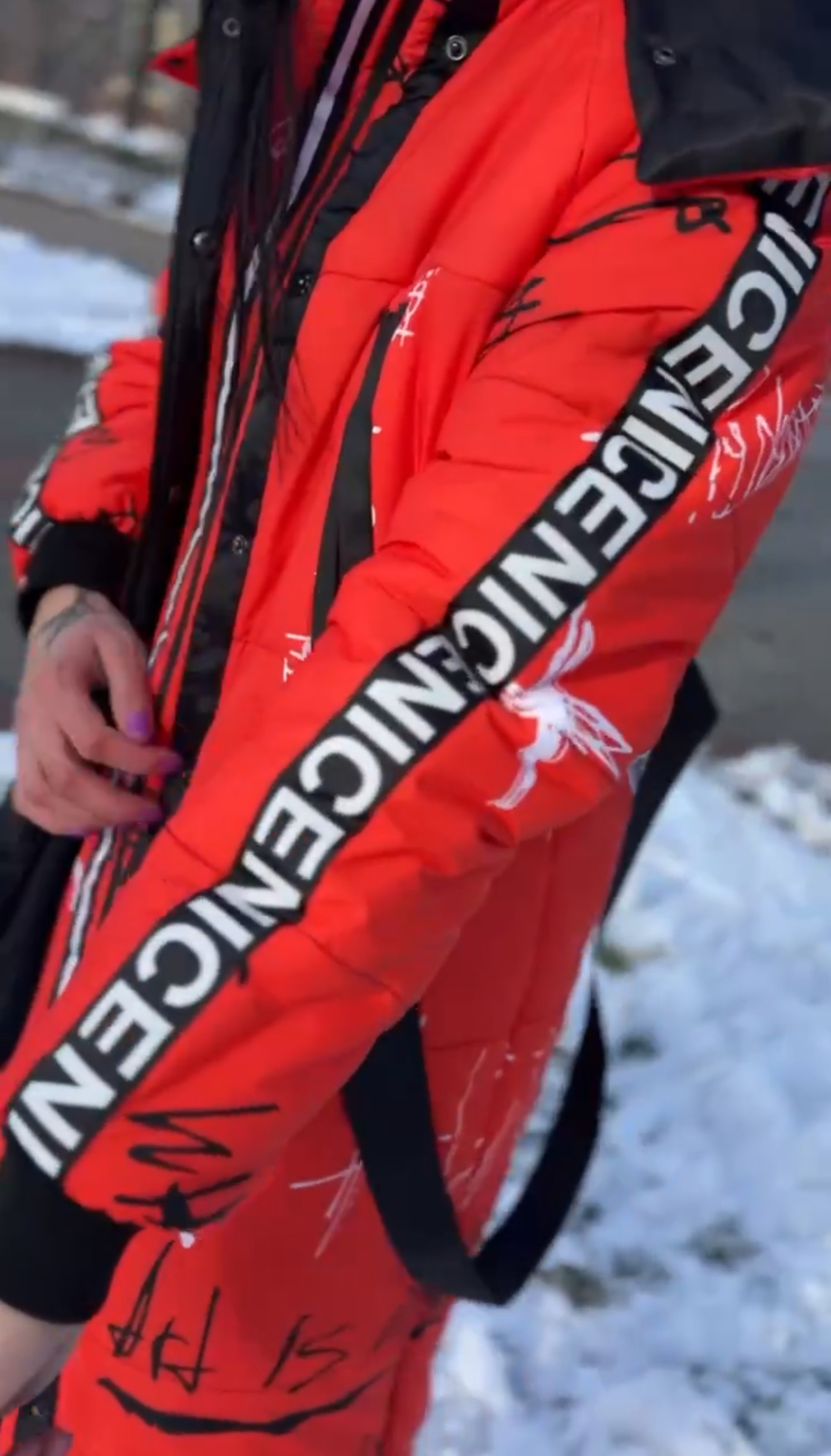 Прямий крій, блискавка двостороння – можна розстібати знизу, зверху планка із кнопками, рукава регланом, на манжетах, капюшон з’ємний: на кнопочках, є бокові розрізи, на блискавках, можна розстібати для зручності при хотьбі, є кишені по 2шт з обох сторін, всі блискавки прорезинені – захищають від дощу та снігу. Декорована стрічкою, яка застібається біля кишень, можна використовувати як пасок. Довжина 127 см, довжина рукава по зовнішньому шву від горловини 77 см, температурний режим до -20 градусів.